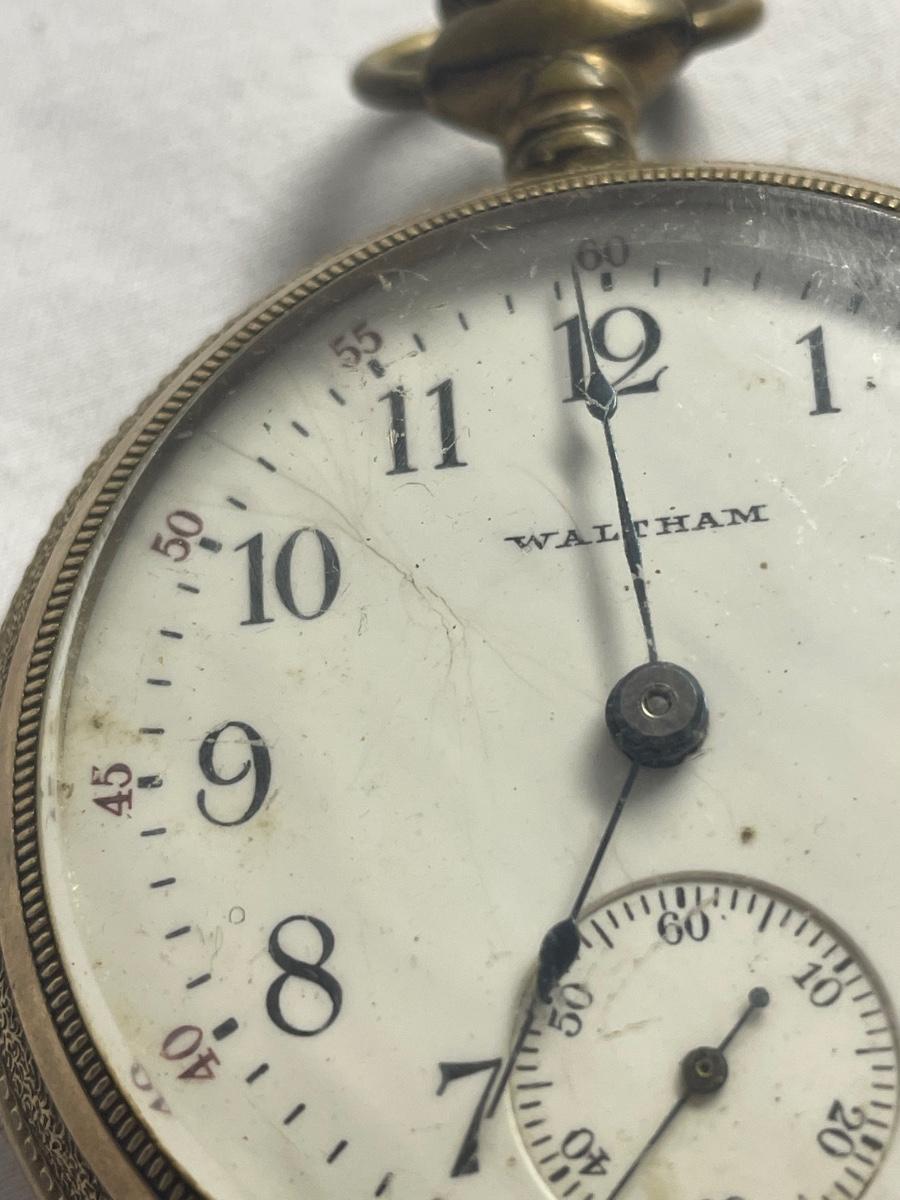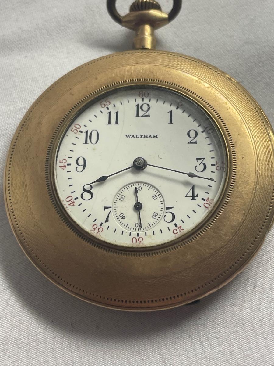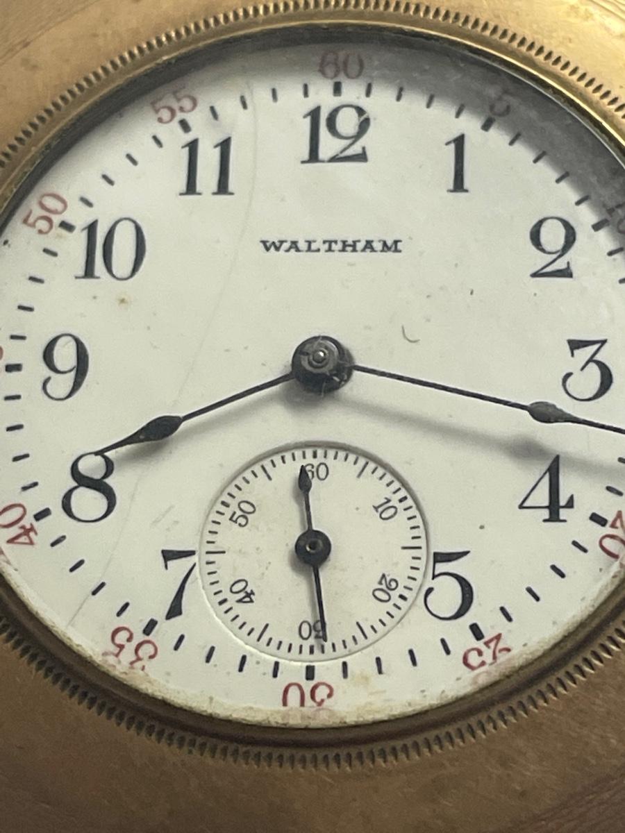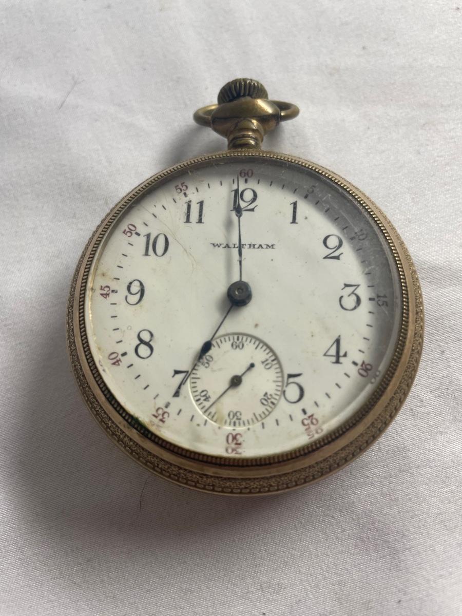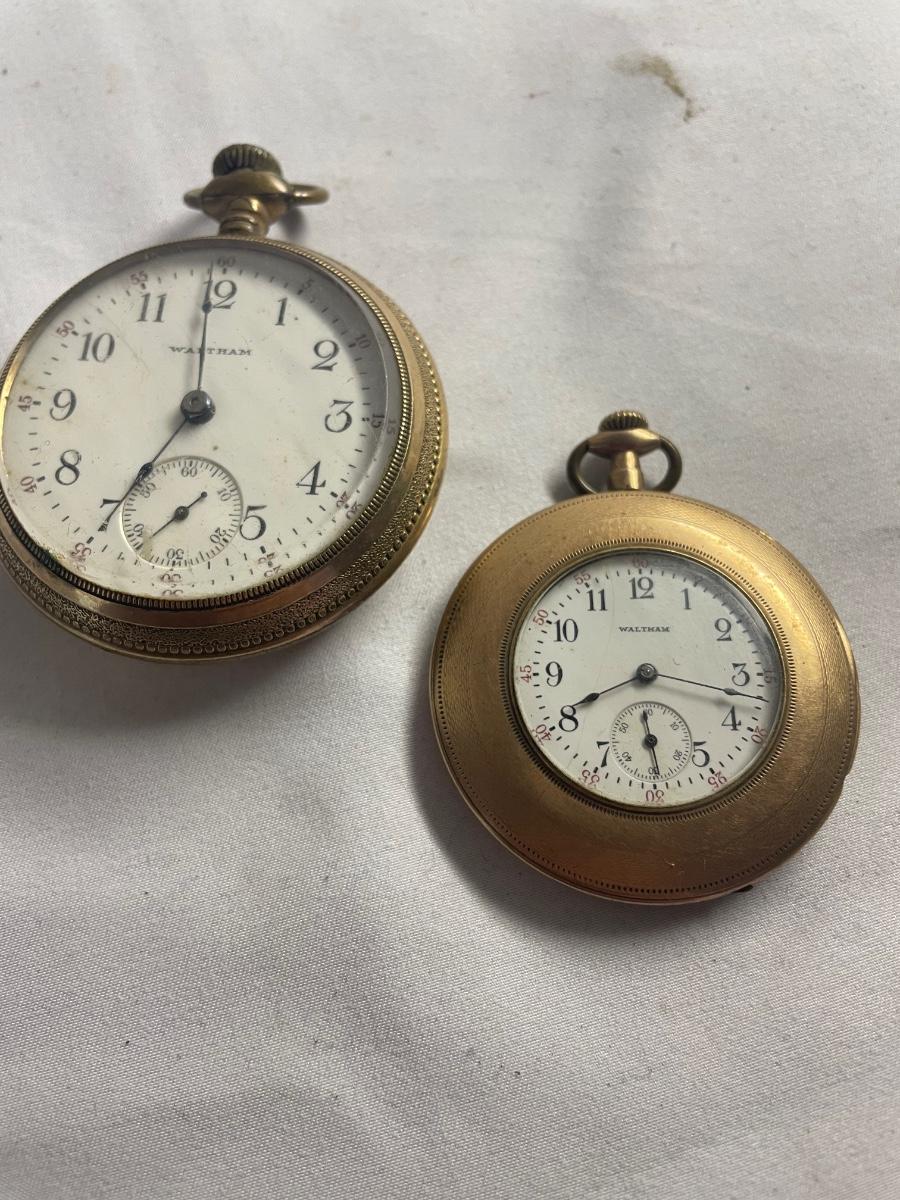 These 2 gold colored pocket watches are both Waltham (no marks were found as to the material of the metal) and in good condition but neither are currently running. The larger watch has some small areas of oxidation on the metal and we were not able to find how to open it; it measures 2” d.