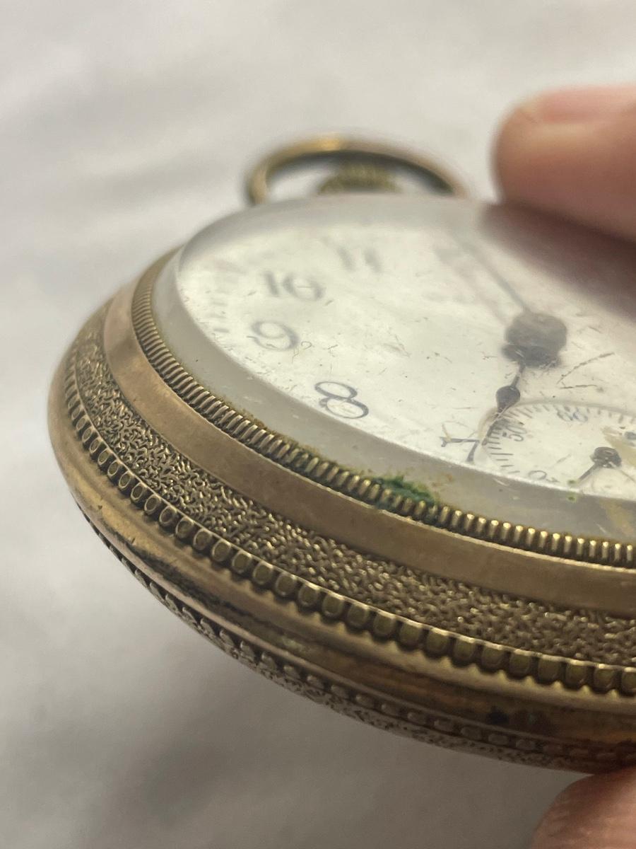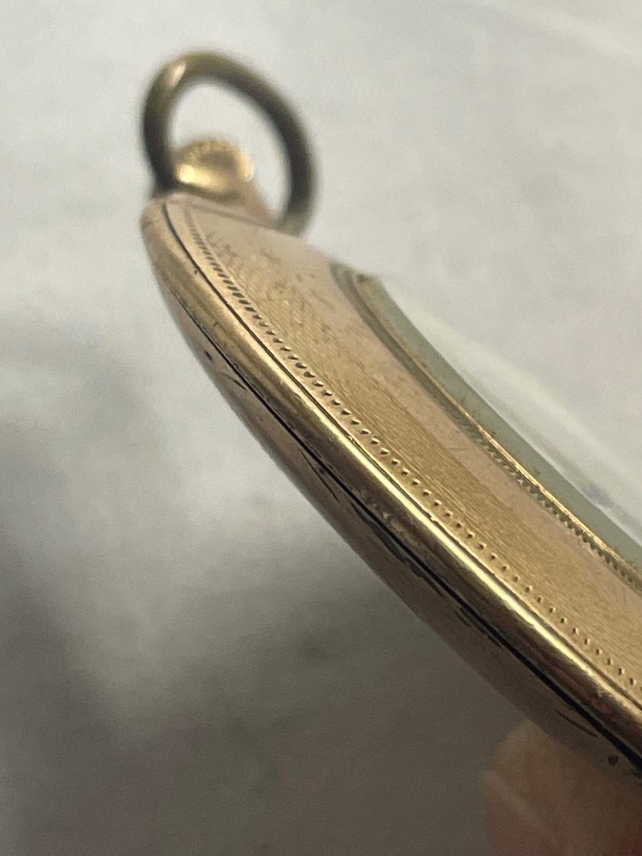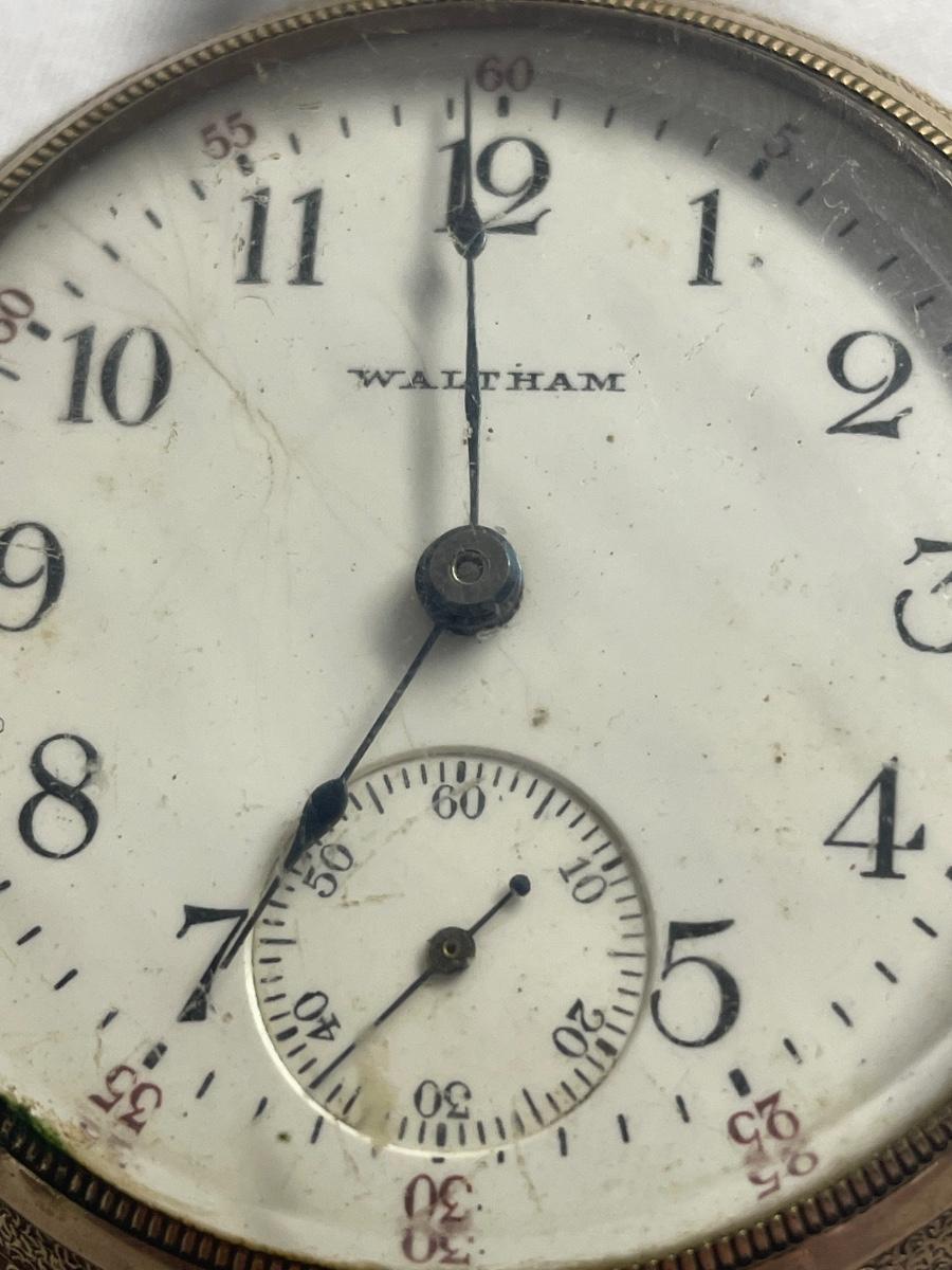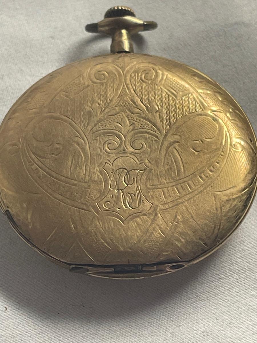 These 2 gold colored pocket watches are both Waltham (no marks were found as to the material of the metal) and in good condition but neither are currently running. The larger watch has some small areas of oxidation on the metal and we were not able to find how to open it; it measures 2” d.