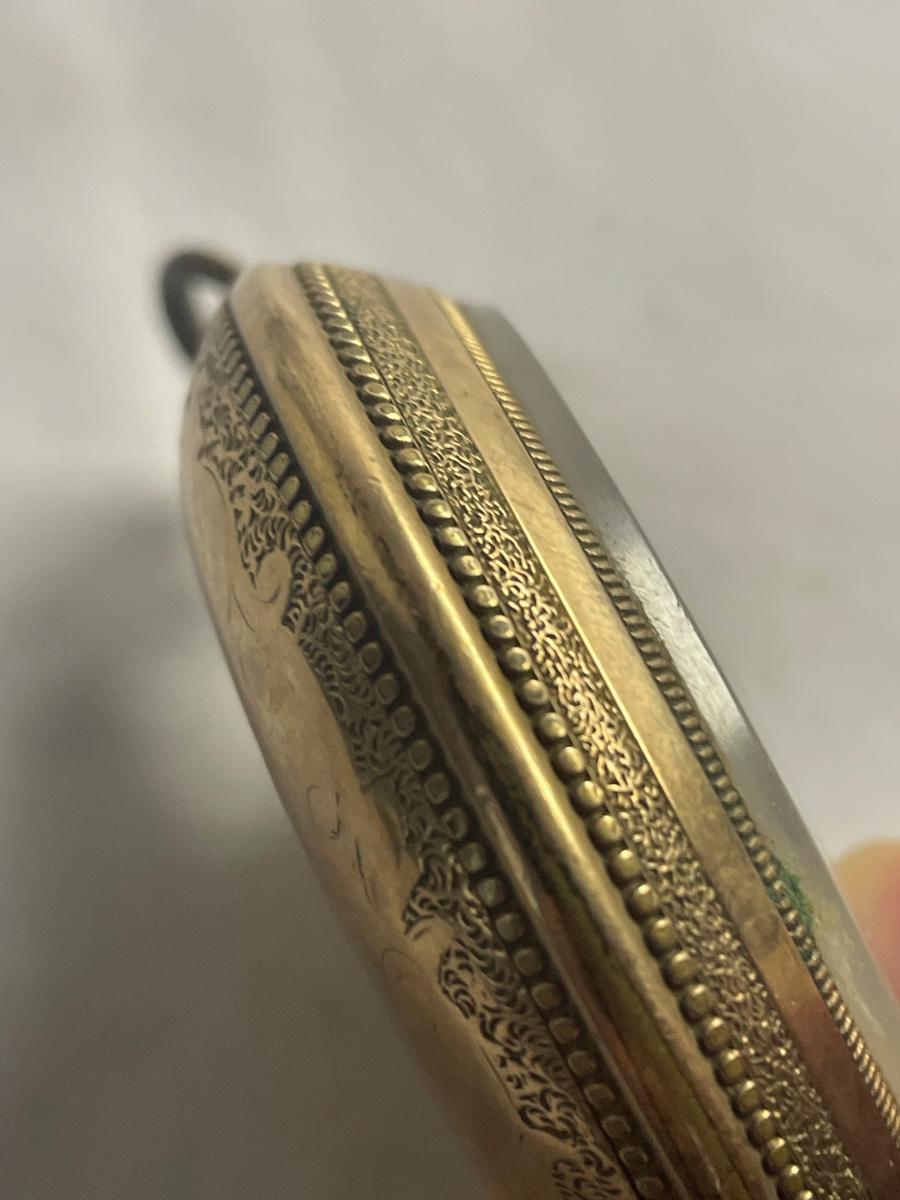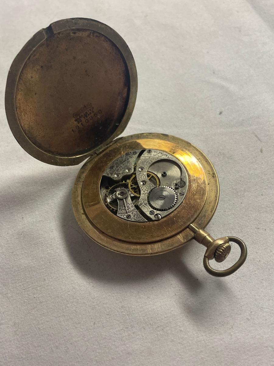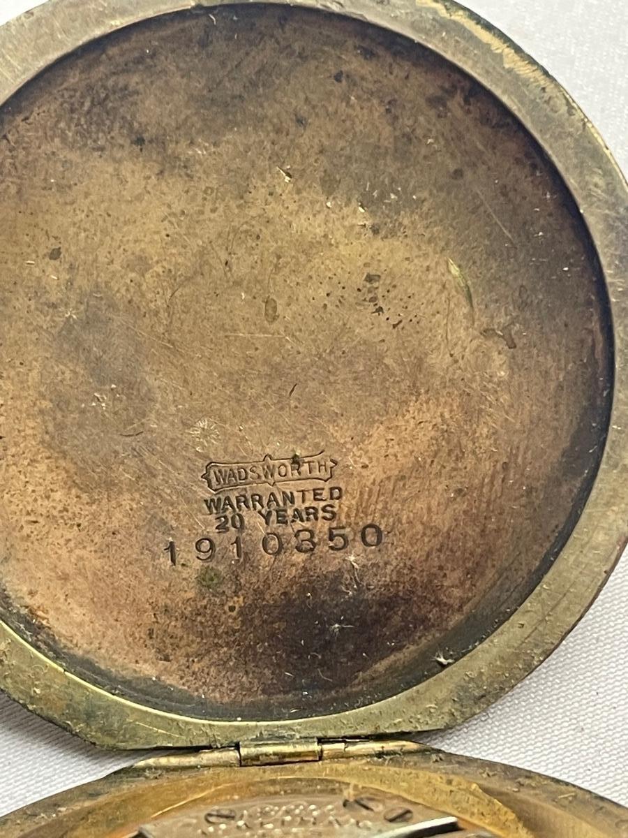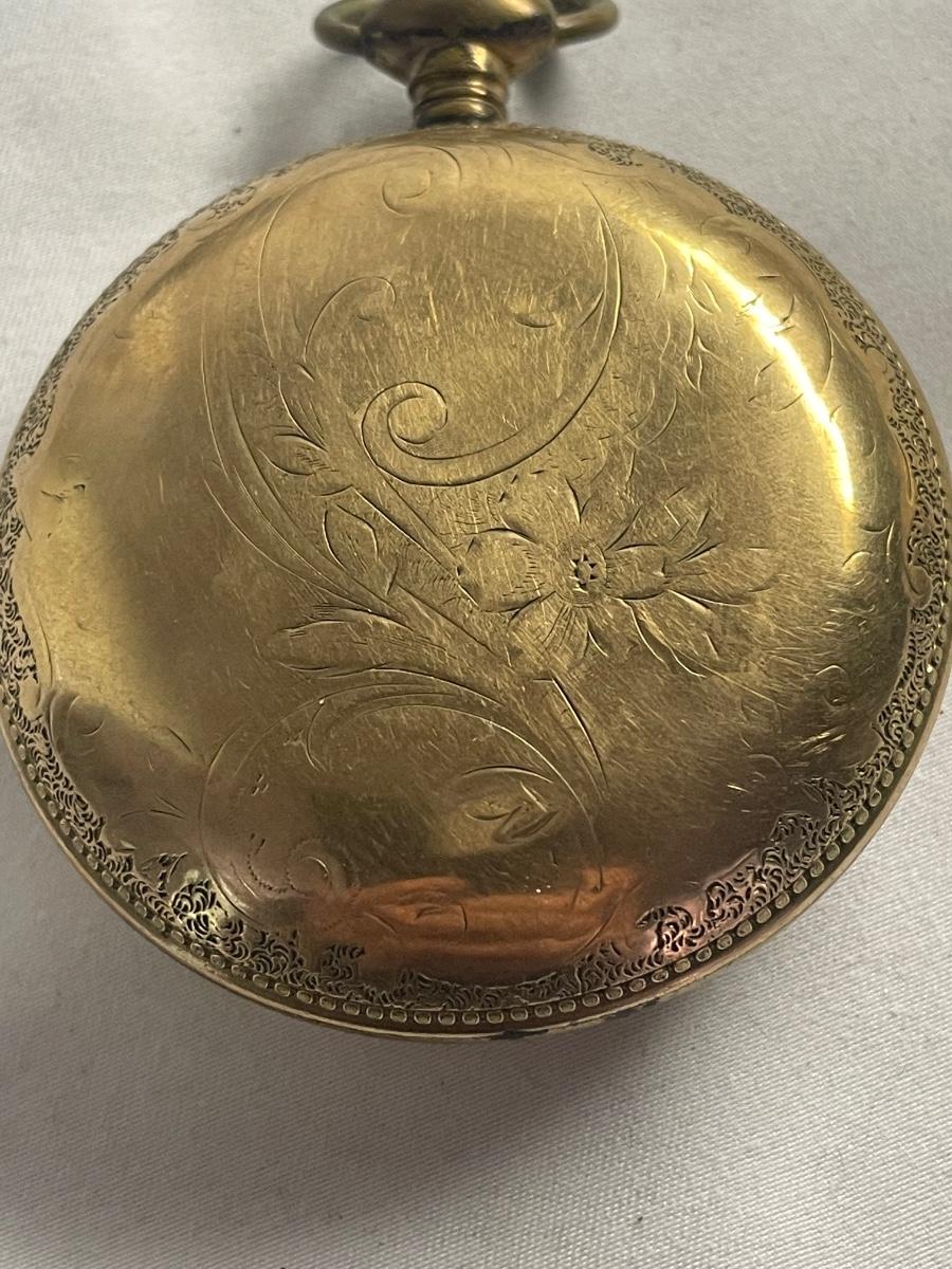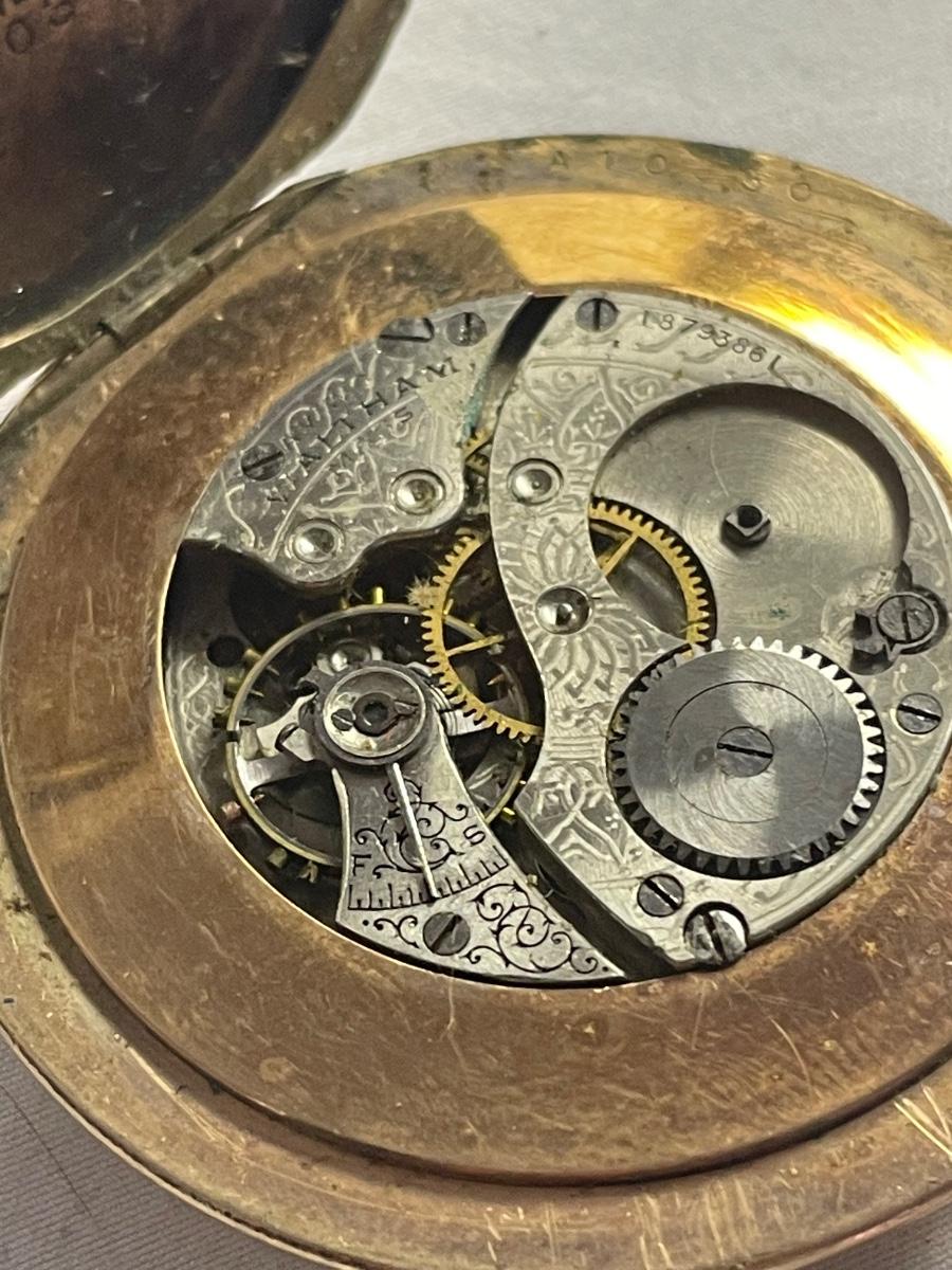 These 2 gold colored pocket watches are both Waltham (no marks were found as to the material of the metal) and in good condition but neither are currently running. The larger watch has some small areas of oxidation on the metal and we were not able to find how to open it; it measures 2” d.