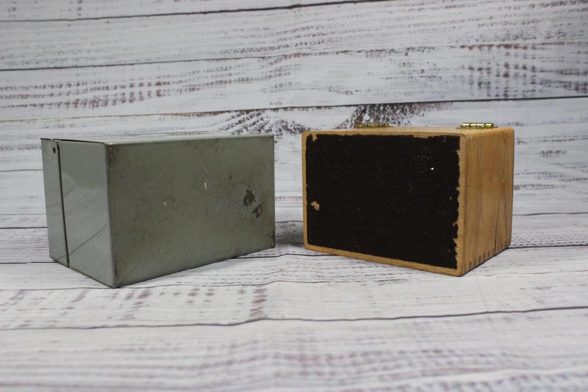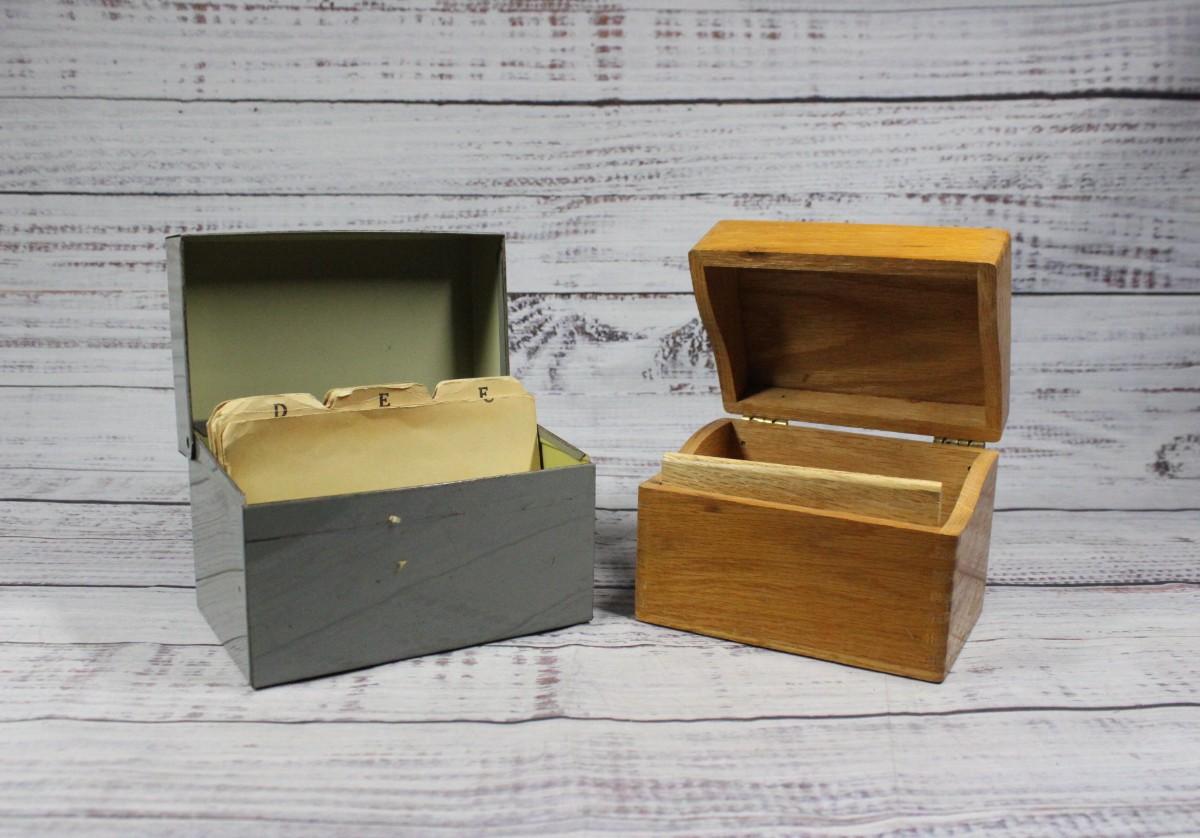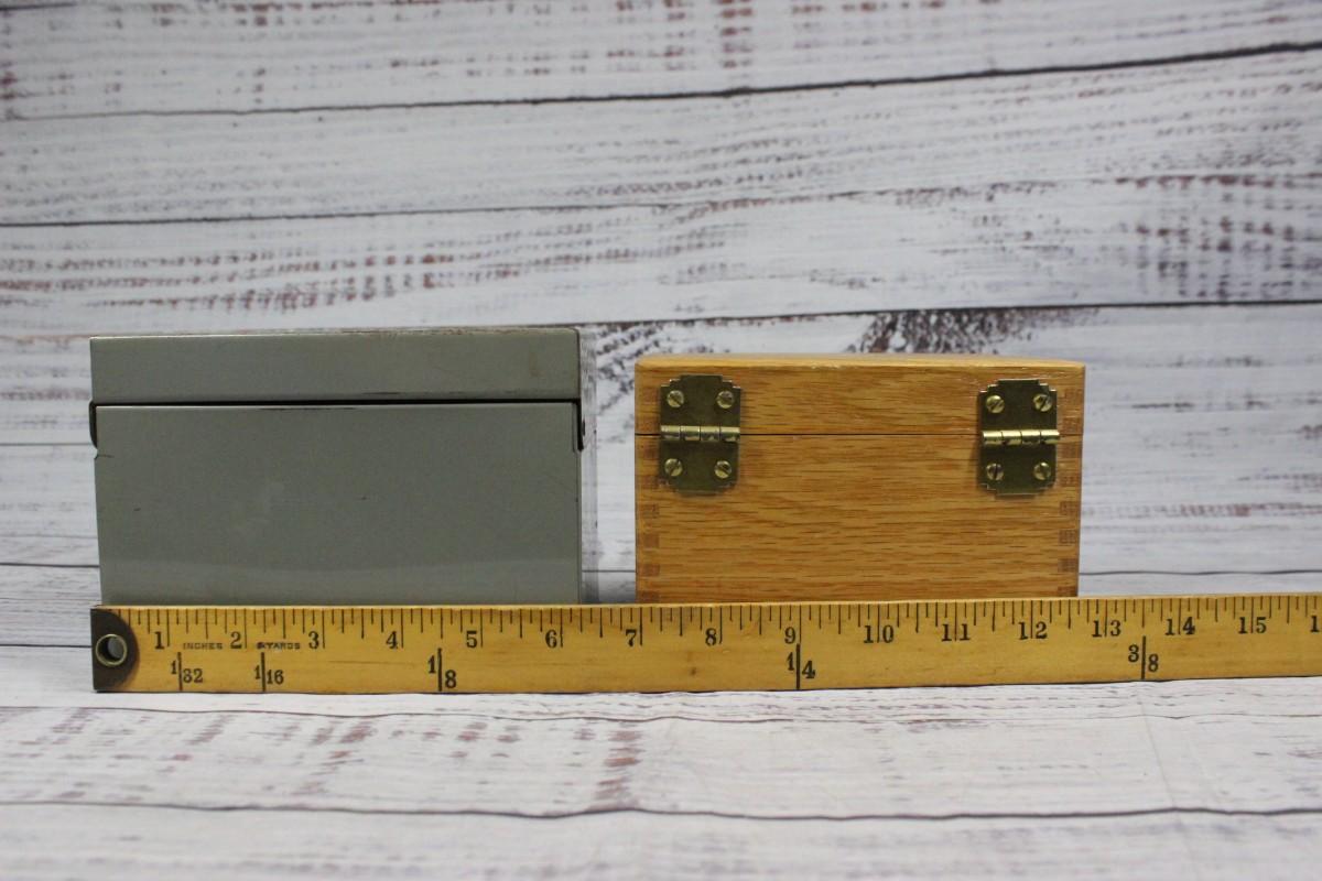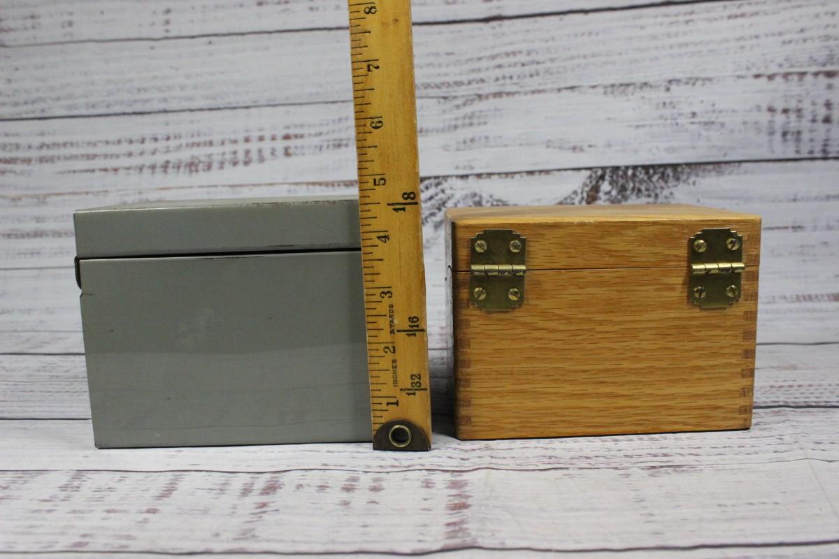 Pair of Vintage Wood and Metal Index Card File Organizers, there is no significant damage to any of the pieces and is in good condition. The metal organizer comes with some dividers. Check pictures for more details and for sizing.