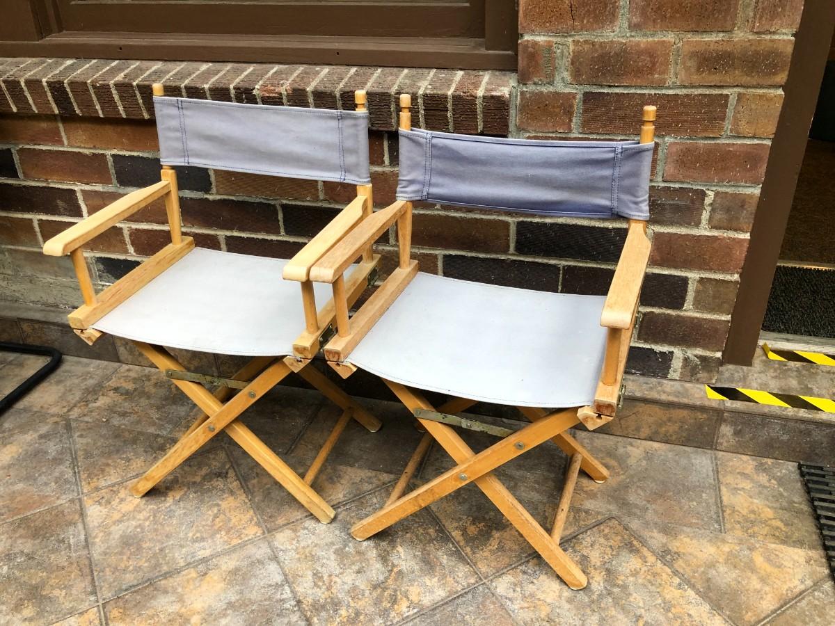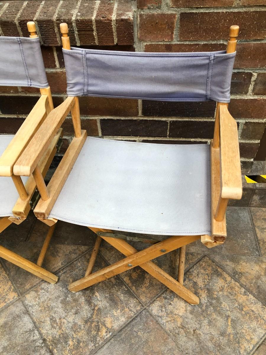 Pair of Vintage Wood and Blue Fabric Director Chairs. Folding Director's Chairs. In good/fair condition, with signs of wear from age.