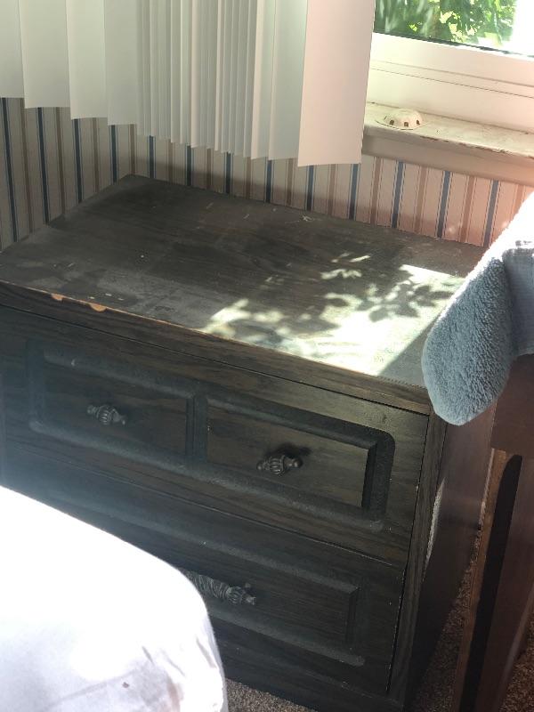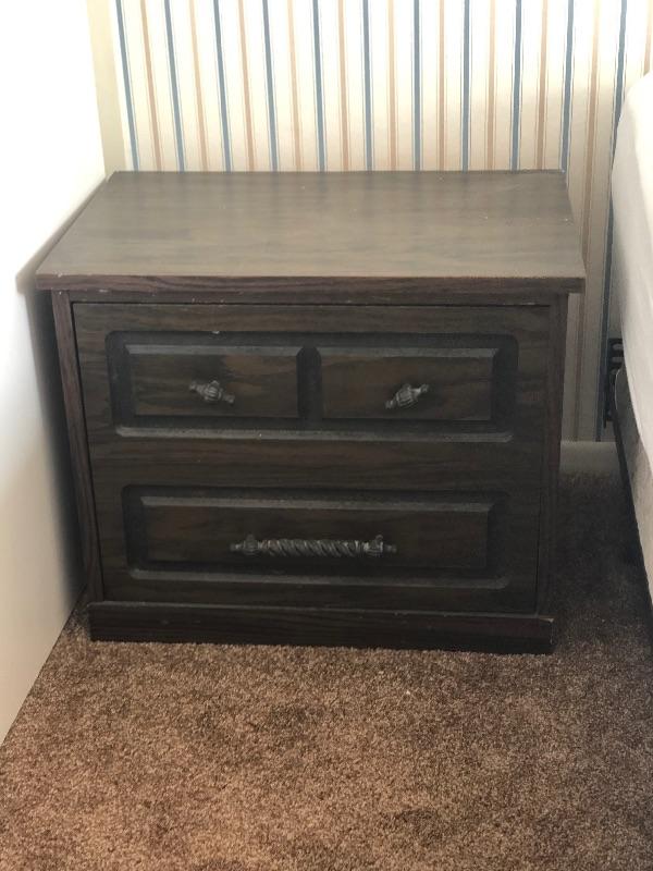 Pair of 2 drawer vintage night stands. Dark finish. Signs of wear along edges. Measure 24" wide by 20" tall. 16" deep.