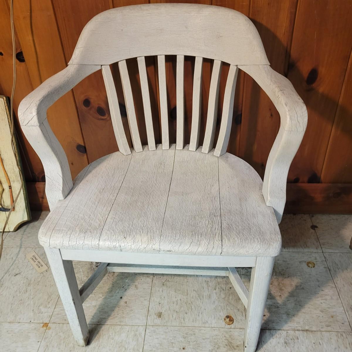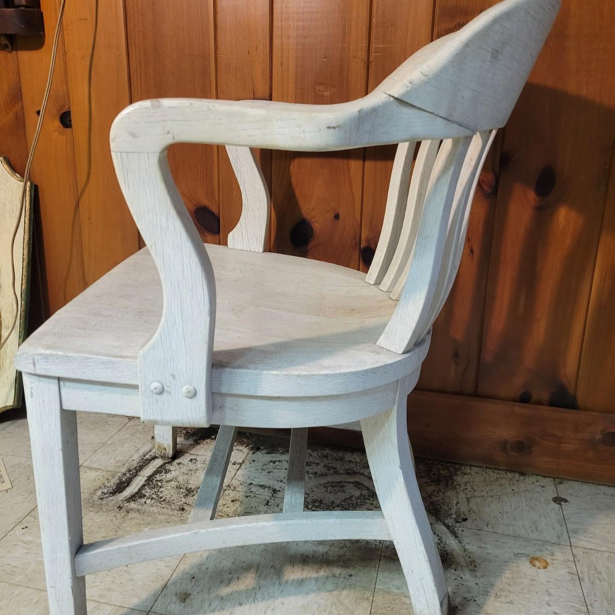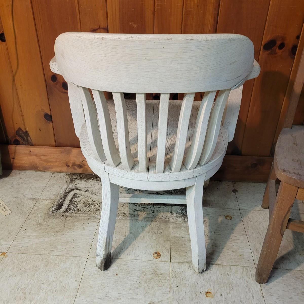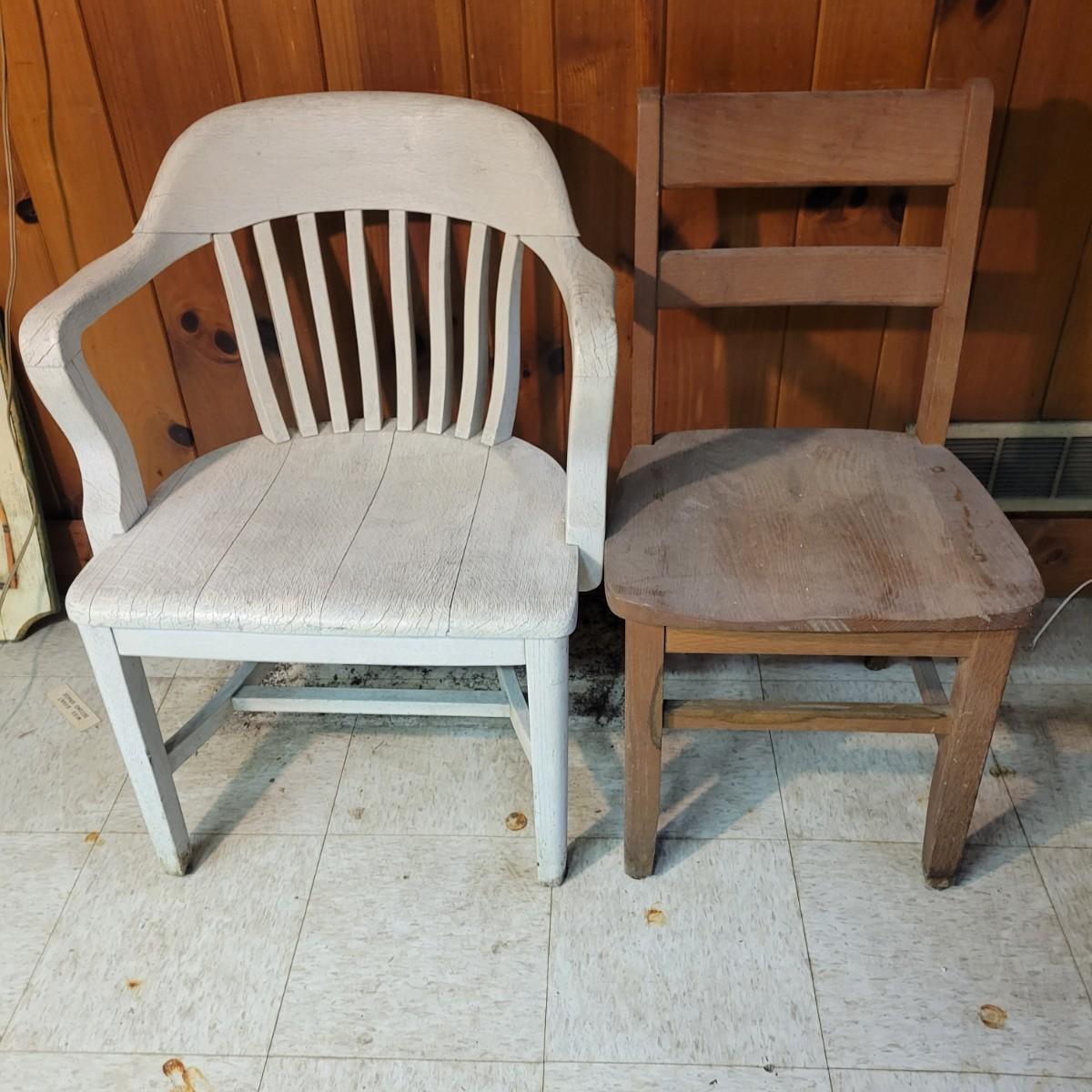 A pair of vintage solid wood chairs in good condition. The white chair does have some gaping at various joints, but has good bones and is a unique office chair. The stained oak chair has no notable damage. The white chair measures approximately 24" x 23" x 32" with a seat height of 18" Local pickup only