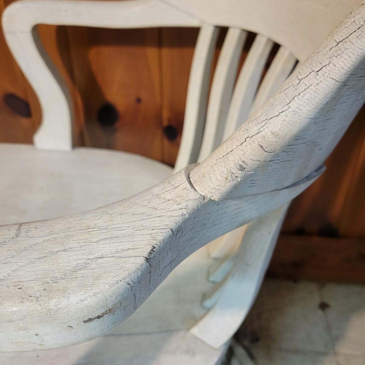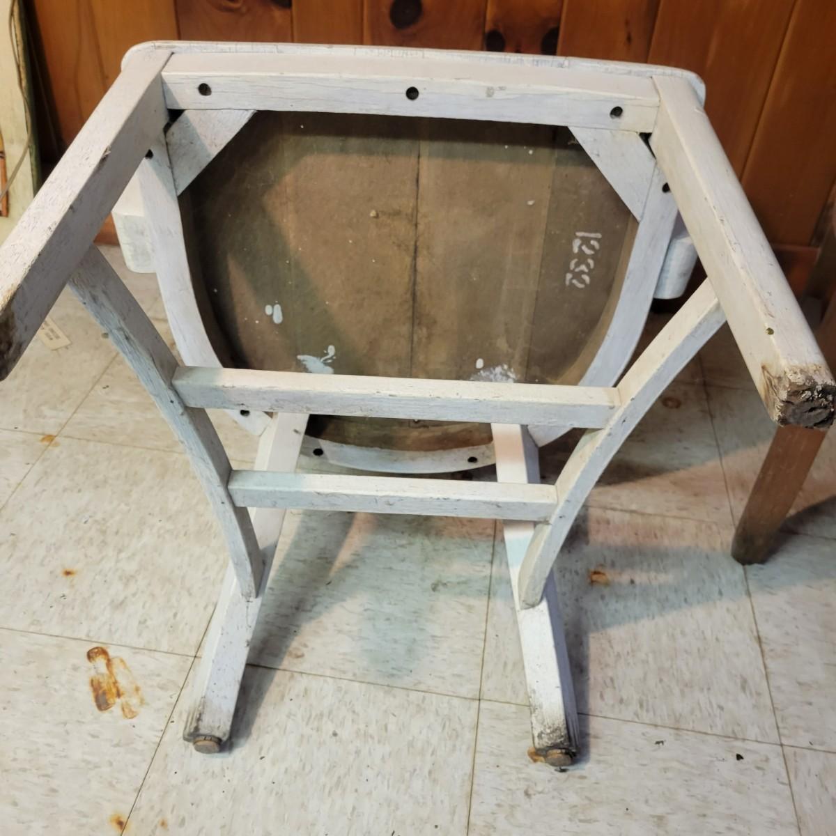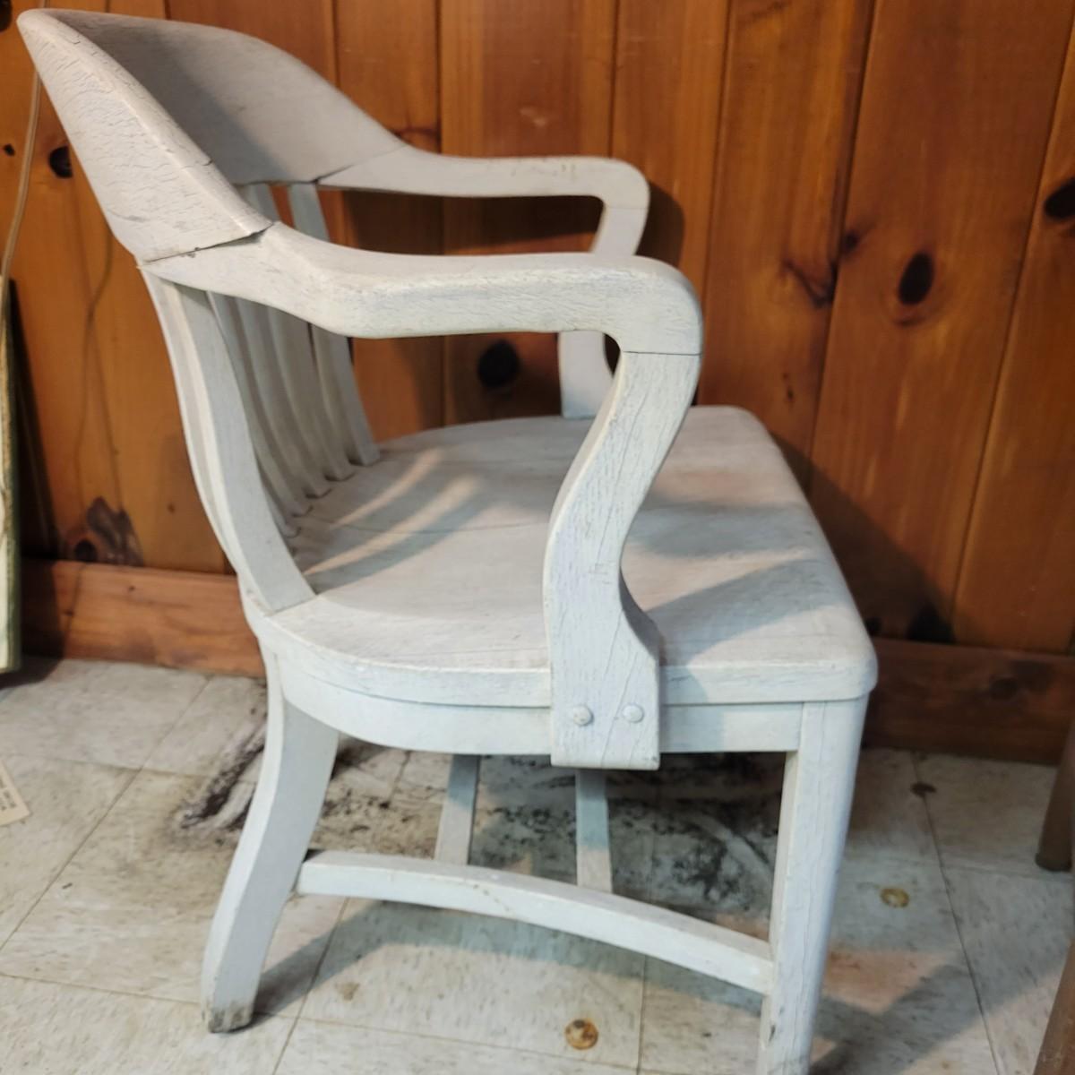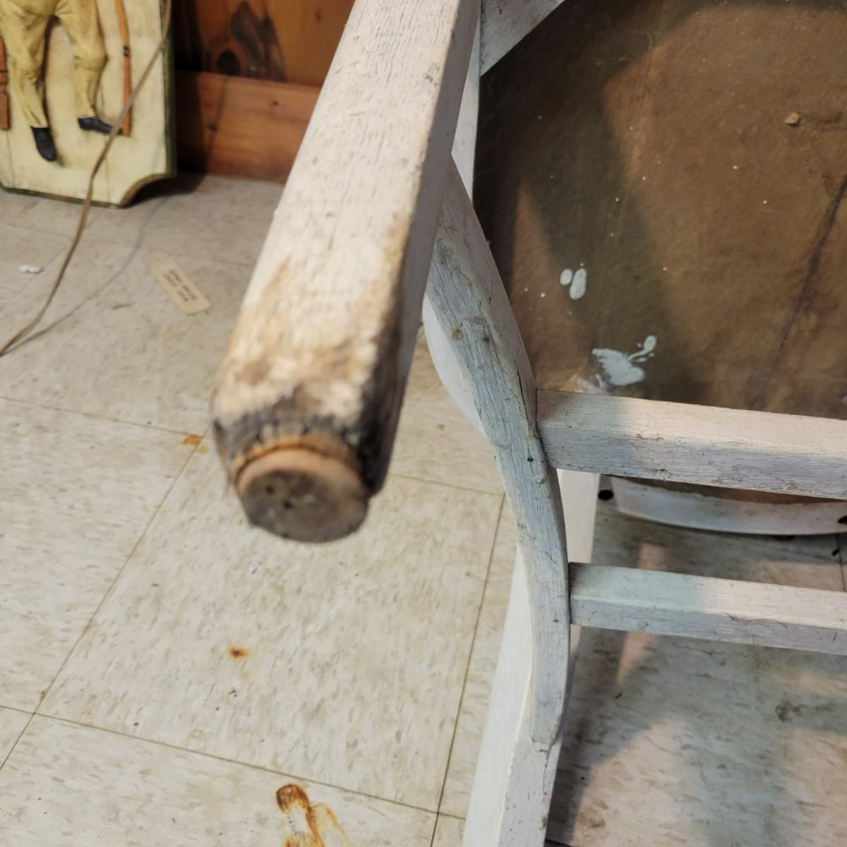 A pair of vintage solid wood chairs in good condition. The white chair does have some gaping at various joints, but has good bones and is a unique office chair. The stained oak chair has no notable damage. The white chair measures approximately 24" x 23" x 32" with a seat height of 18" Local pickup only
