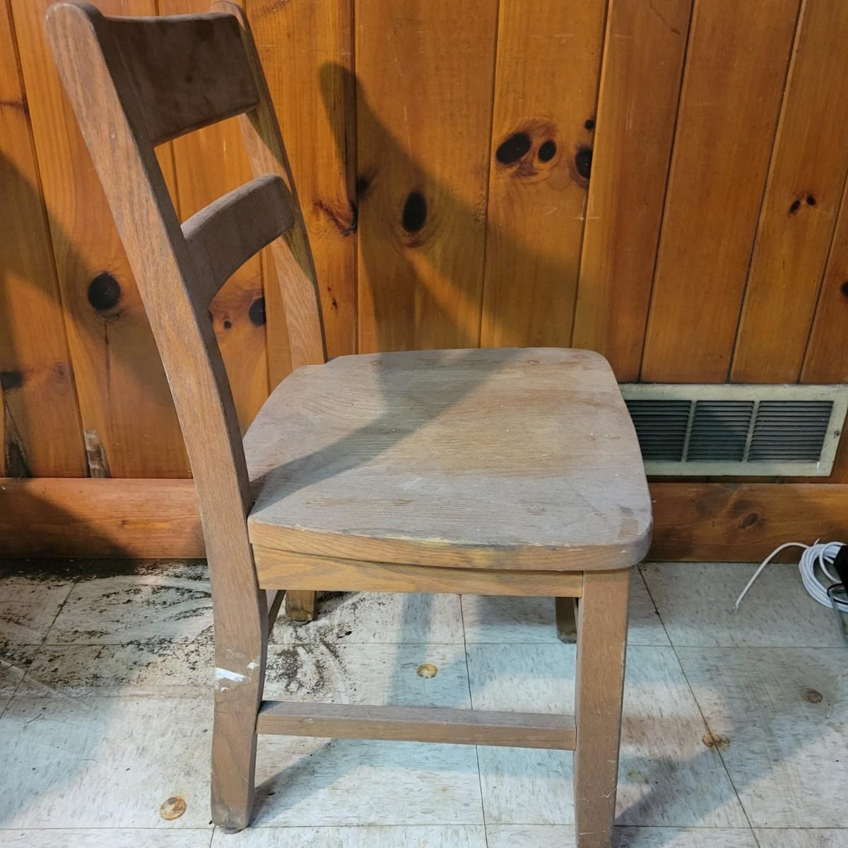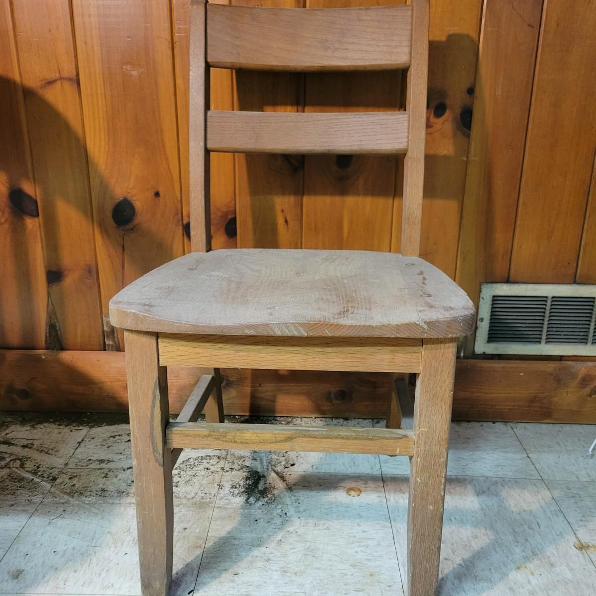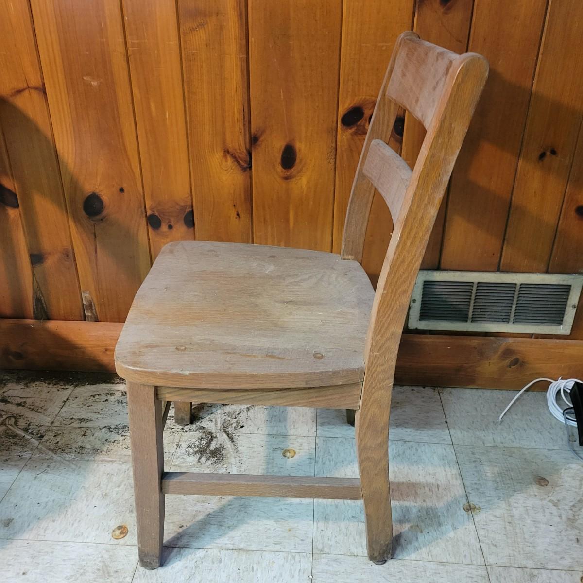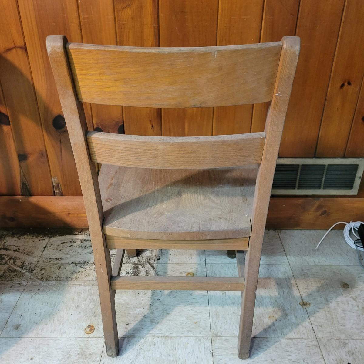 A pair of vintage solid wood chairs in good condition. The white chair does have some gaping at various joints, but has good bones and is a unique office chair. The stained oak chair has no notable damage. The white chair measures approximately 24" x 23" x 32" with a seat height of 18" Local pickup only