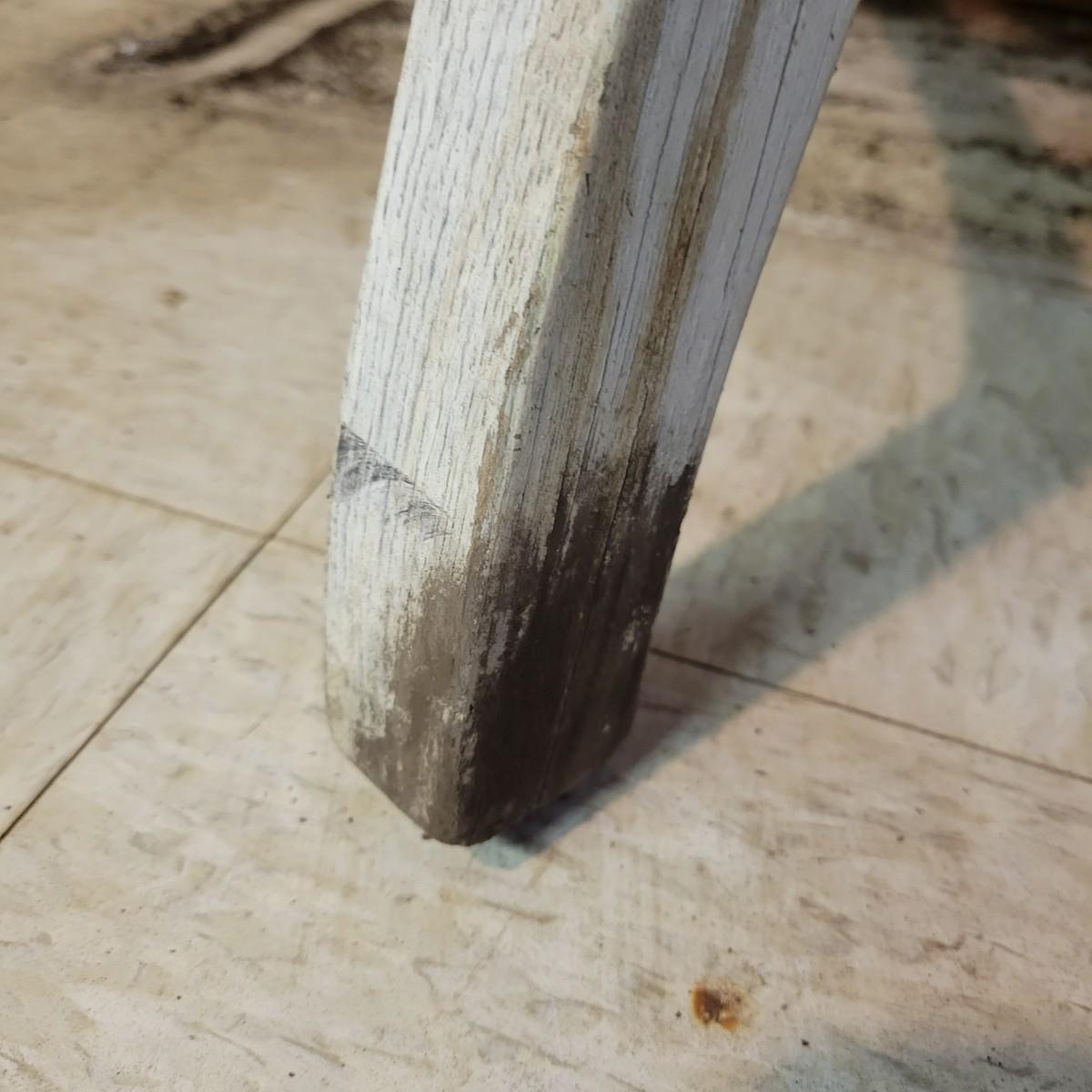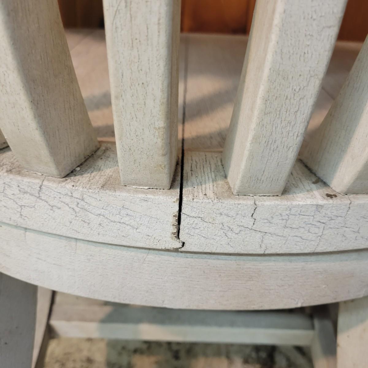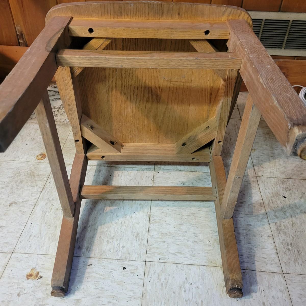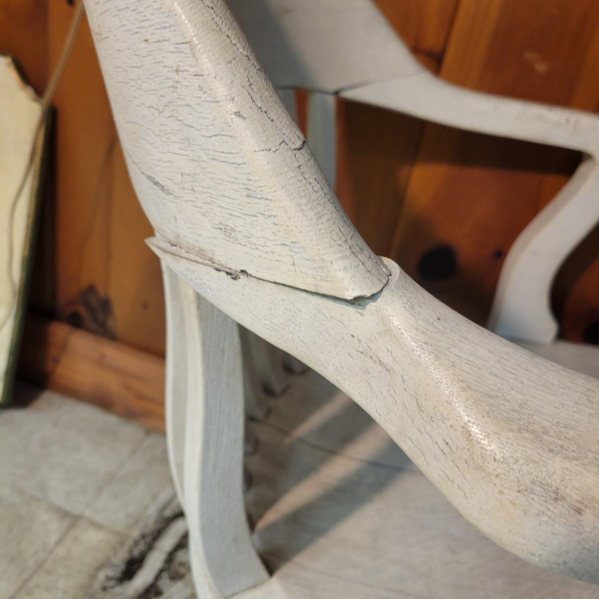 A pair of vintage solid wood chairs in good condition. The white chair does have some gaping at various joints, but has good bones and is a unique office chair. The stained oak chair has no notable damage. The white chair measures approximately 24" x 23" x 32" with a seat height of 18" Local pickup only