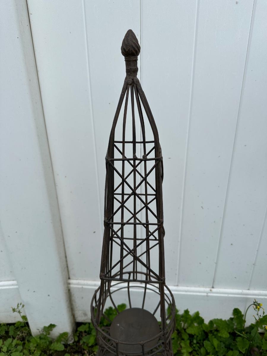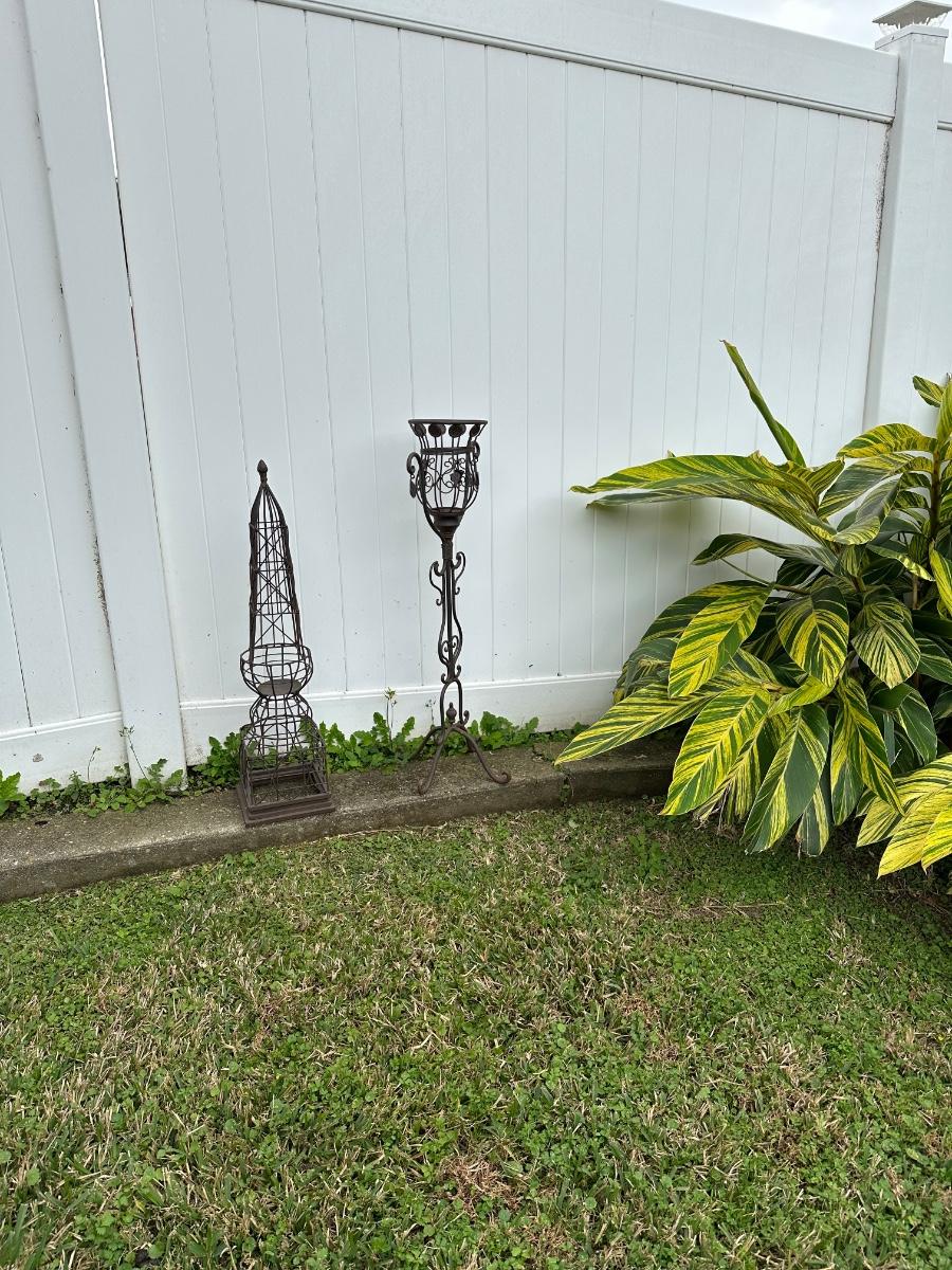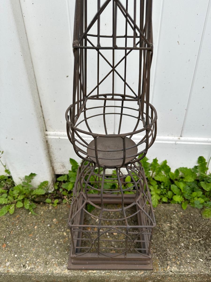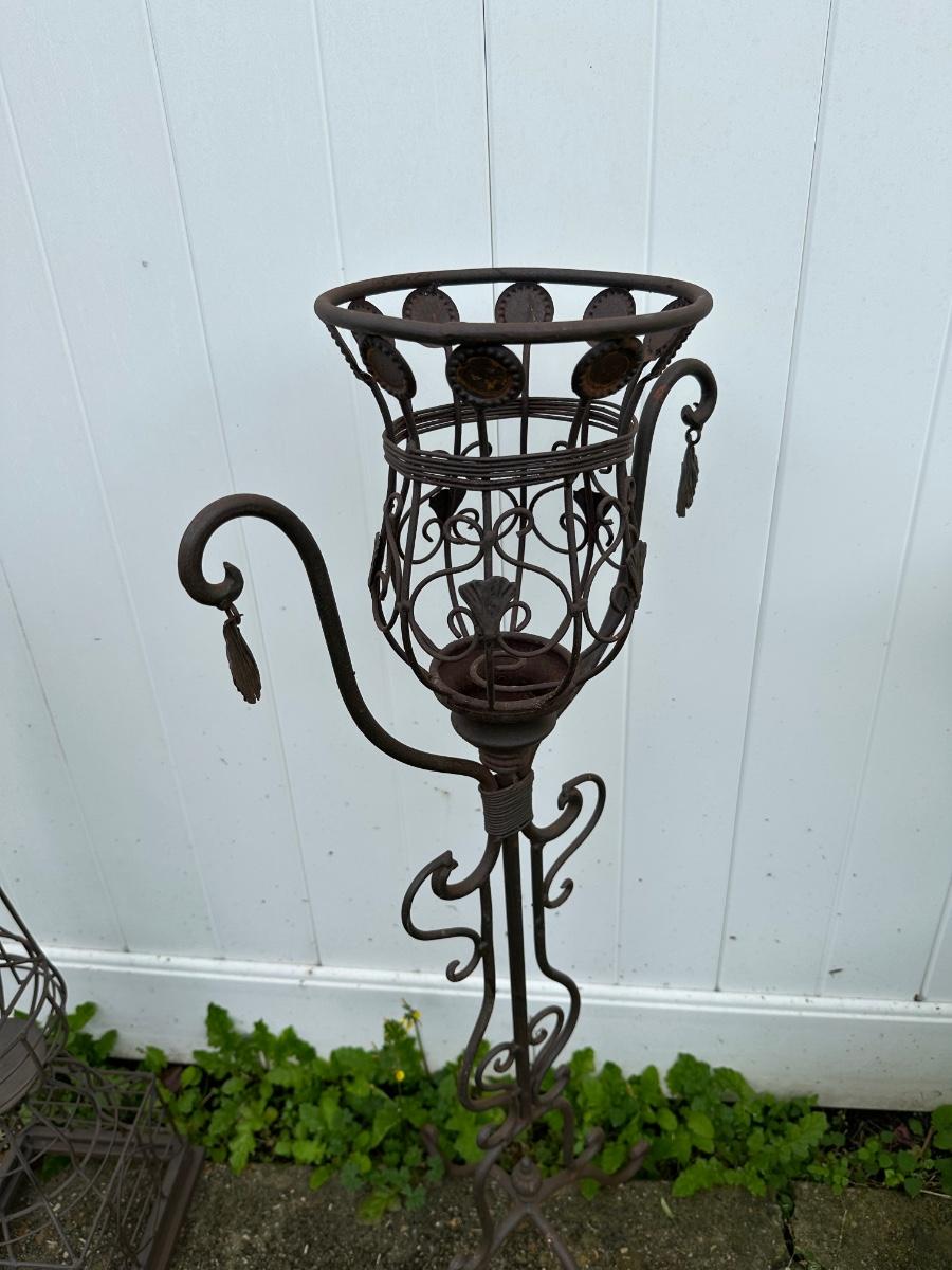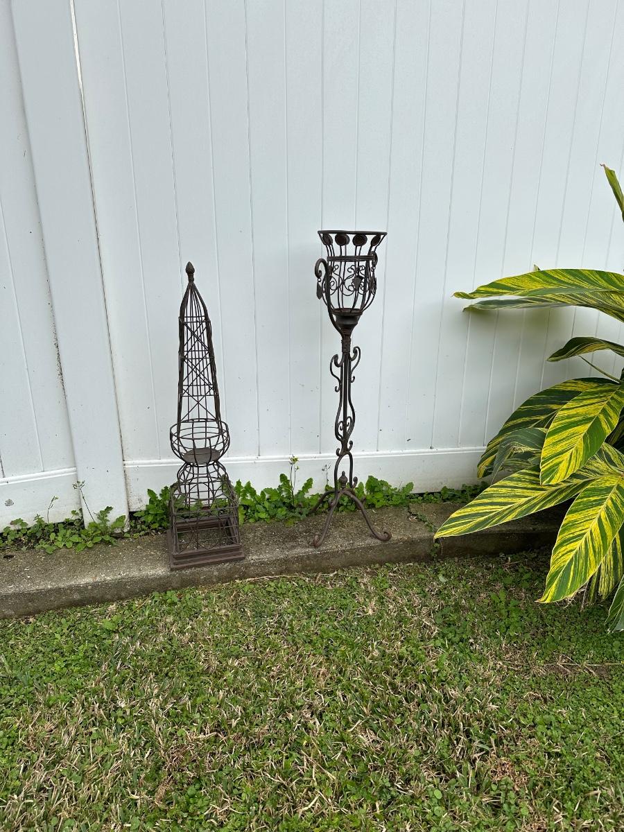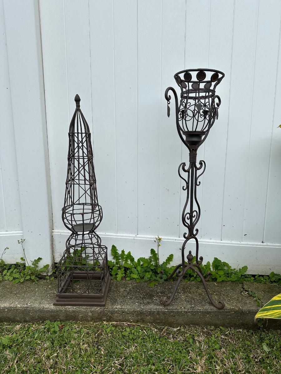 Pair of vintage wrought iron garden stands featuring decorative scrollwork and rustic aged patina. Includes one tall obelisk-style stand and one ornate floor stand