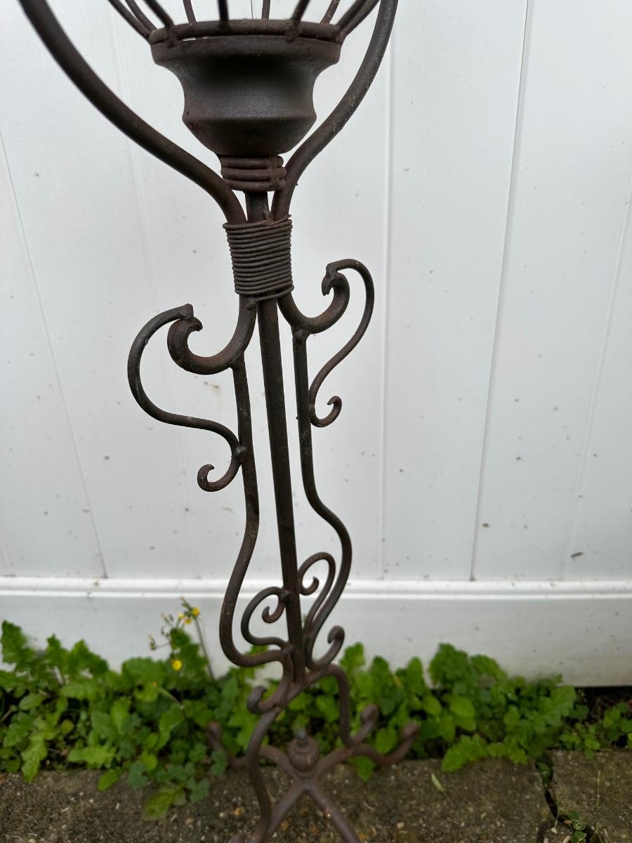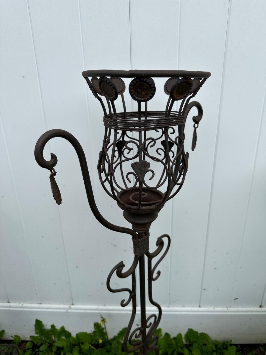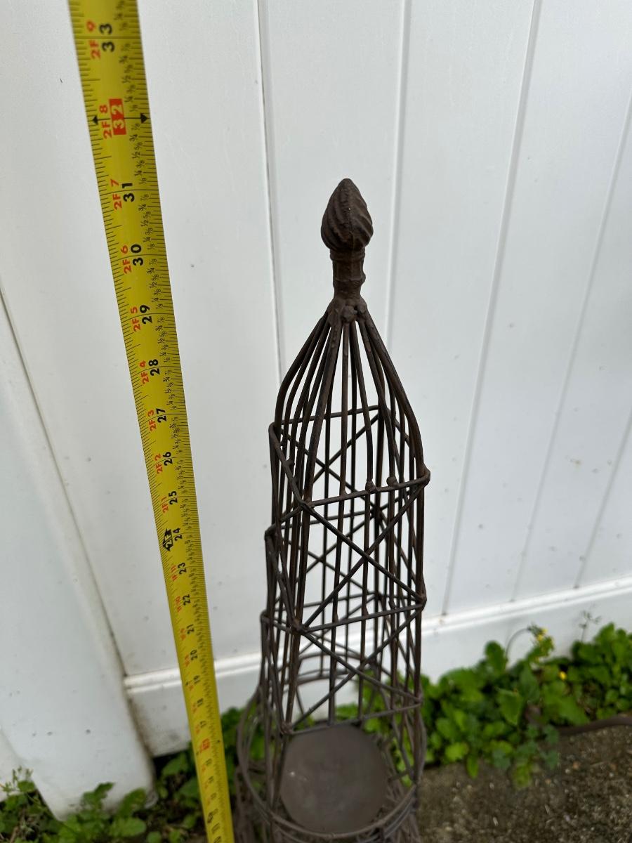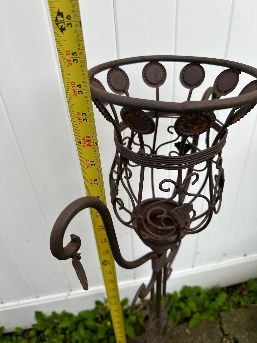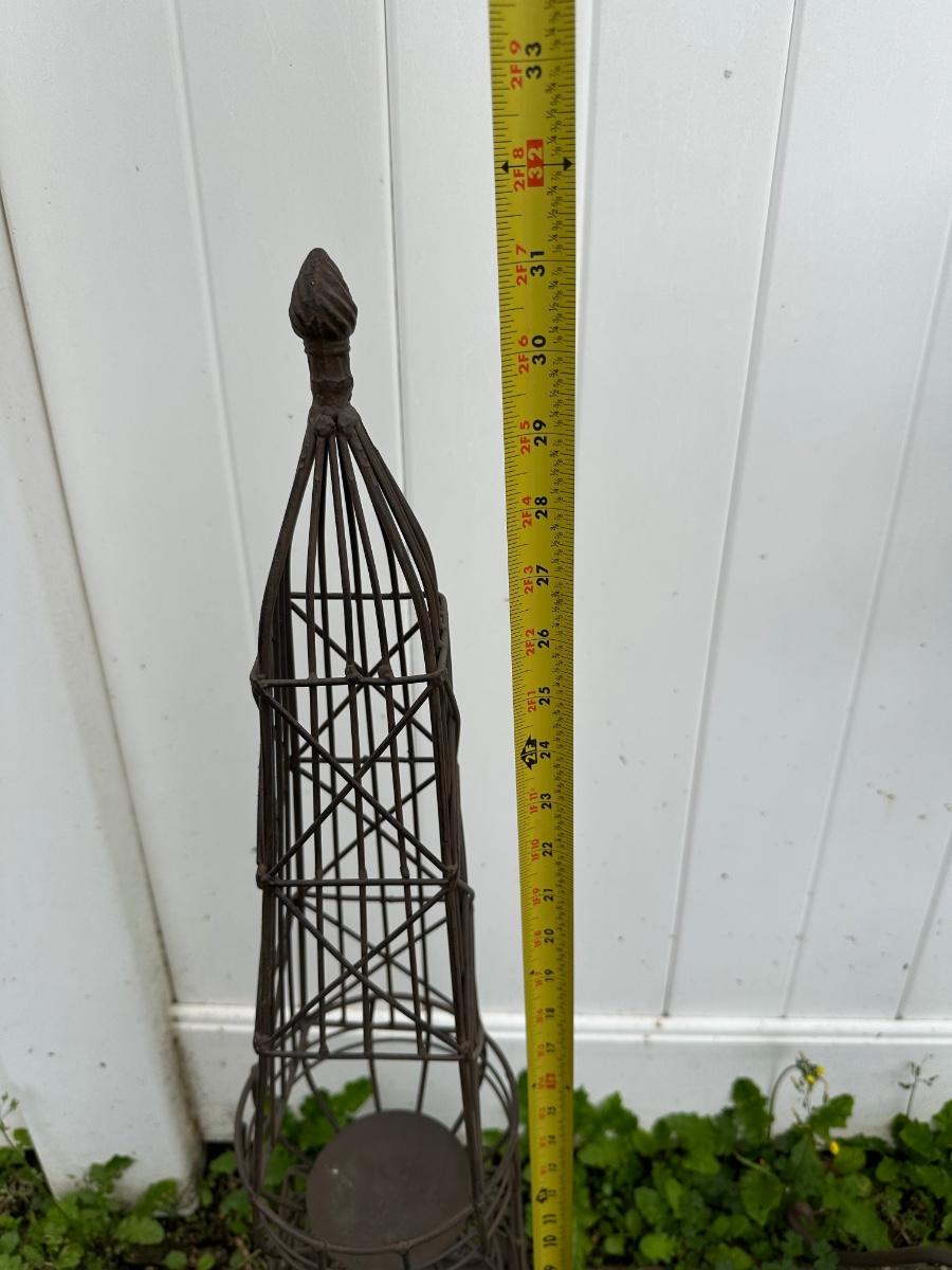 Pair of vintage wrought iron garden stands featuring decorative scrollwork and rustic aged patina. Includes one tall obelisk-style stand and one ornate floor stand