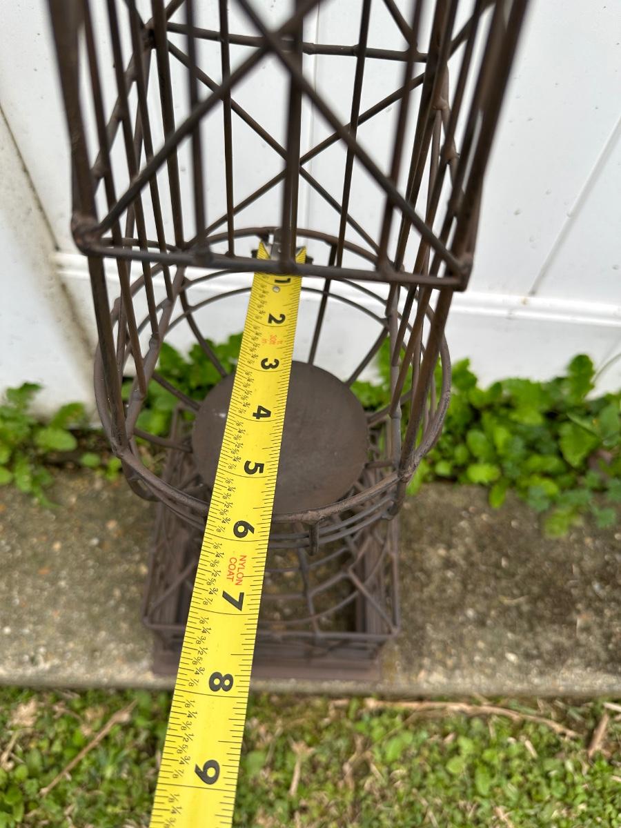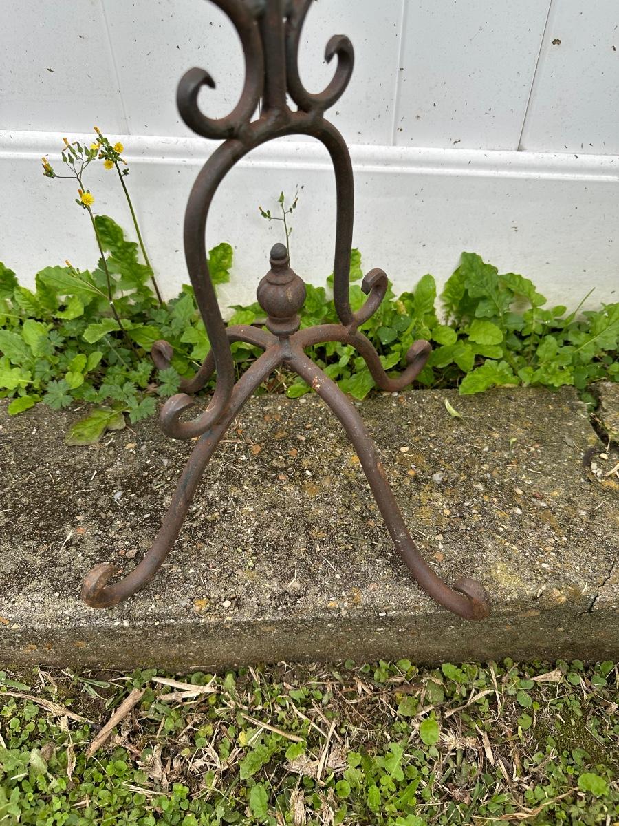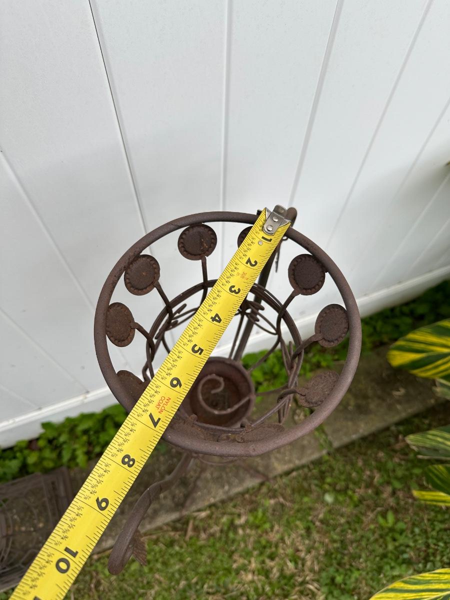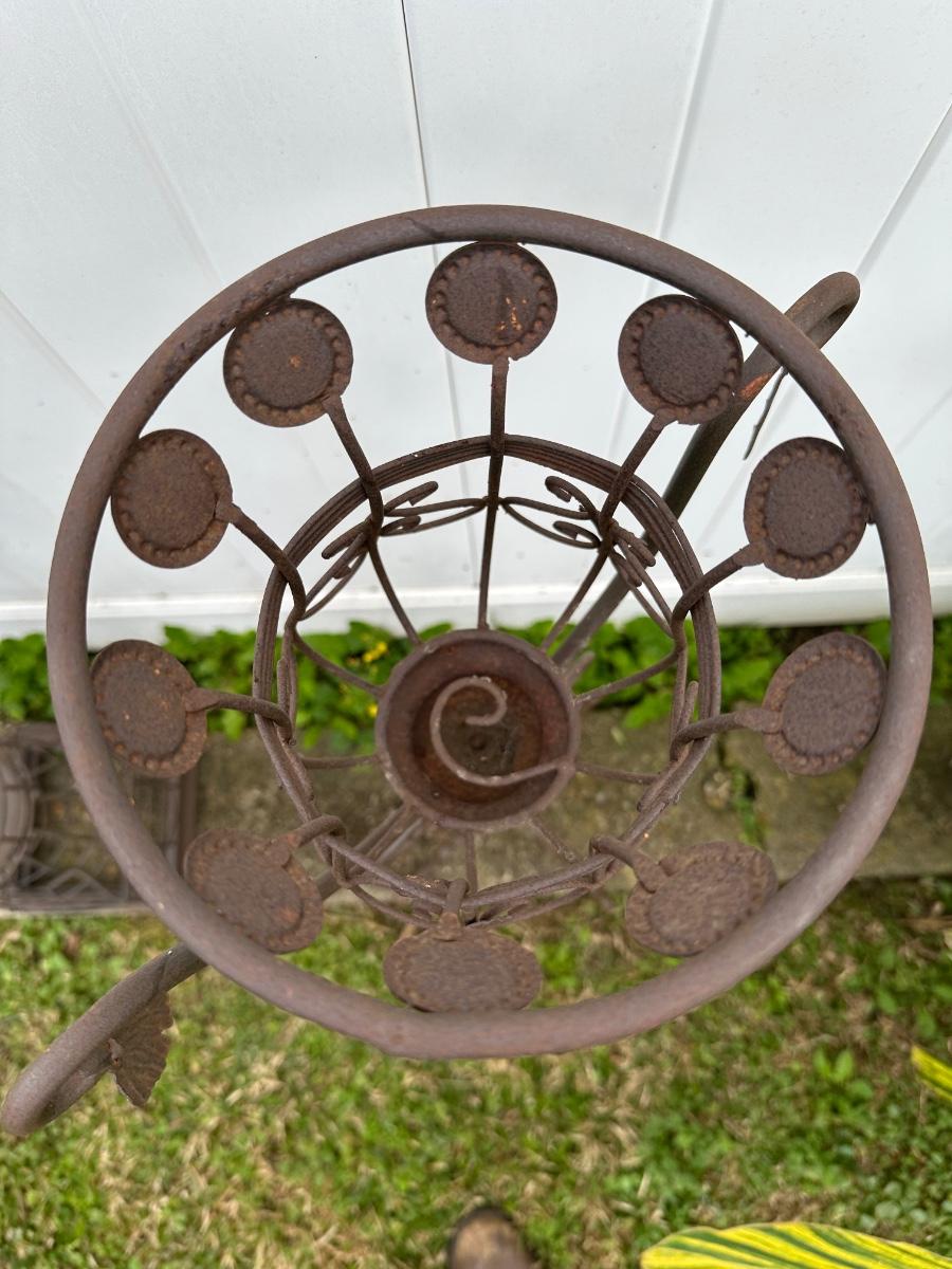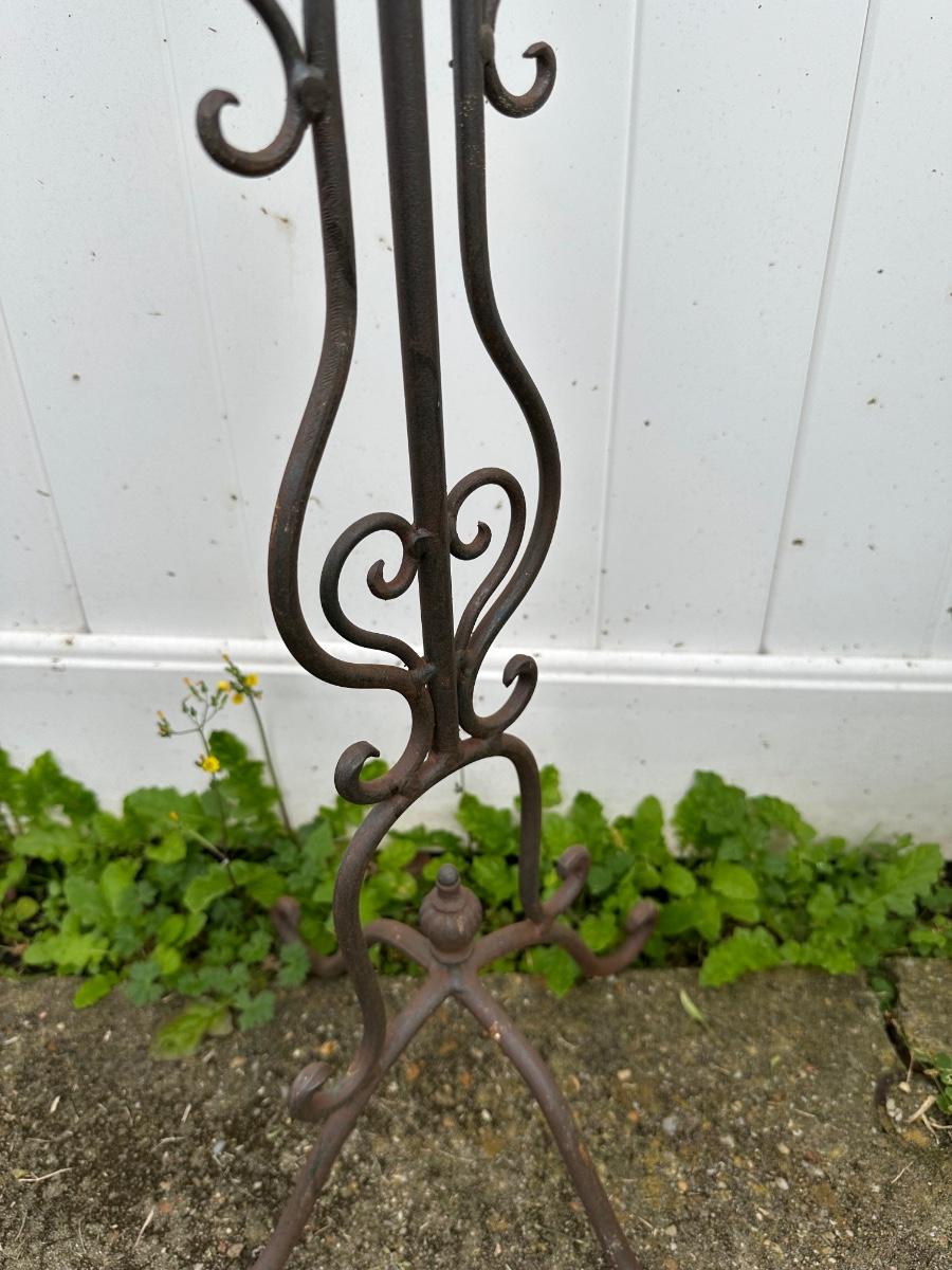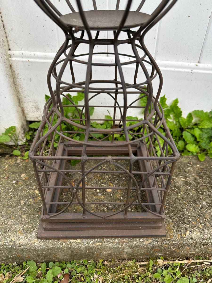 Pair of vintage wrought iron garden stands featuring decorative scrollwork and rustic aged patina. Includes one tall obelisk-style stand and one ornate floor stand