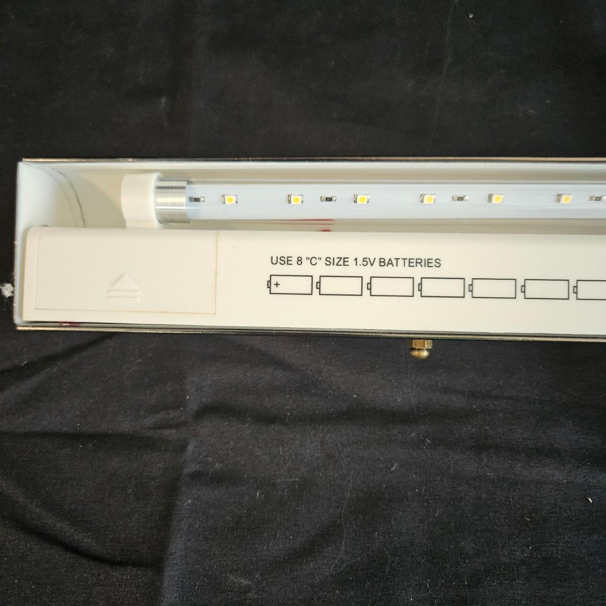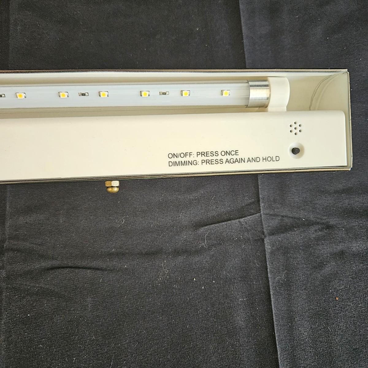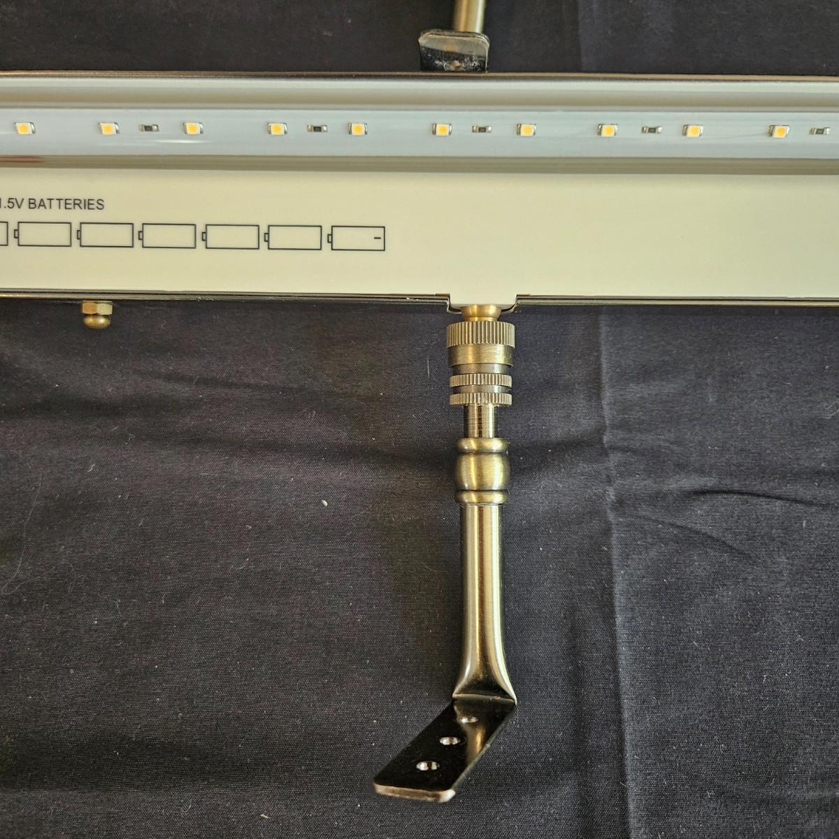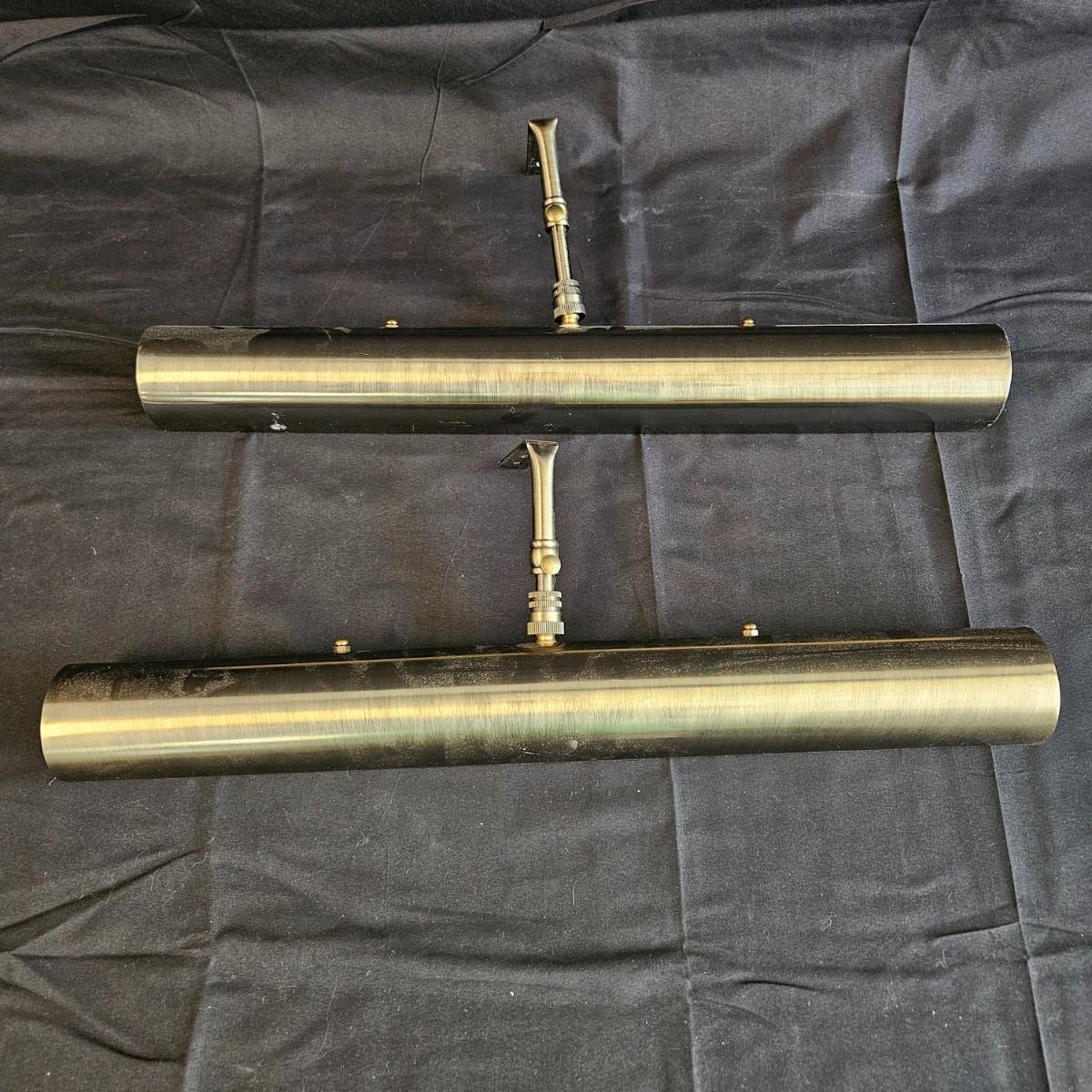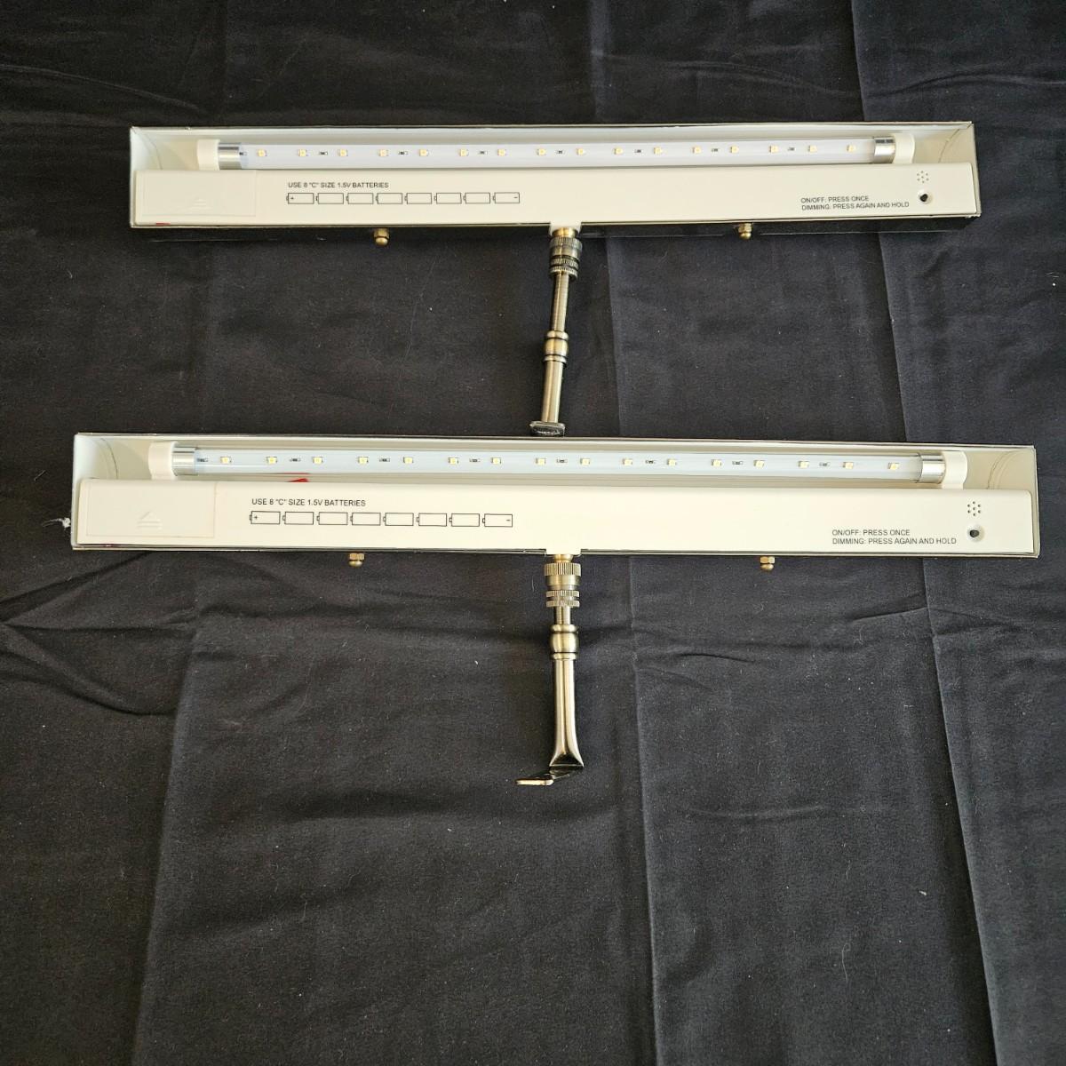 A pair of wall mounted art lights that are battery powered and a brushed brass colored exterior. These items were not tested, but the previous owner stated that they do power on. They have extendable mounting rods that also swivel and have the capability of dimming. They measure approximately 18" x 7.5" x 2"H and screws are included. Shipping available