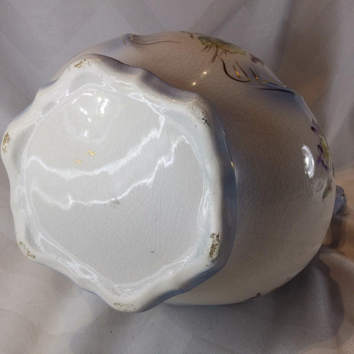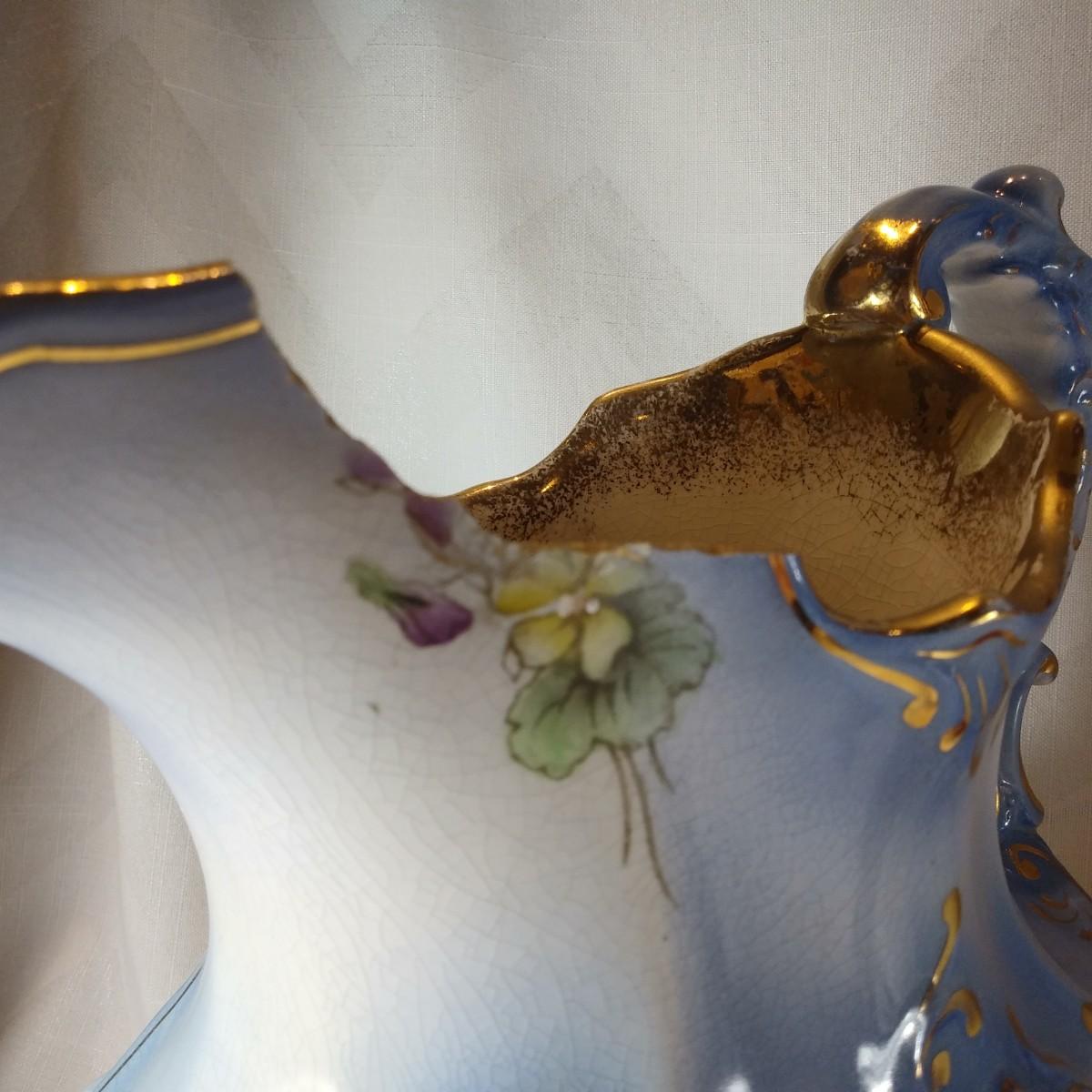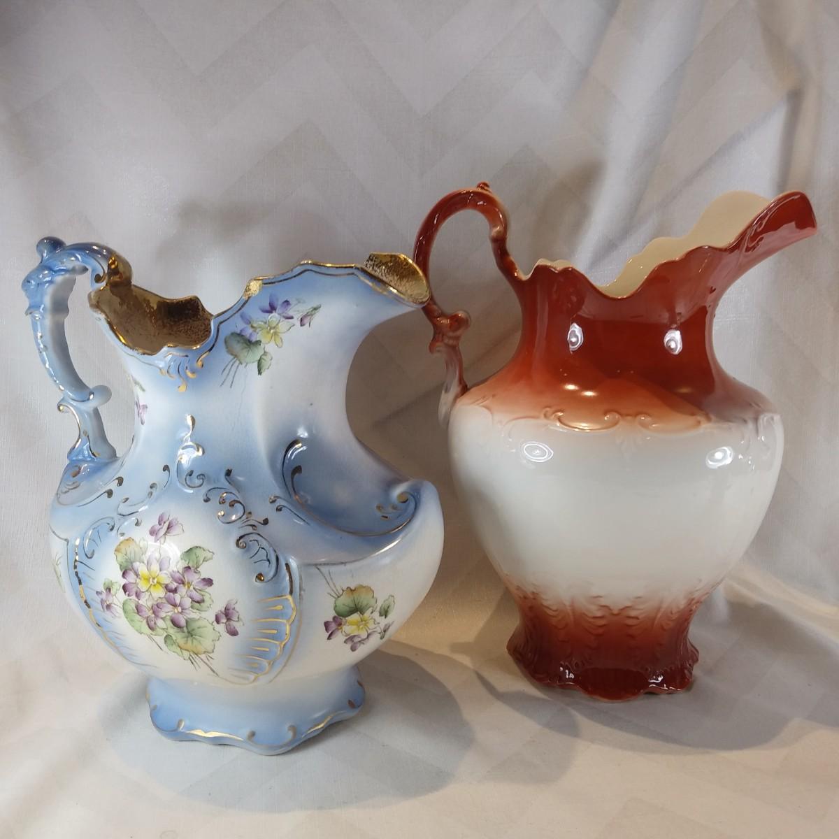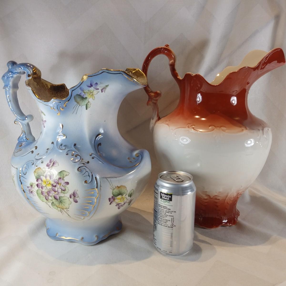 This auction lot is for a Pair of Washstand Water Pitchers. Note that this offering is a pair of antique water pitcher without the usual matching bowls. The pretty blue pitcher has some damage along the top edge of pitcher, the rust and white pitcher is in very good condition. Useful for so many purposes. NOTE: These are large and will be very expensive to ship.