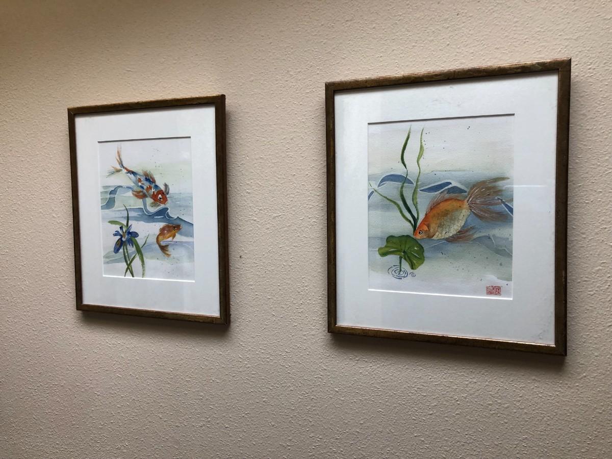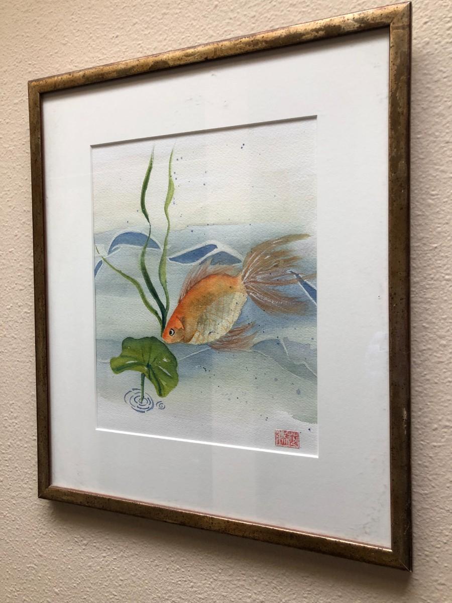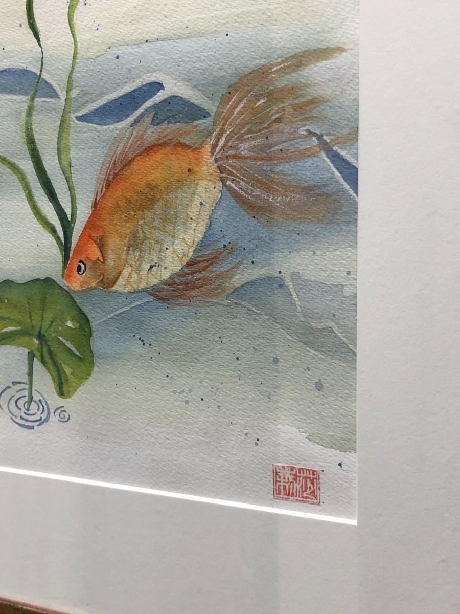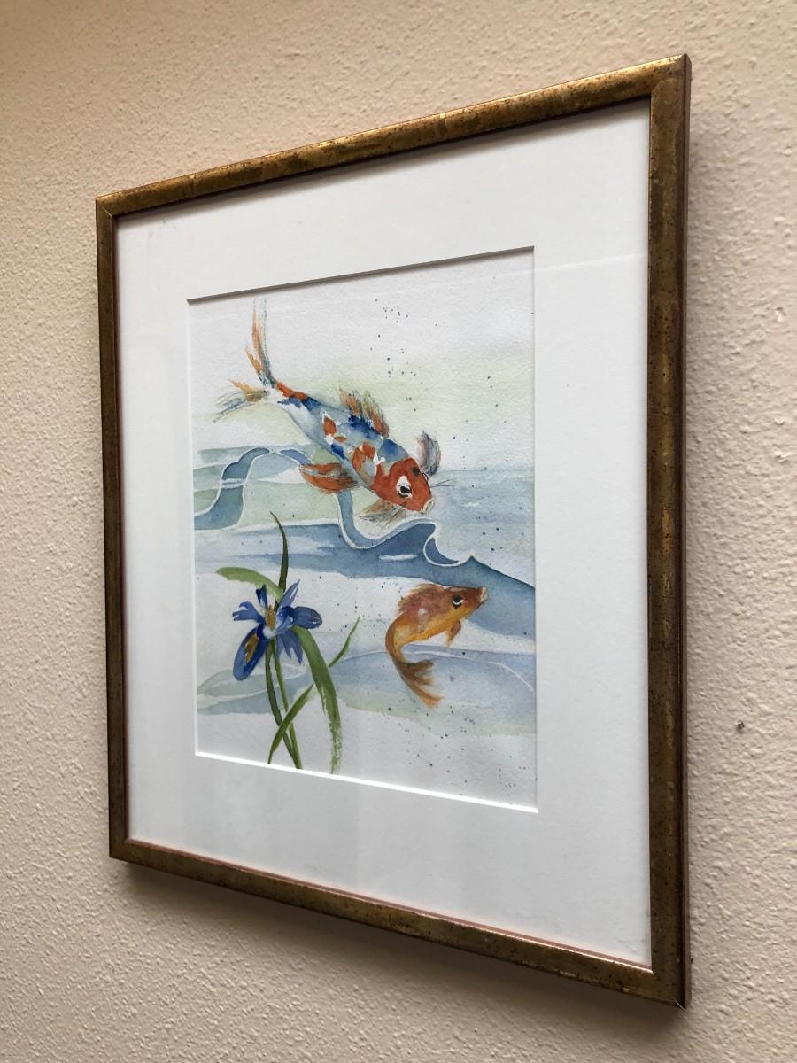 Pair of Watercolor Koi Goldfish Fish Pond Watercolor Paintings. Stamped by the artist. Asian stamp. Framed. In good condition.