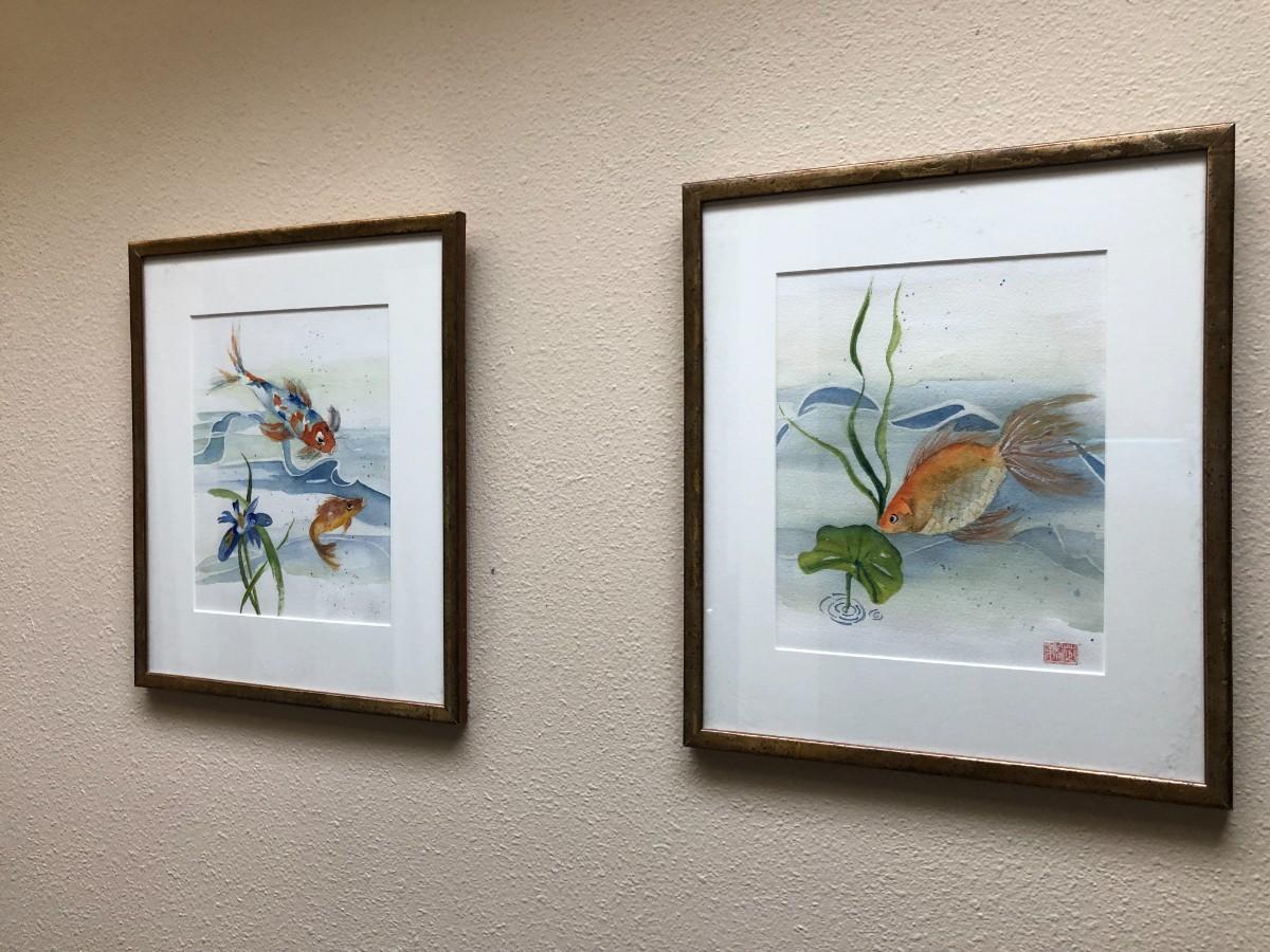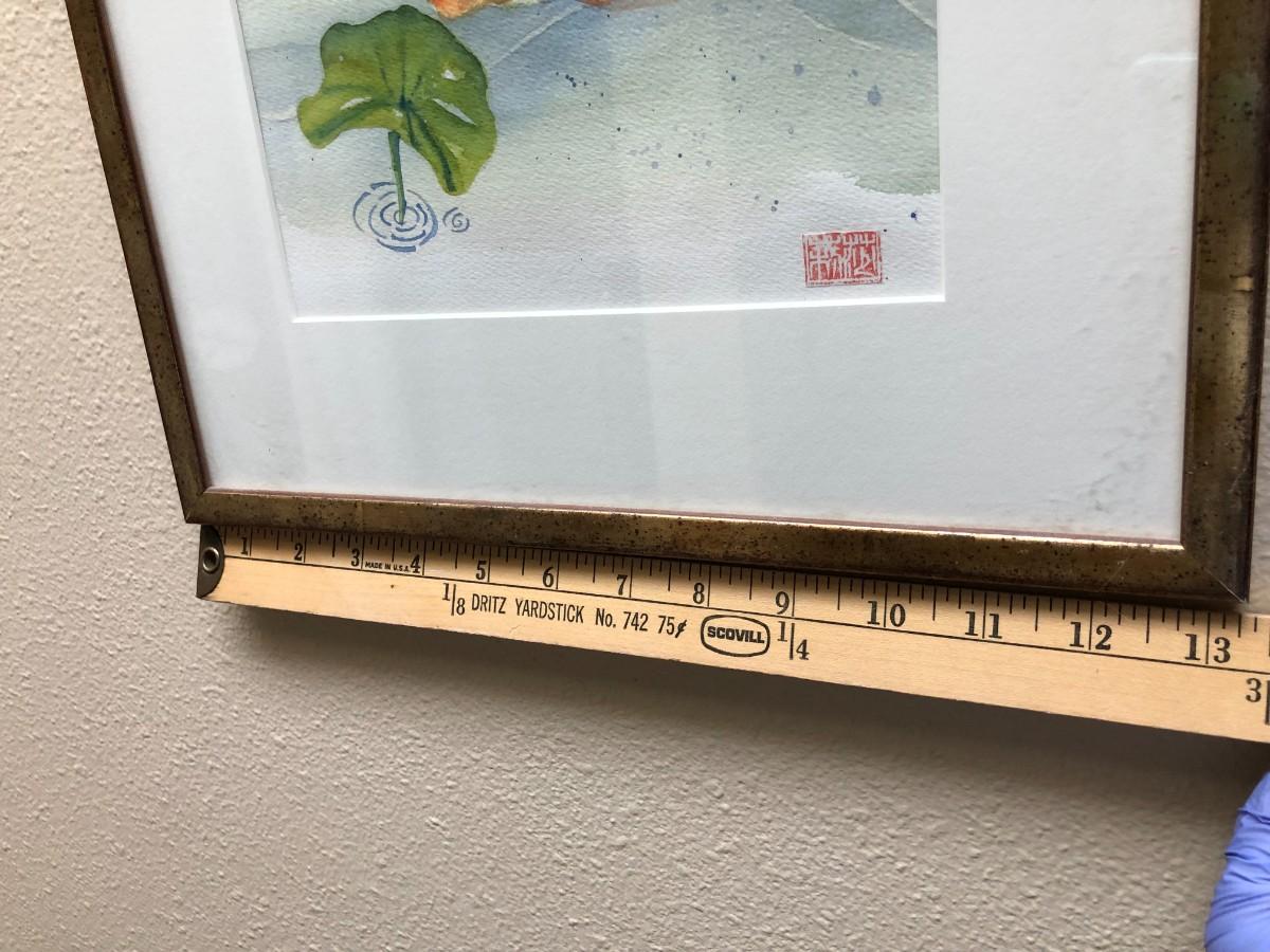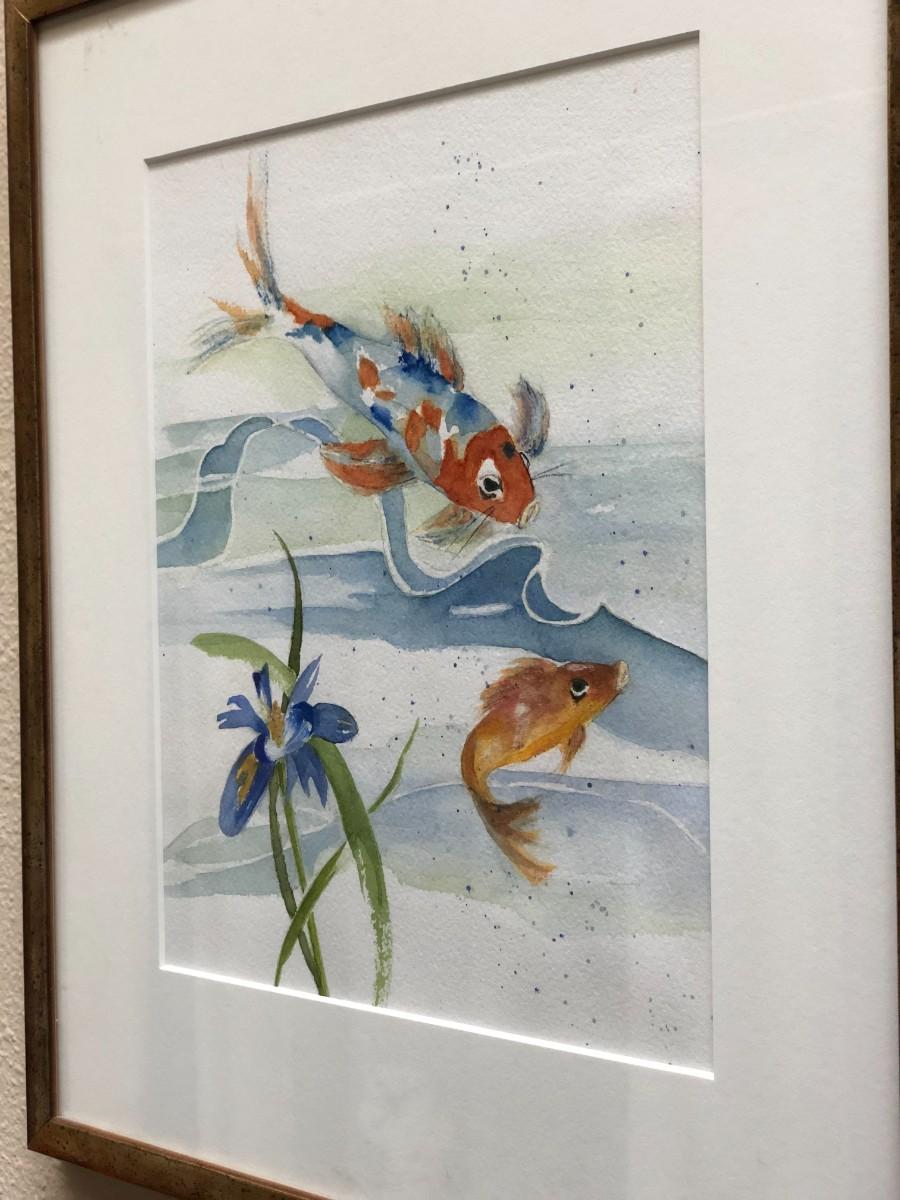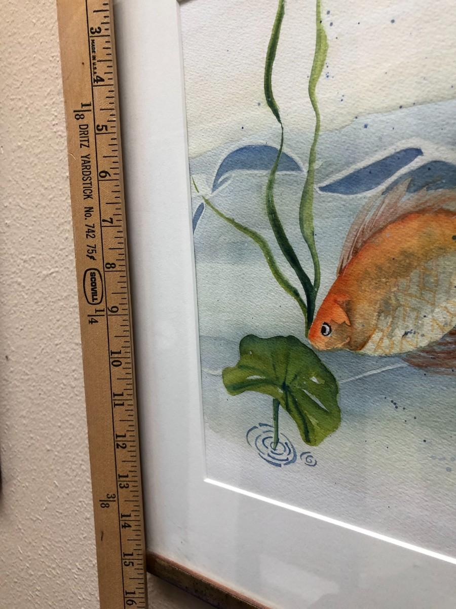 Pair of Watercolor Koi Goldfish Fish Pond Watercolor Paintings. Stamped by the artist. Asian stamp. Framed. In good condition.