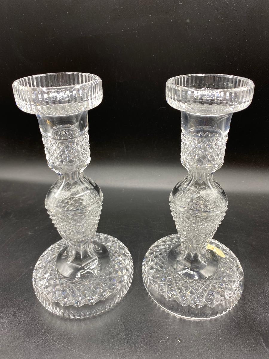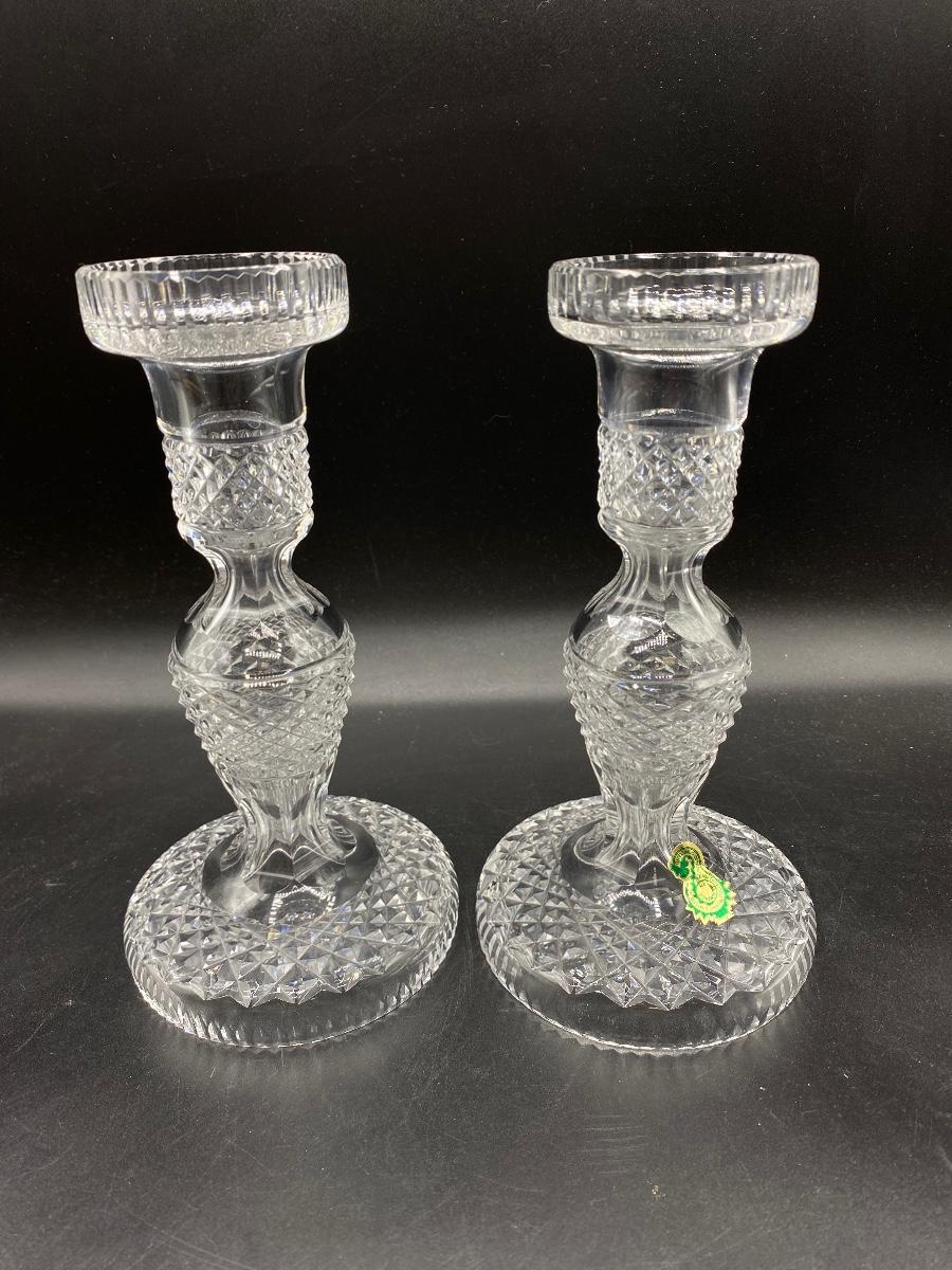 Pair of beautiful Waterford Crystal candle holders. Alana pattern cut crystal. Marked but hard to photograph, original sticker attached. Almost 8" size.