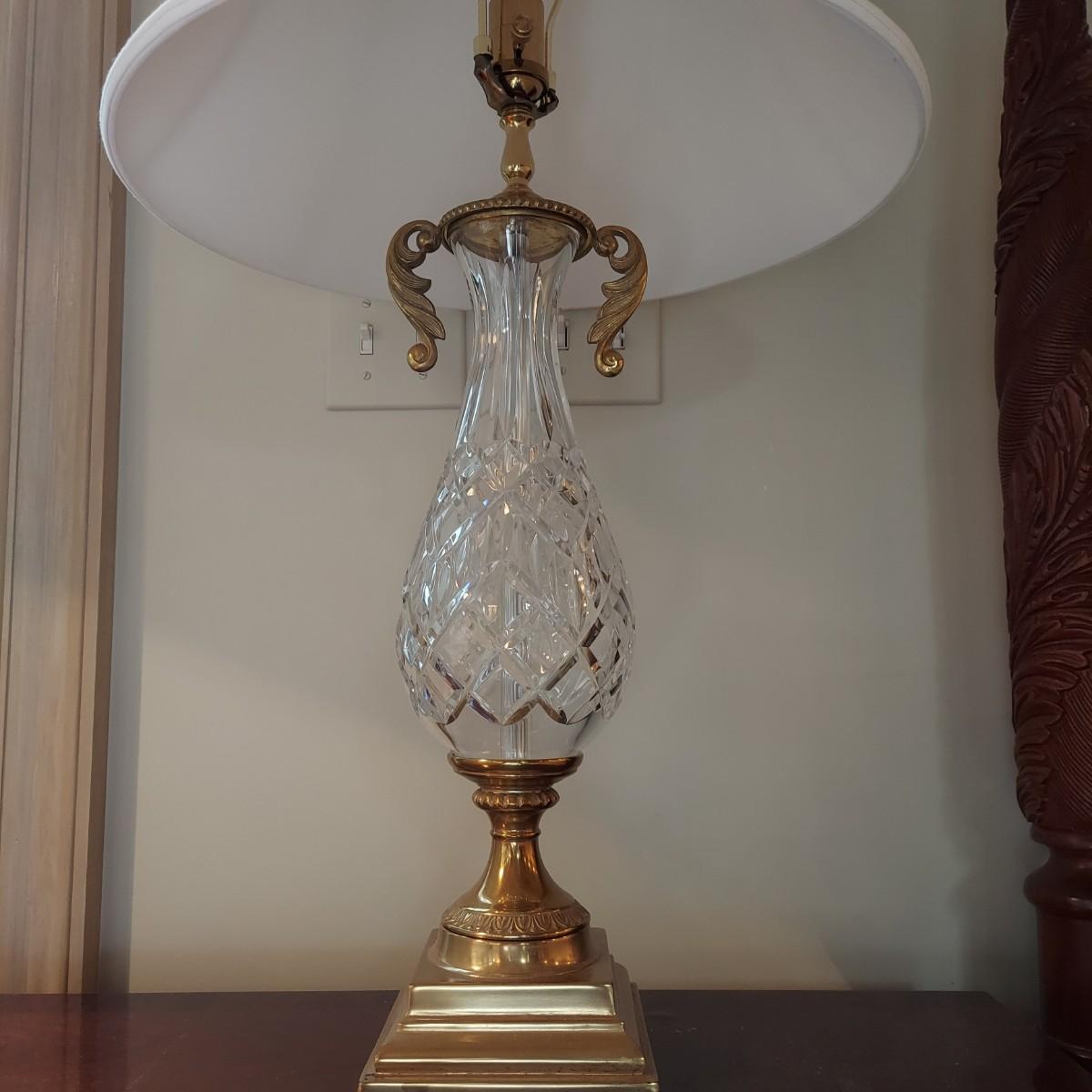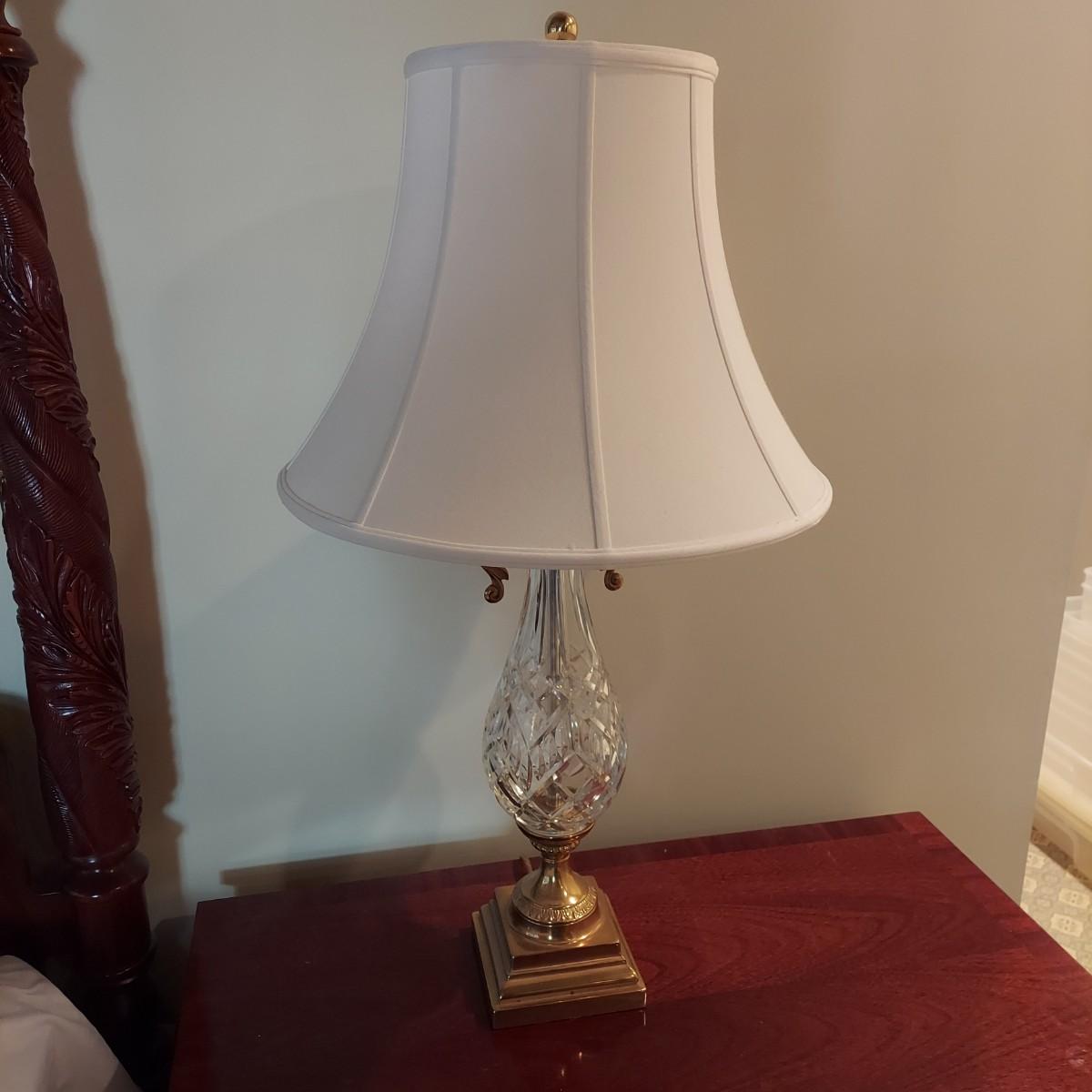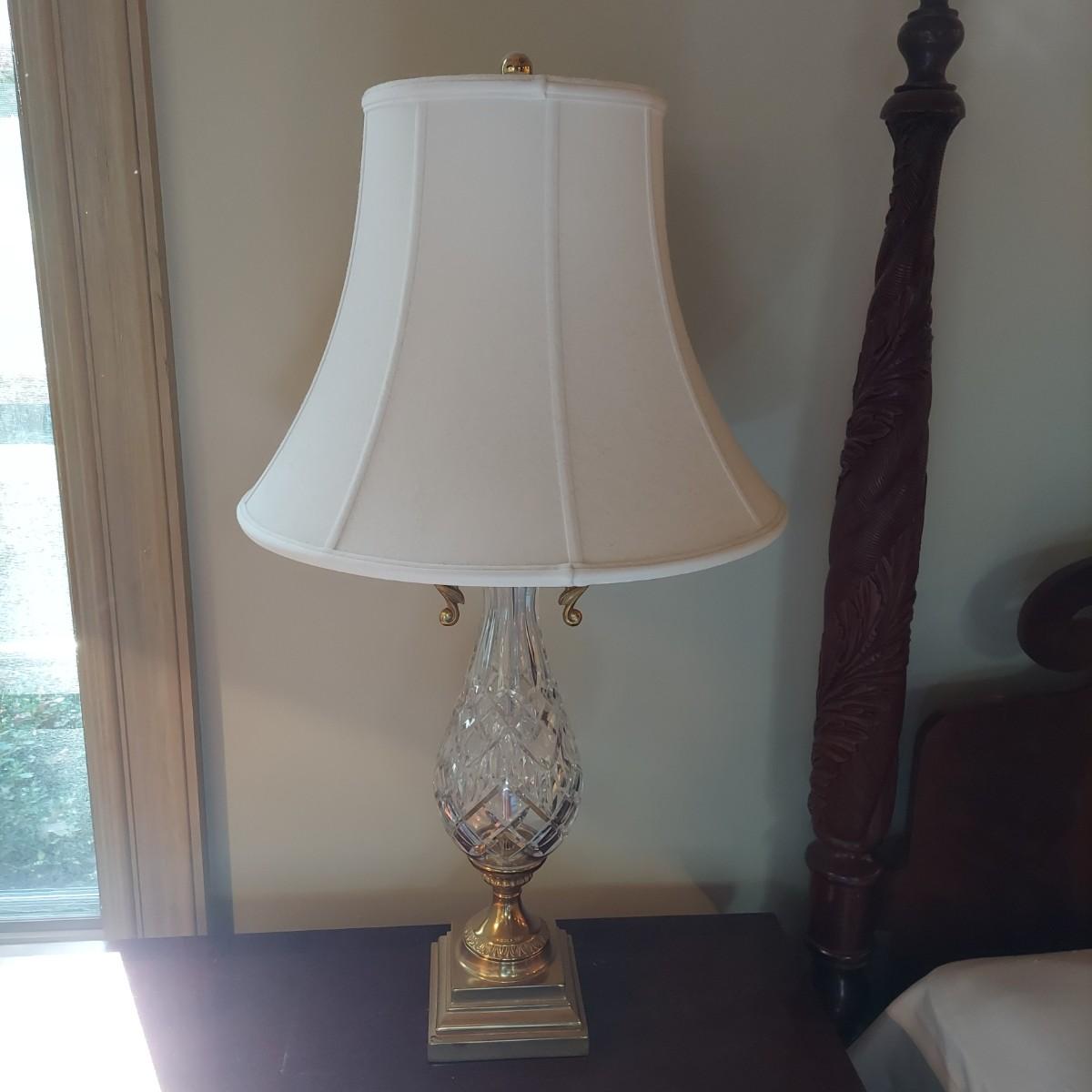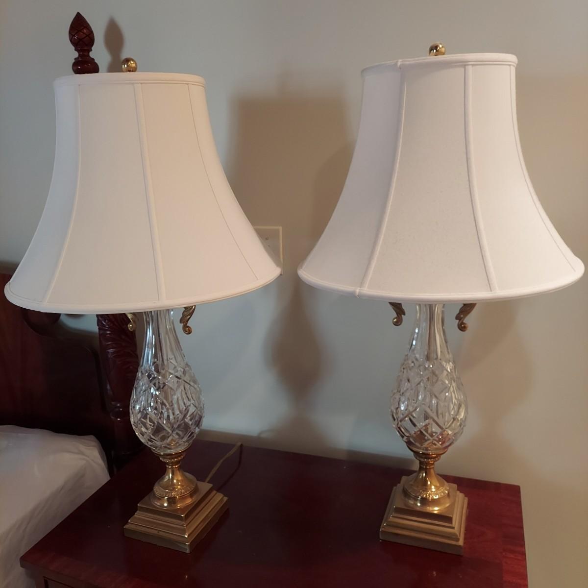 Two crystal lamps with brass bases and cloth shades. Lamps are marked "Waterford" Crystal. Each measures 6" x 6" x 33.5"H and the shades have an 18" diameter. Both lamps powered on when plugged in. The nightstands and artwork shown in some photos are not included, but are available to purchase in other lots. Local Pickup Only.