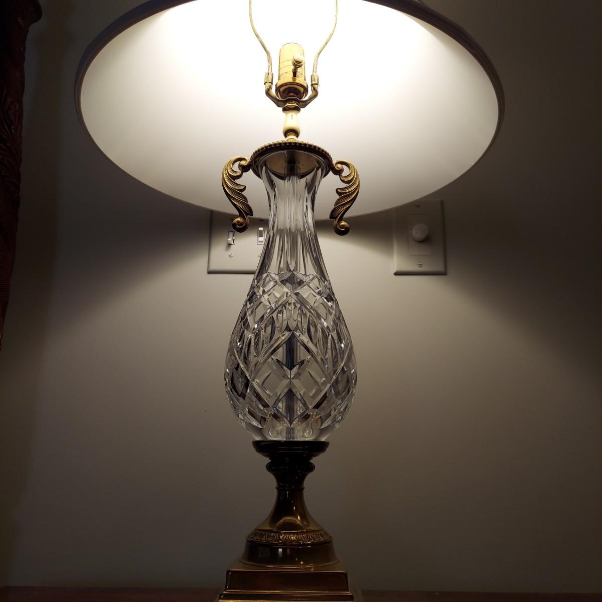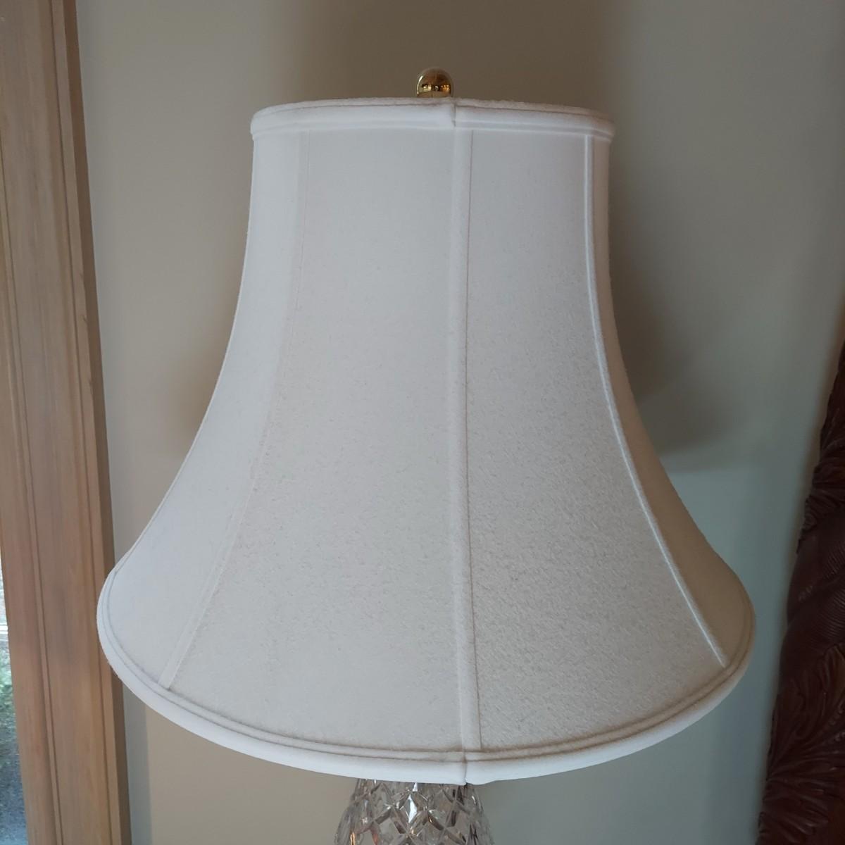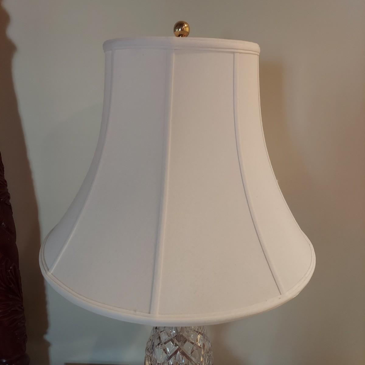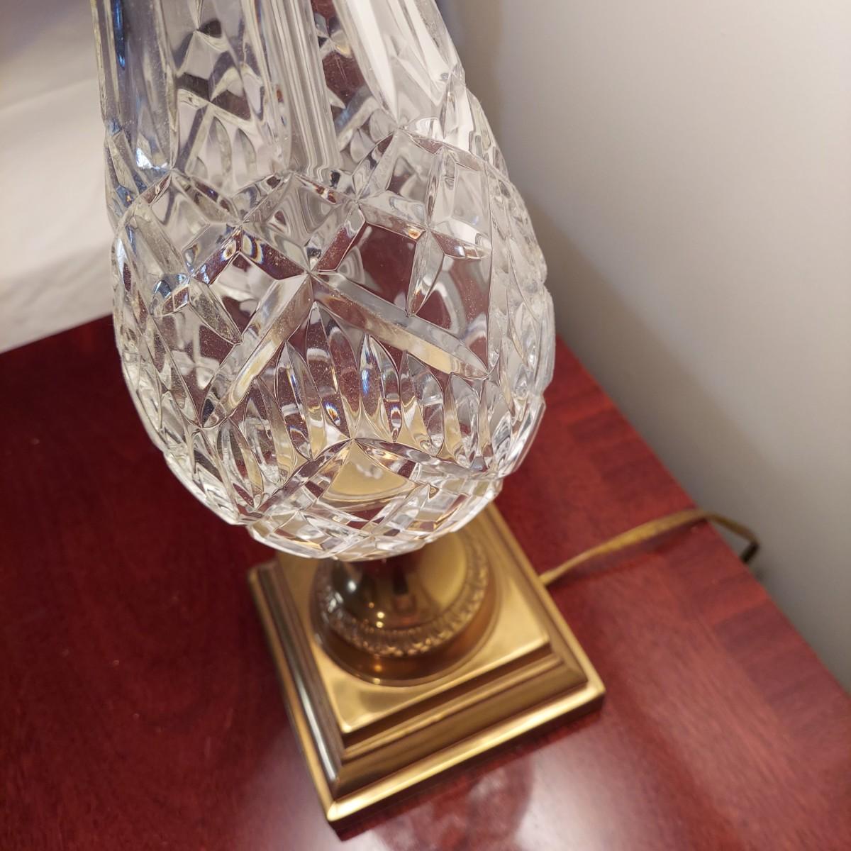 Two crystal lamps with brass bases and cloth shades. Lamps are marked "Waterford" Crystal. Each measures 6" x 6" x 33.5"H and the shades have an 18" diameter. Both lamps powered on when plugged in. The nightstands and artwork shown in some photos are not included, but are available to purchase in other lots. Local Pickup Only.