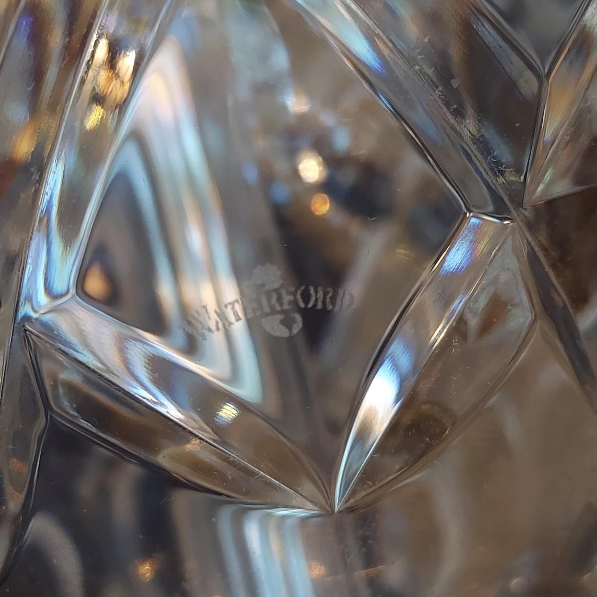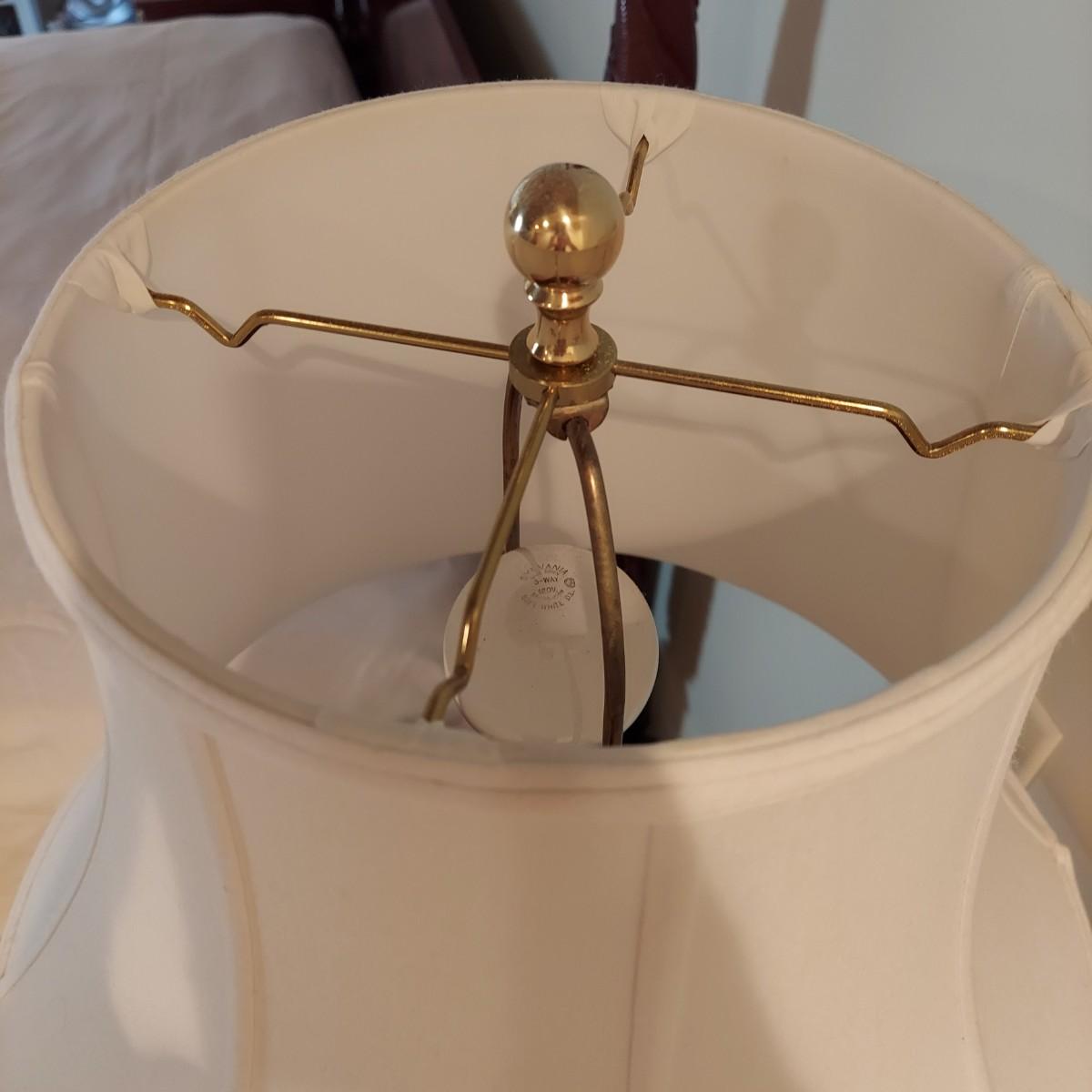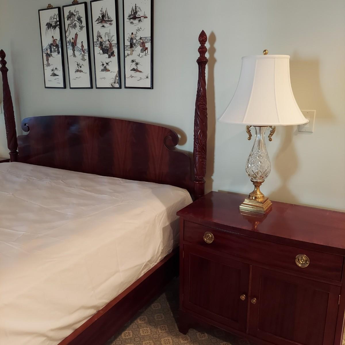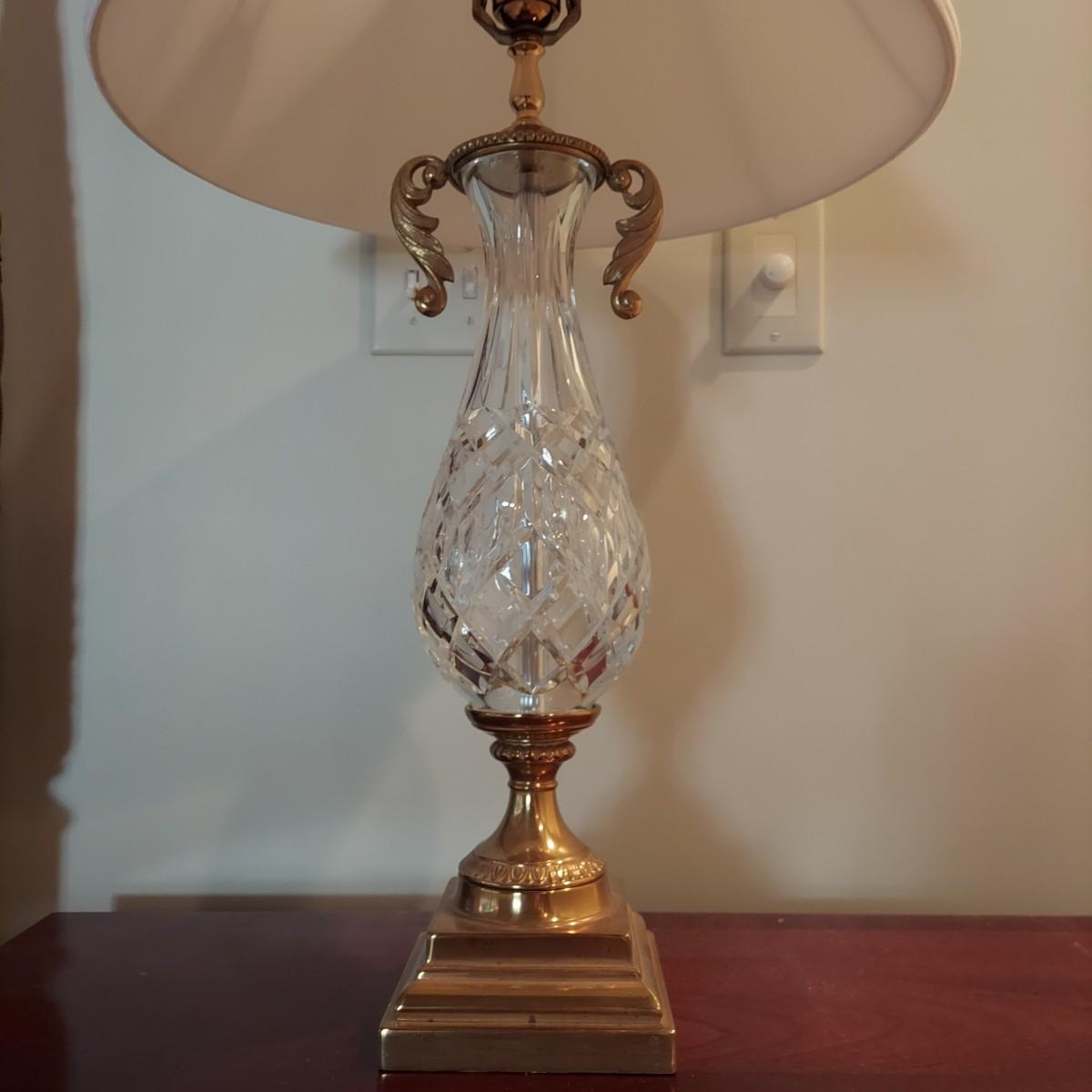 Two crystal lamps with brass bases and cloth shades. Lamps are marked "Waterford" Crystal. Each measures 6" x 6" x 33.5"H and the shades have an 18" diameter. Both lamps powered on when plugged in. The nightstands and artwork shown in some photos are not included, but are available to purchase in other lots. Local Pickup Only.