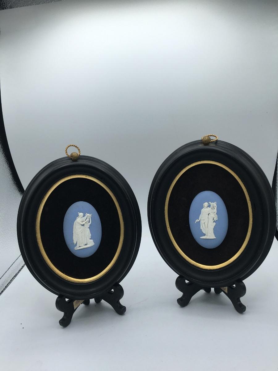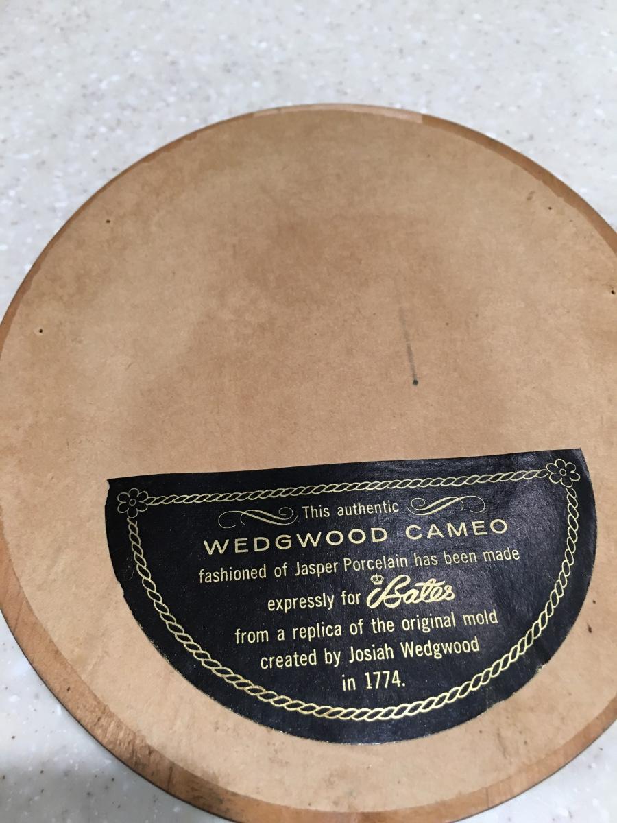 Pair of lovely authentic Wedgewood Cameos mounted on oval wooden hanging plaques. The back of the plates says “this authentic Wedgewood cameo fashioned of Jasper porcelain has been made expressly for Bates from a replica of the original mold created by Josiah Wedgewood in 1774”. The plaques measure 6 1/2” tall and 5 1/2” wide. The plaques are in good used condition with some touch up done.
