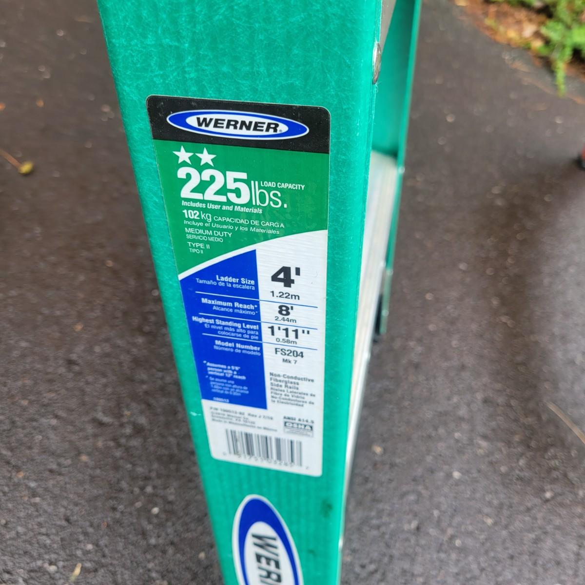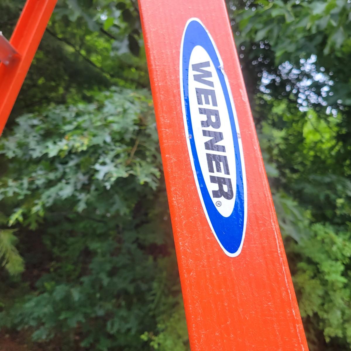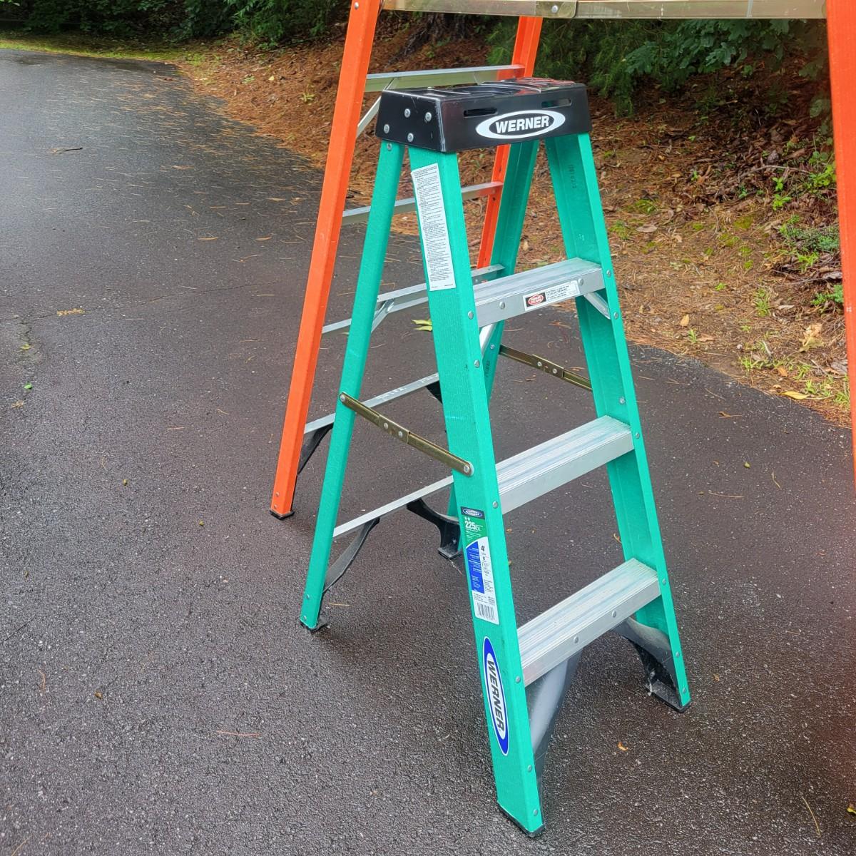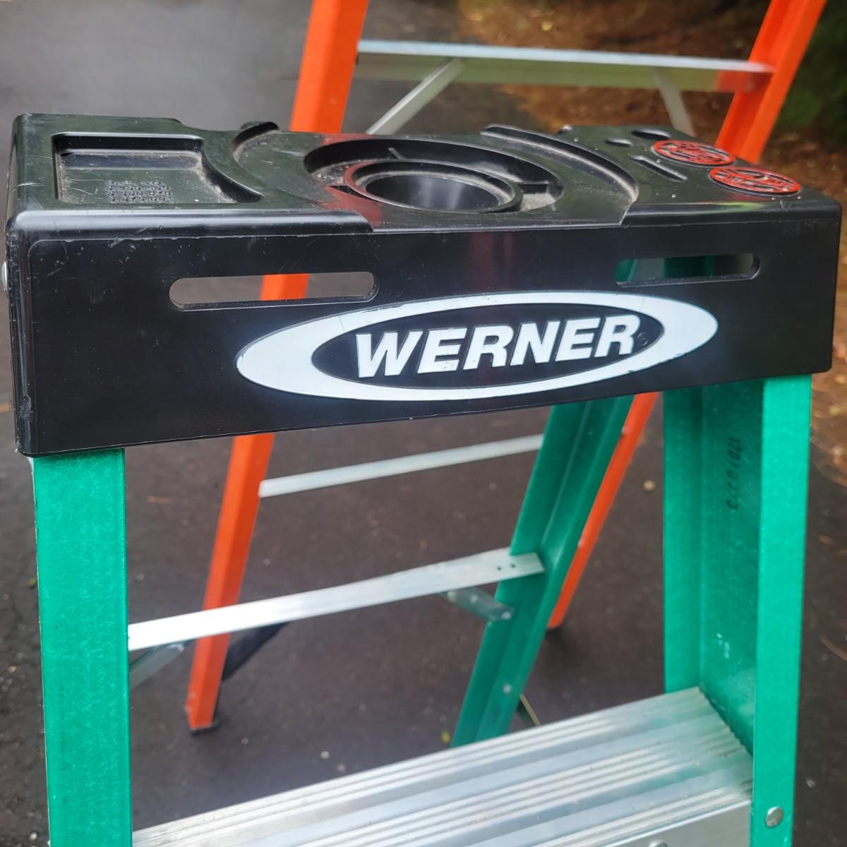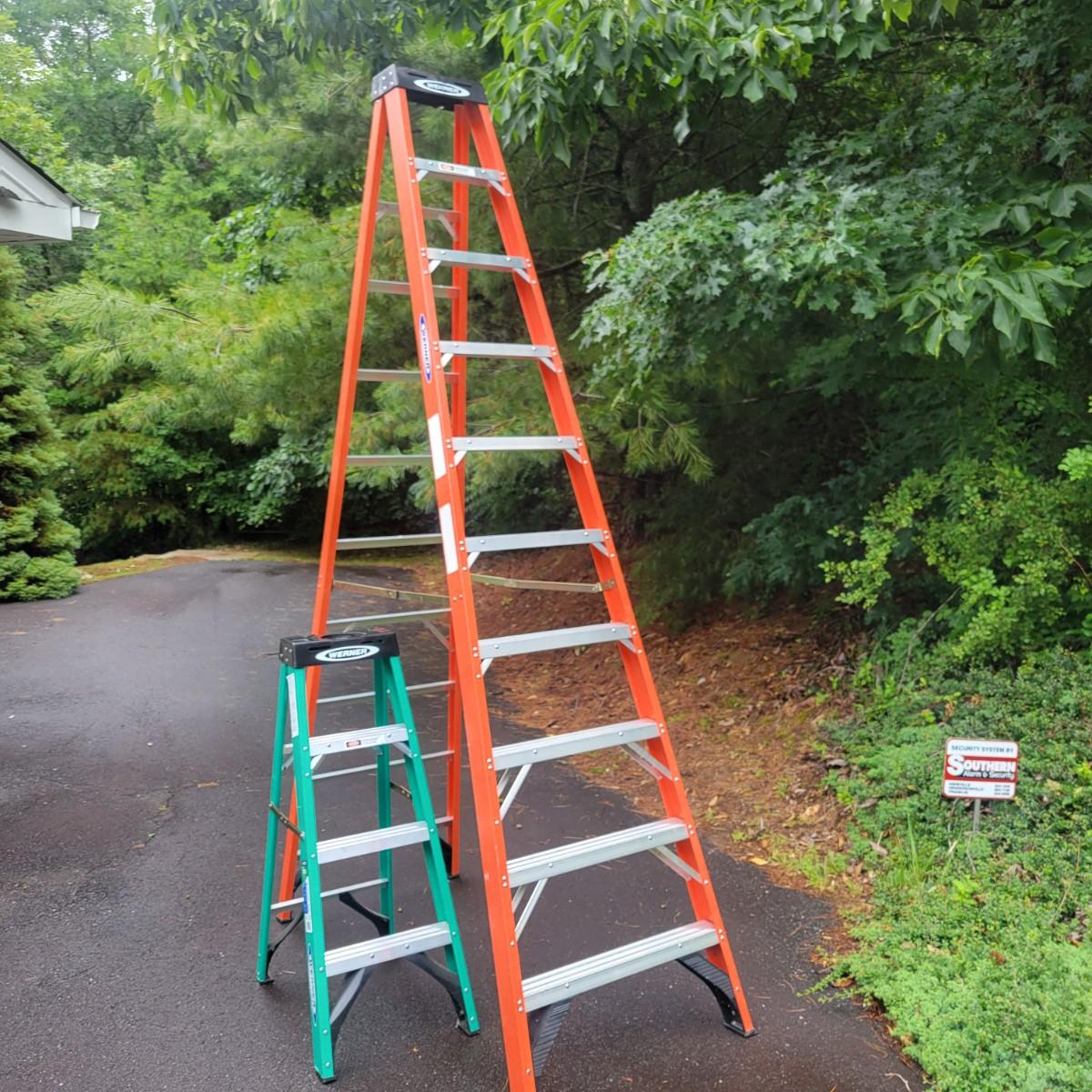 A pair of Werener A frame ladders. Both ladders have fiberglass frames with aluminum steps. The larger orange ladder is 10' and the smaller green one is 4'. Local pickup only