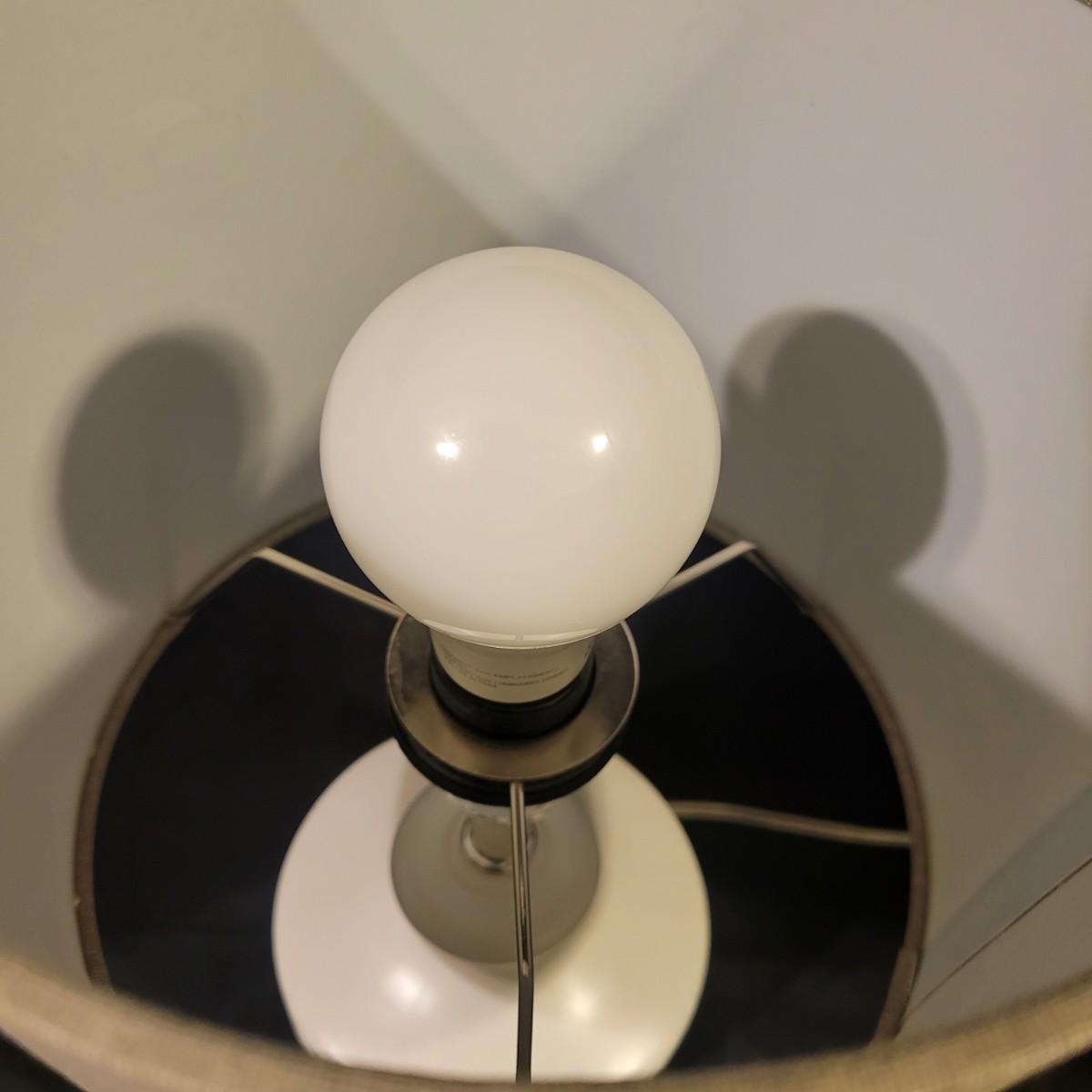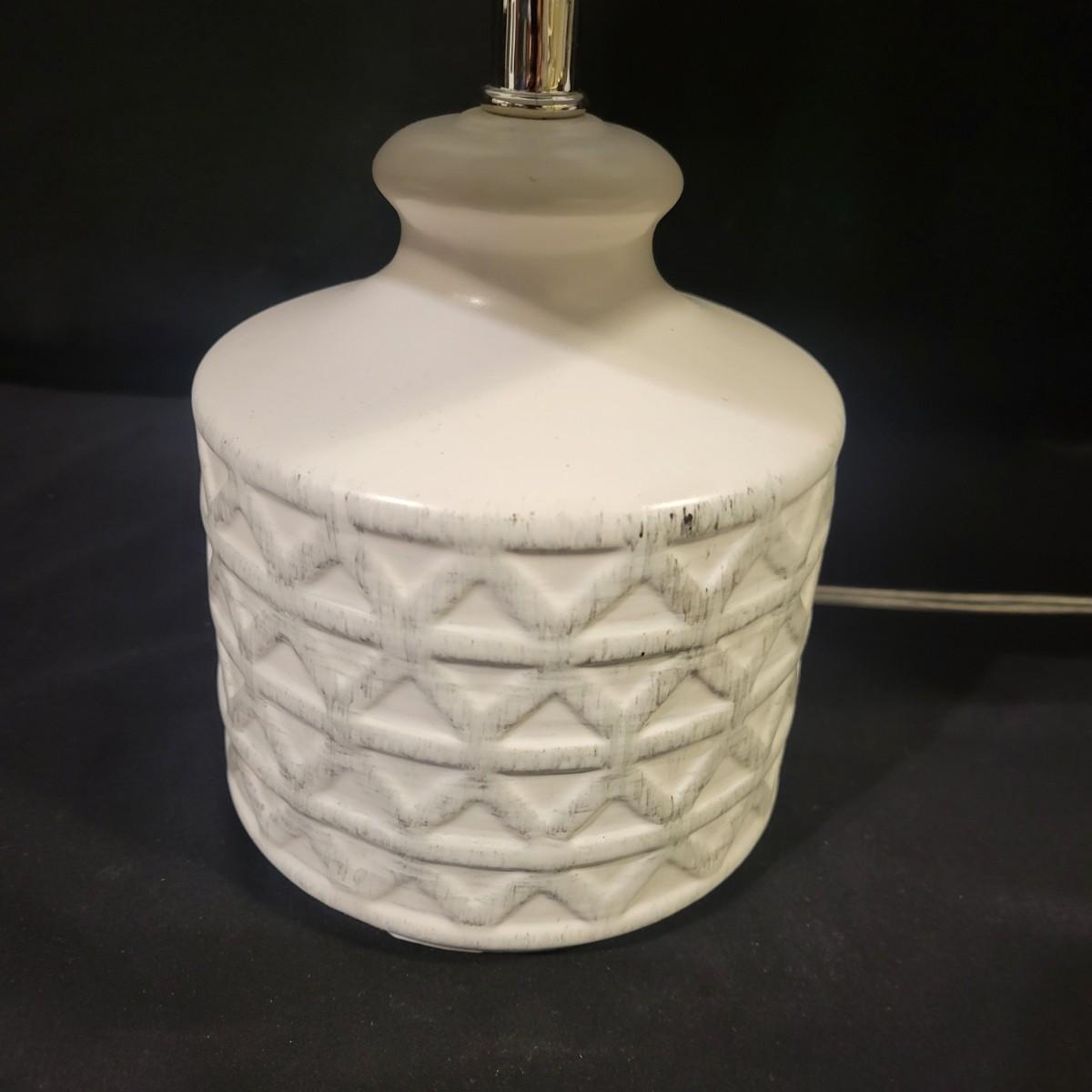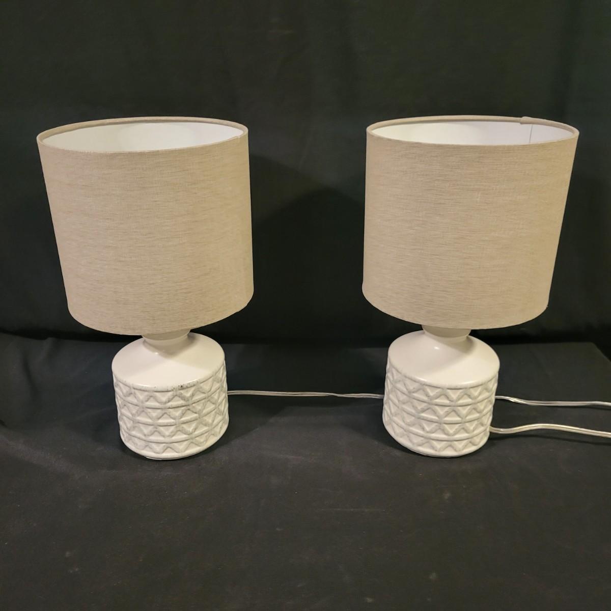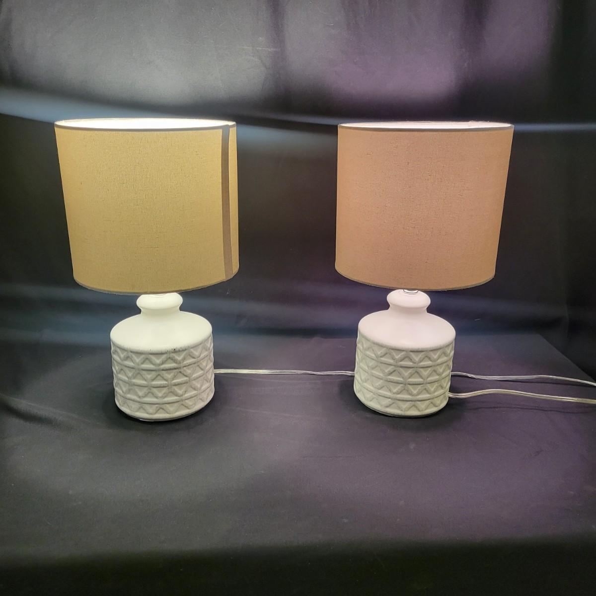A pair of decorative white ceramic laps with grey fabric shades. Each lamp measures approximately 6"D x 16"H. Both lamps powered on when plugged in. Shipping available