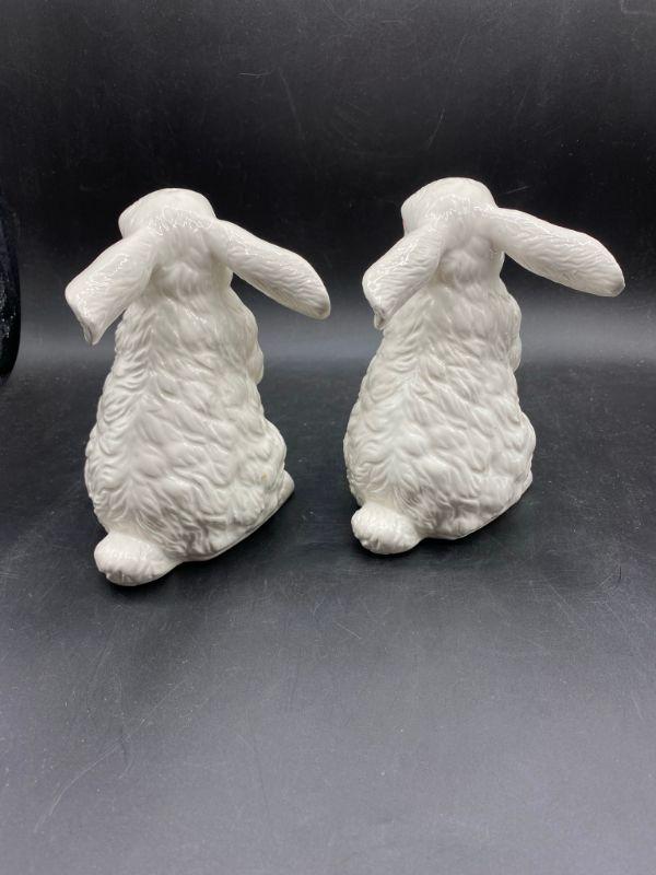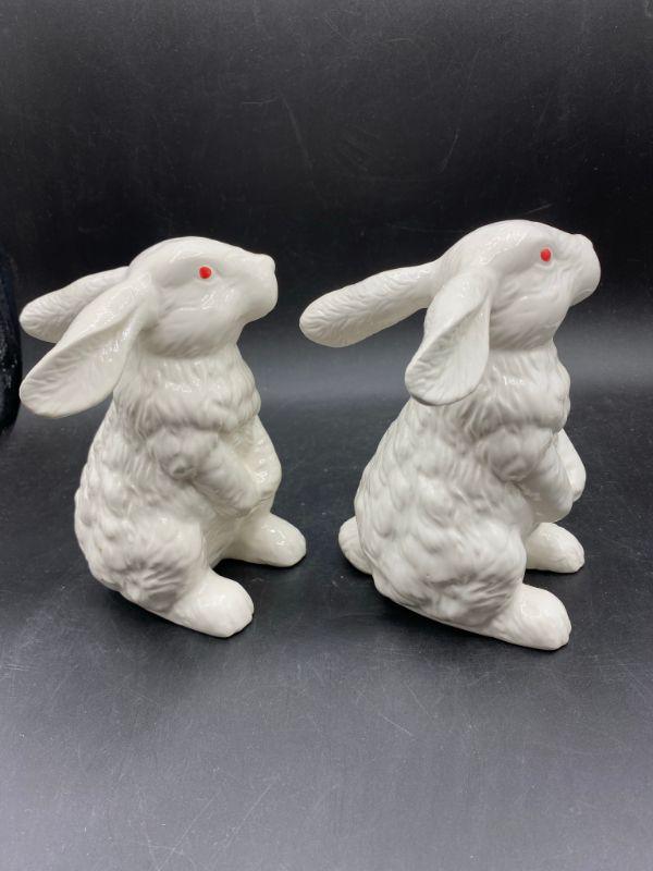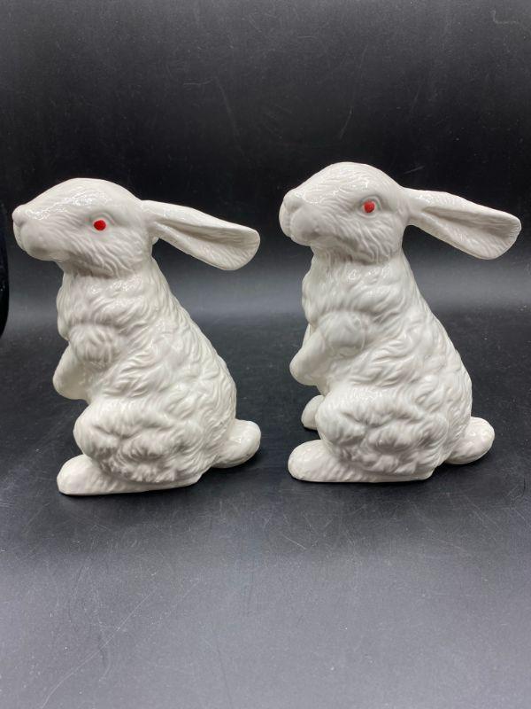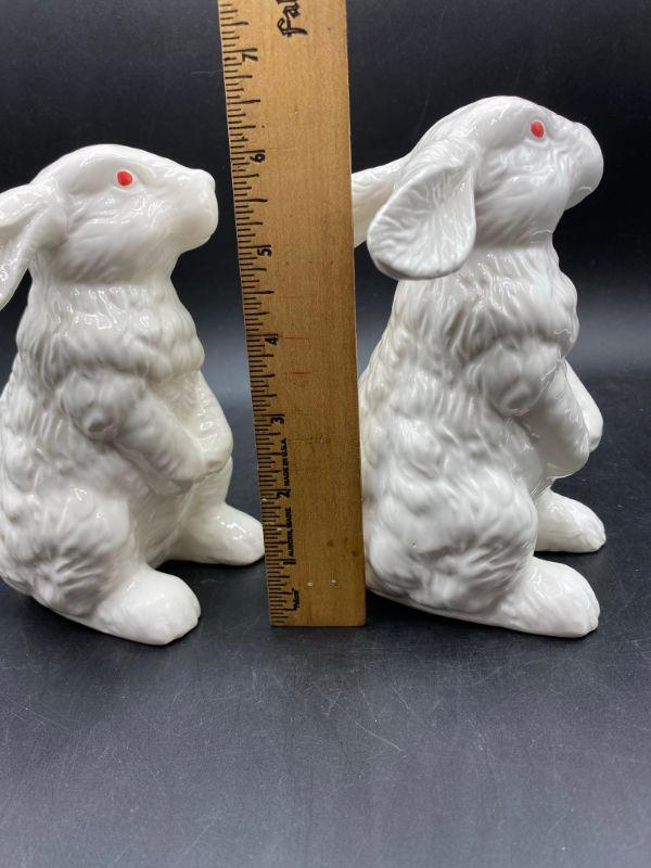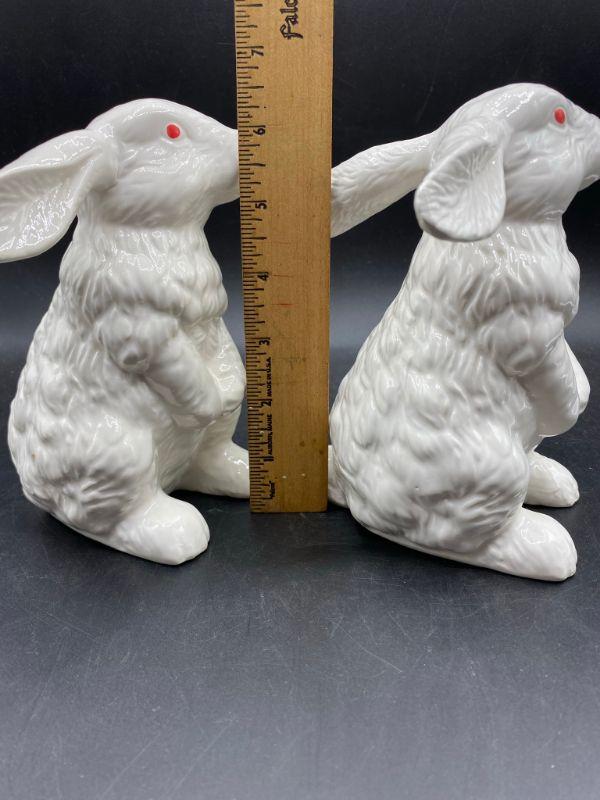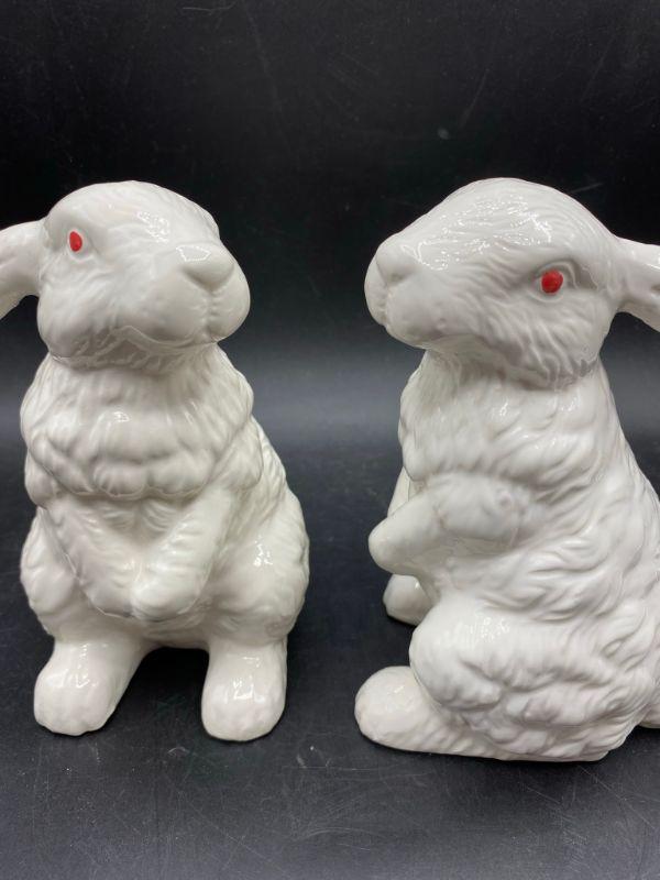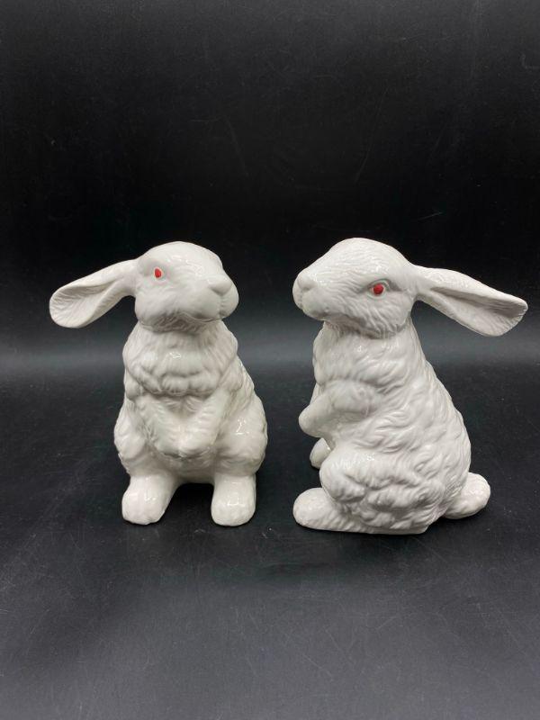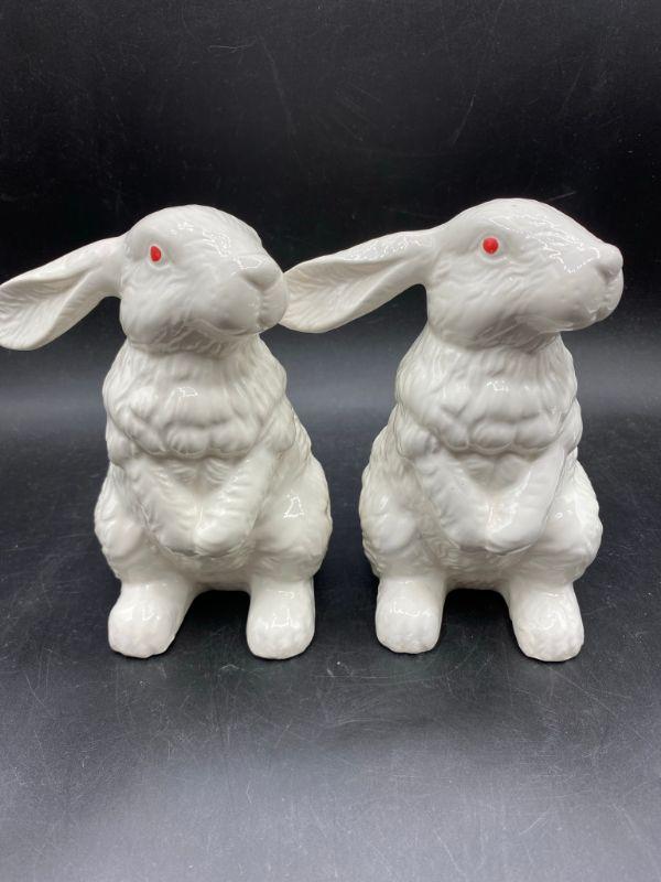 Pair of white ceramic rabbit figurines. Rabbits have red painted eyes. Good condition, no chips. About 6.5" tall. Great inside or in the garden.