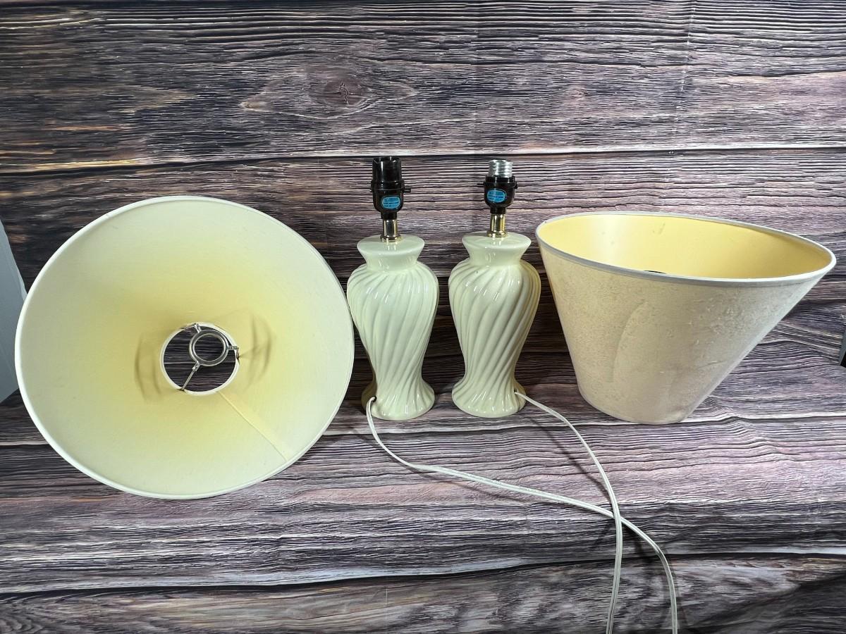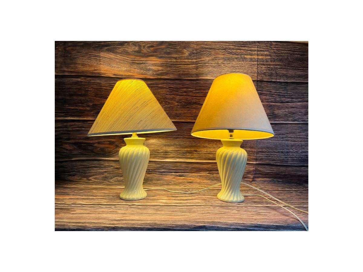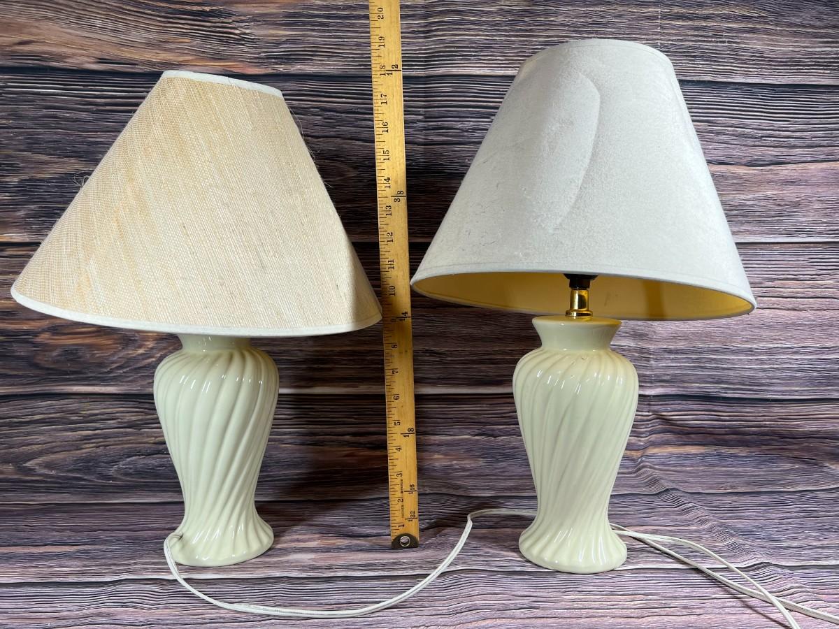 Pair of White Ceramic Underwriters Laboratories Home Decor Table Lamps, one of the lamps has a loose socket as well as some wear to the shades. There is no other significant use or damage and is in good displayable condition. Check pictures for more details and for sizing.