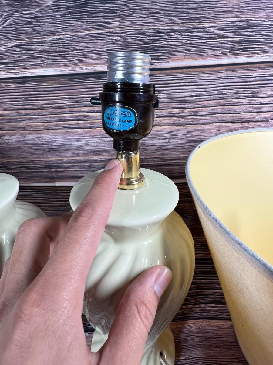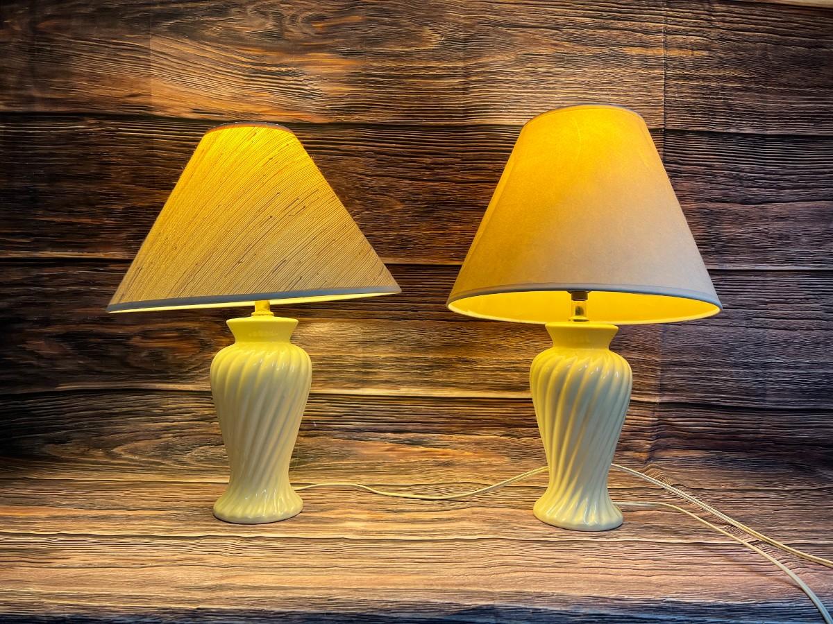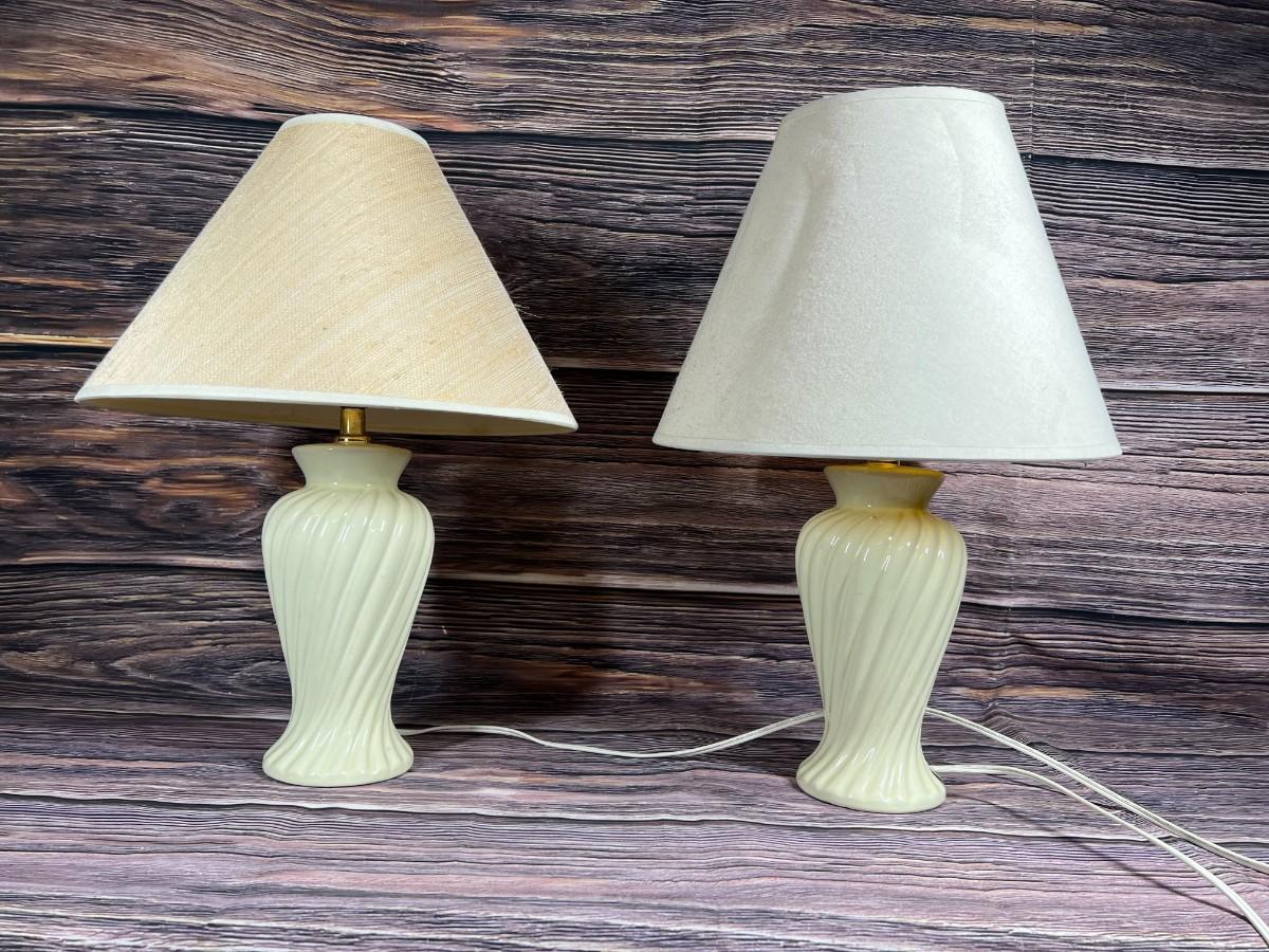 Pair of White Ceramic Underwriters Laboratories Home Decor Table Lamps, one of the lamps has a loose socket as well as some wear to the shades. There is no other significant use or damage and is in good displayable condition. Check pictures for more details and for sizing.