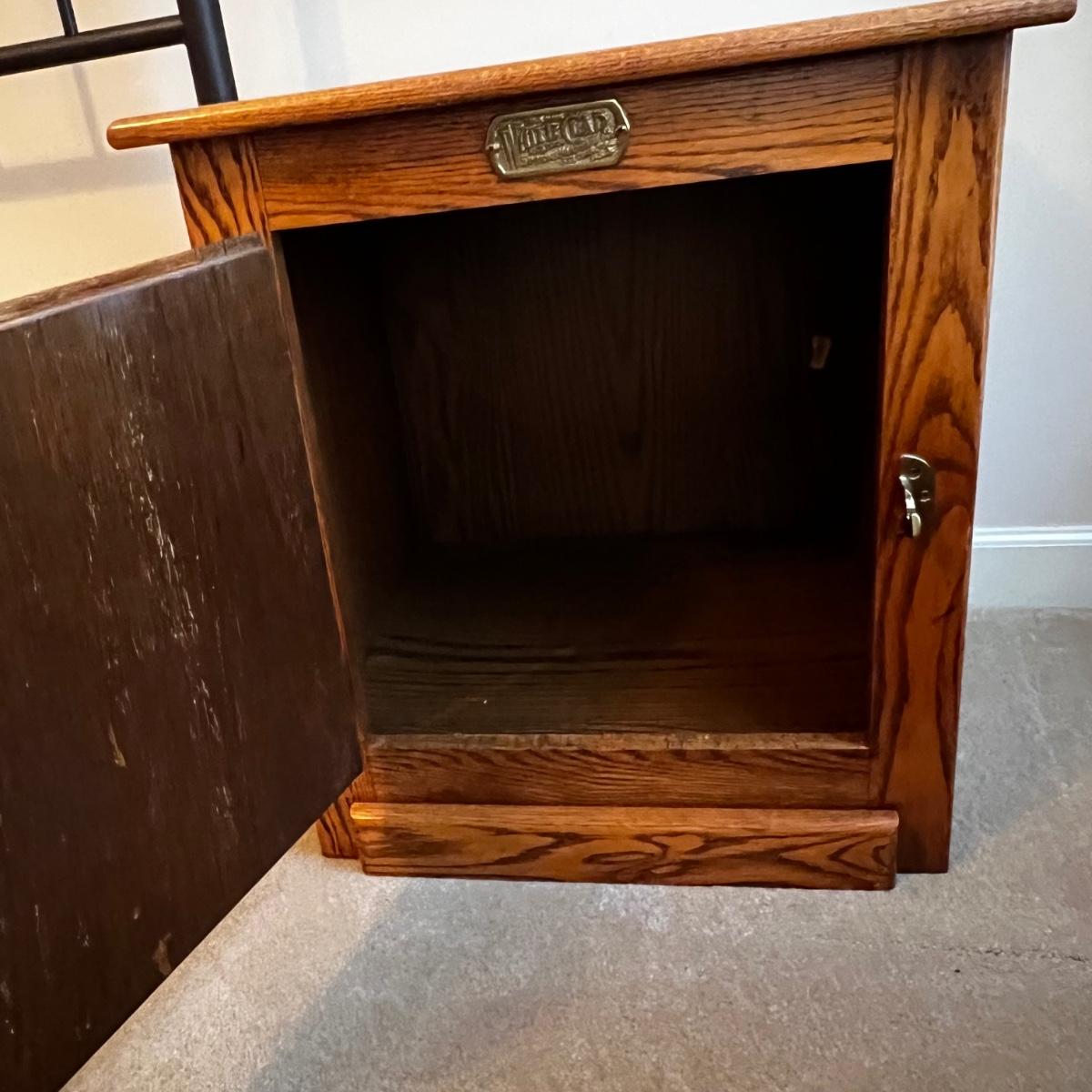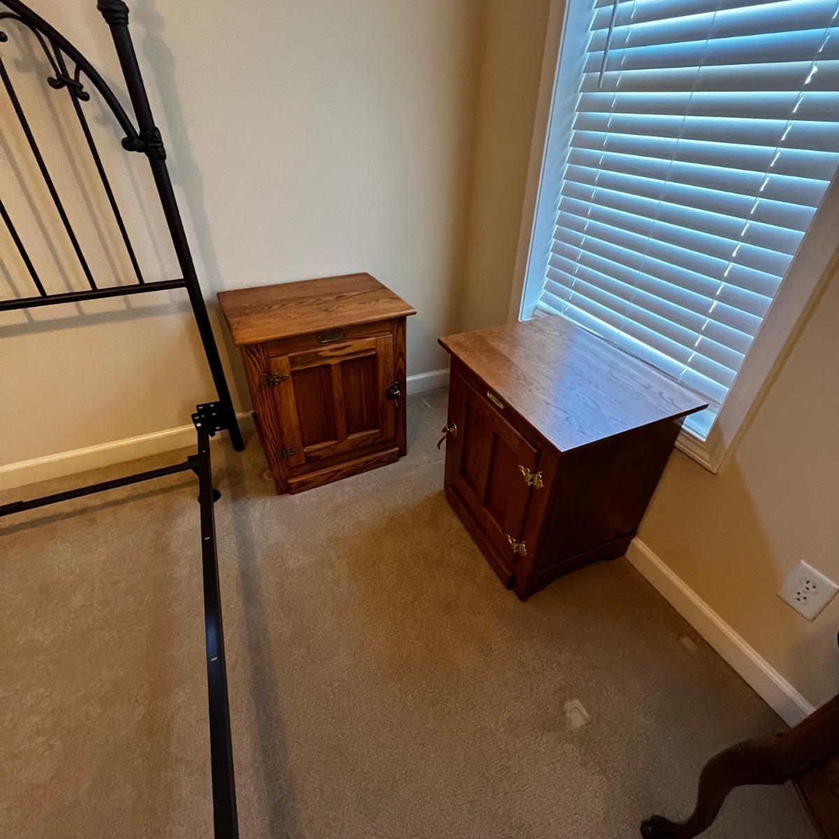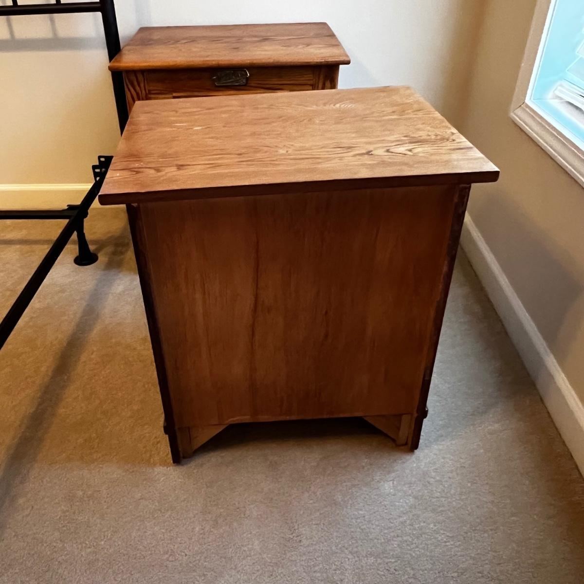 Matching pair of solid oak end tables. They have brass handles and each have a spacious cabinet. They are in the style of an icebox. Few knicks on one are shown in pics.