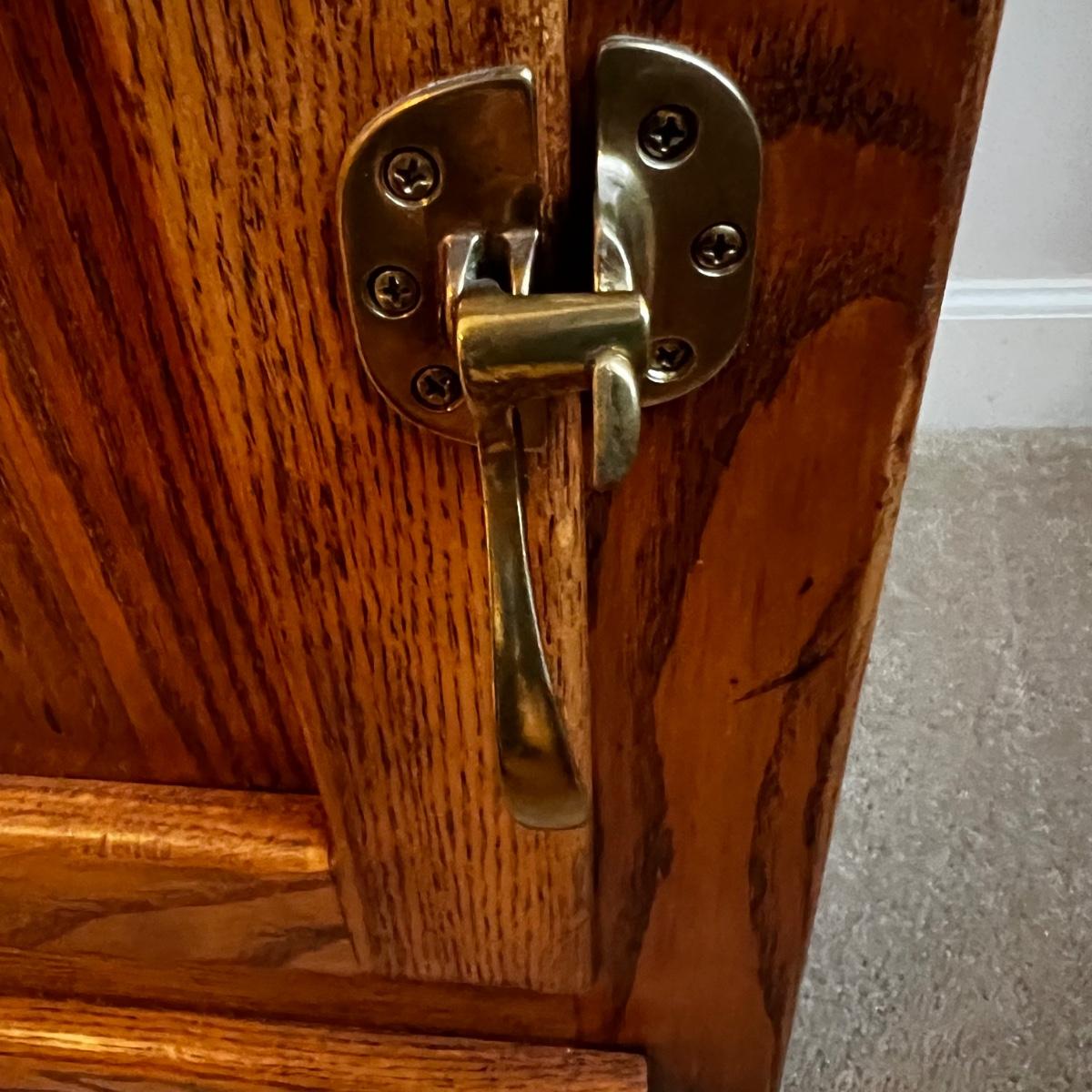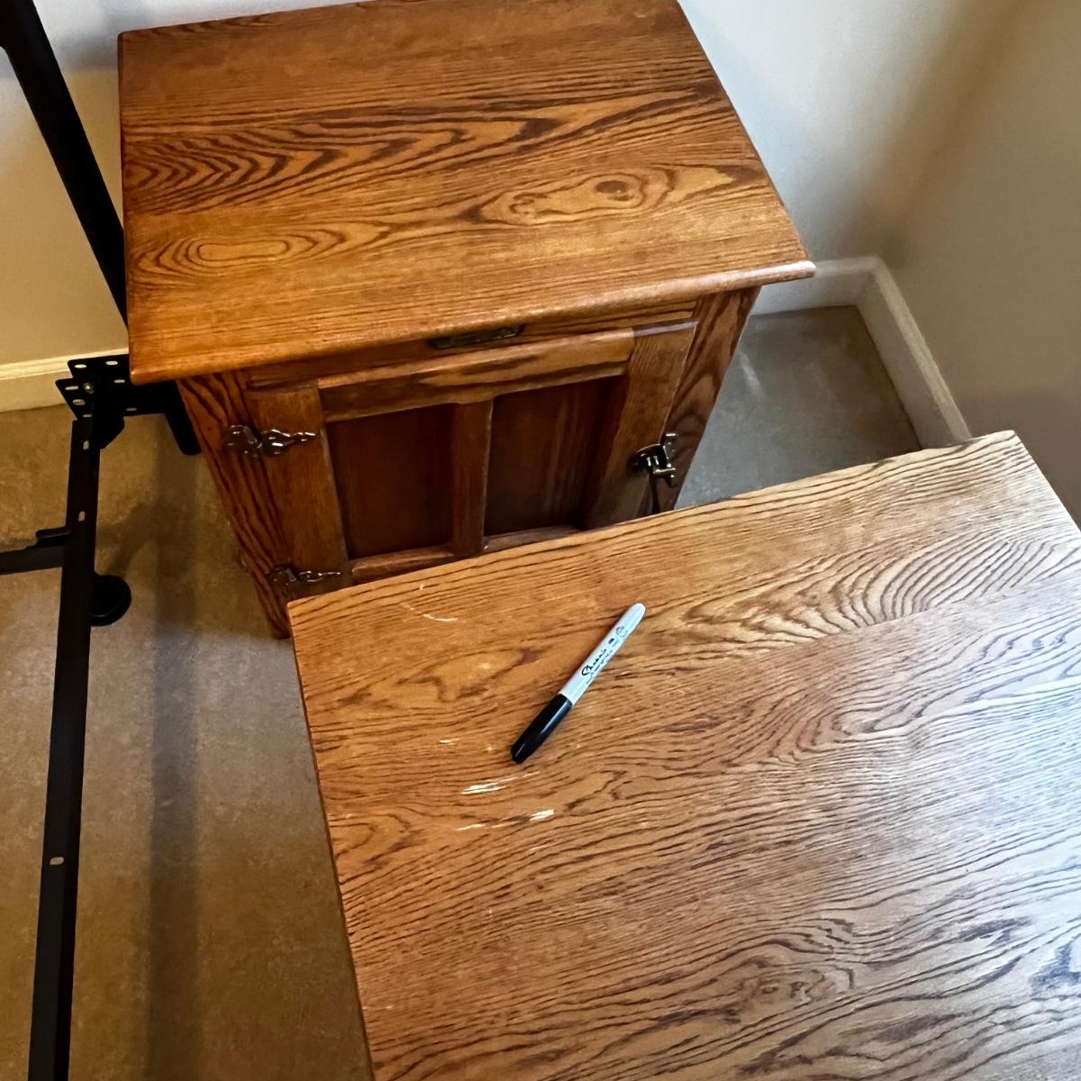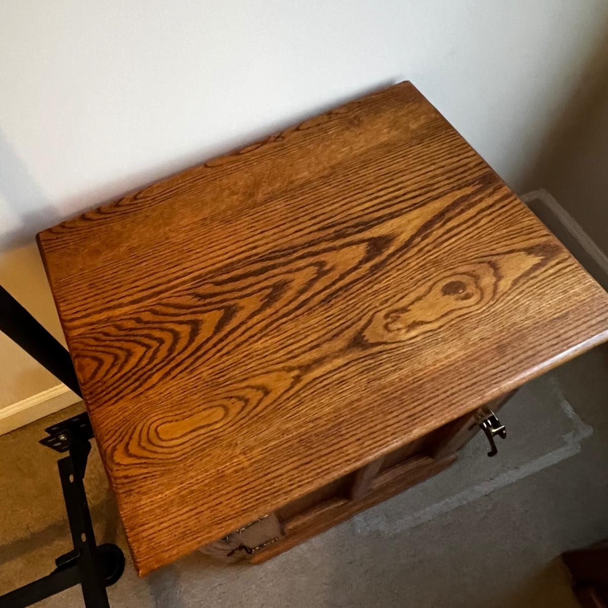 Matching pair of solid oak end tables. They have brass handles and each have a spacious cabinet. They are in the style of an icebox. Few knicks on one are shown in pics.