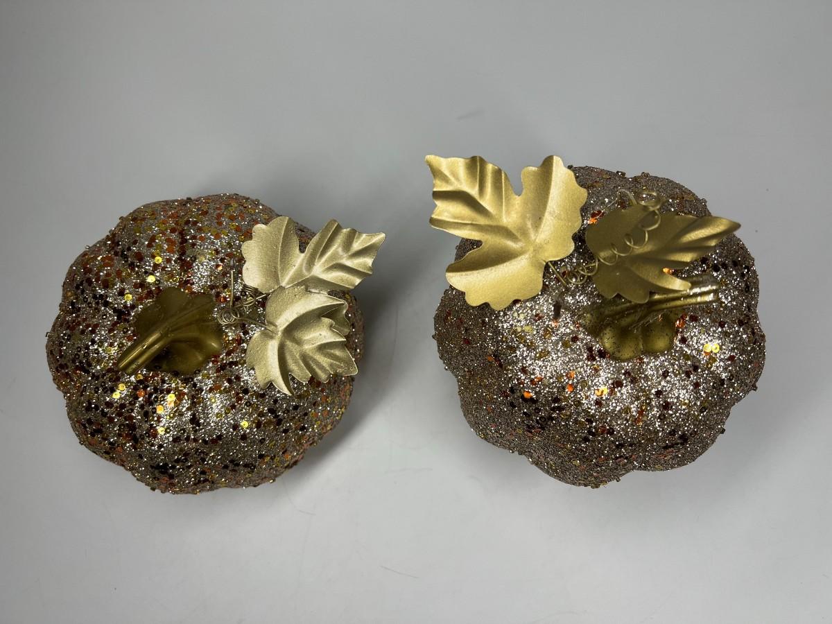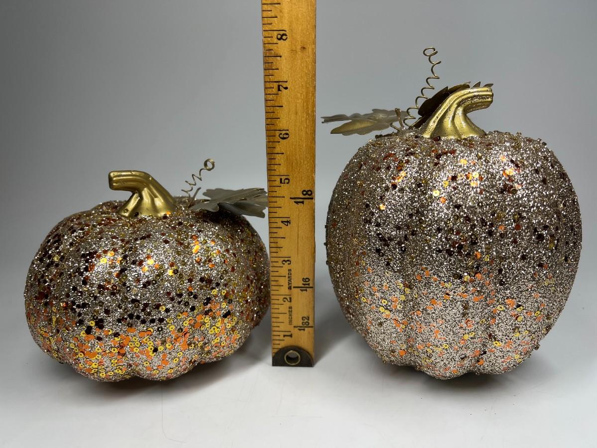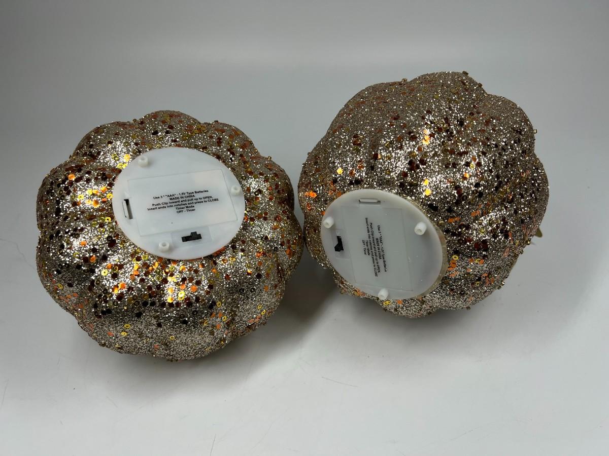 Pair of White & Gold Glitter Holiday Fall Decor Modern Reflective Pumpkins, there is no significant damage to the pumpkins and is in good displayable condition. Has not been tested with new batteries, check pictures for more details and for sizing.