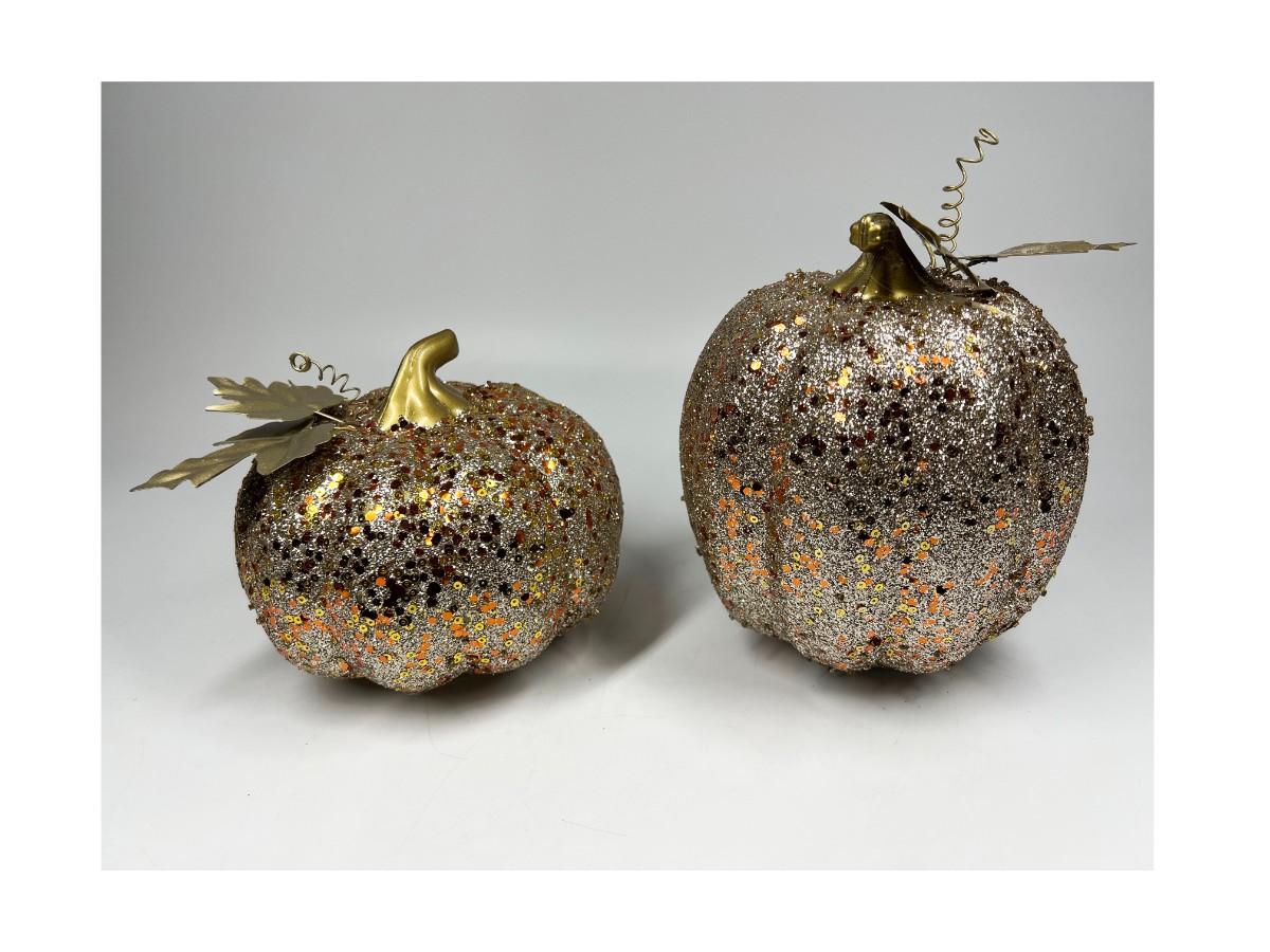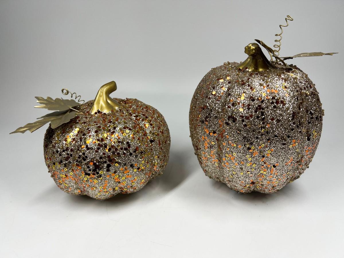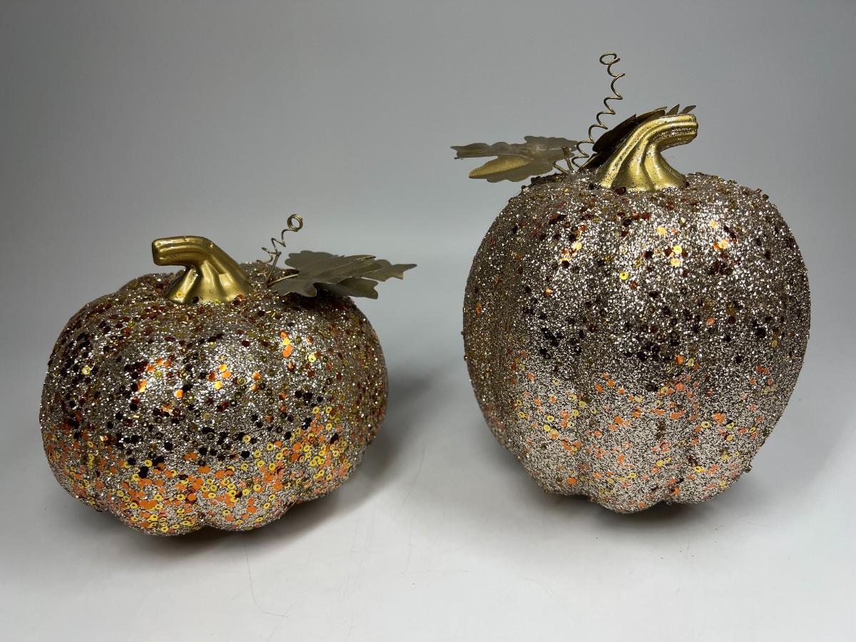 Pair of White & Gold Glitter Holiday Fall Decor Modern Reflective Pumpkins