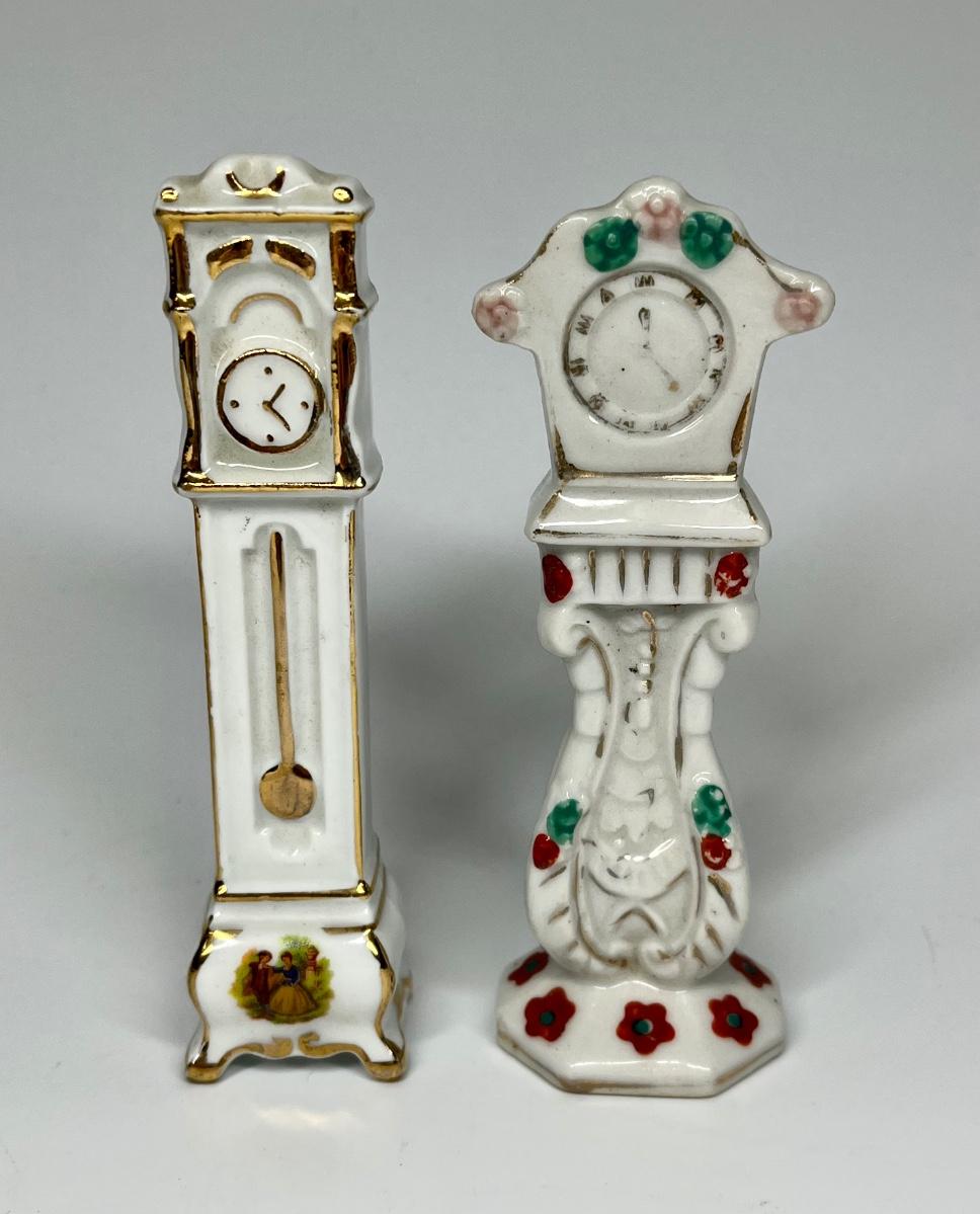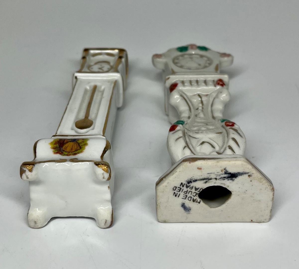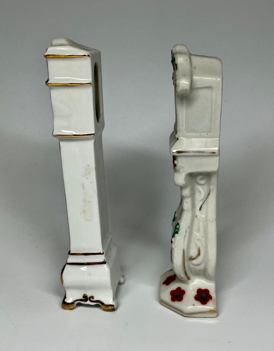 Pair of white with flower pattern grandfather clocks ceramic figurines. One marked made in Occupied Japan.