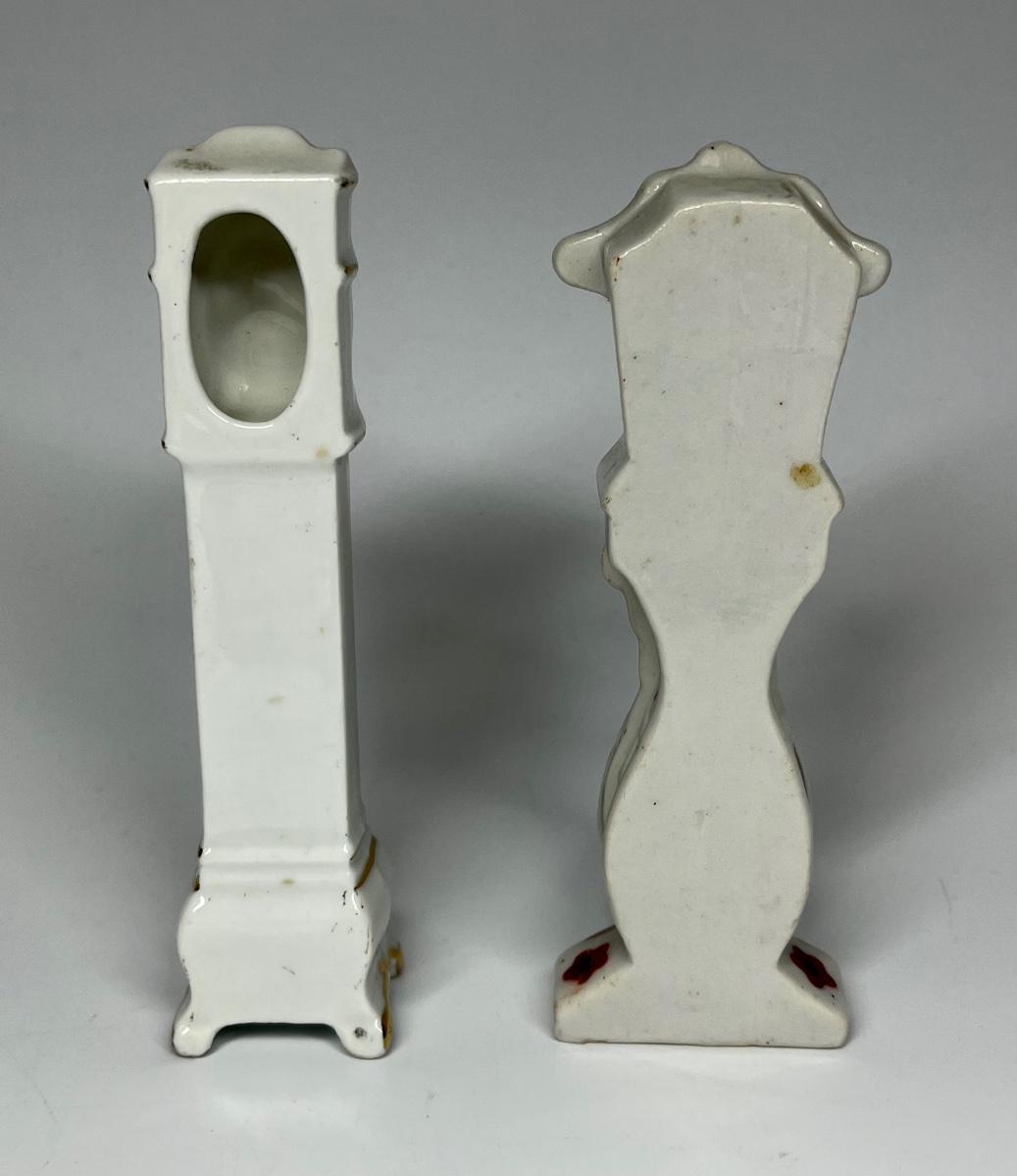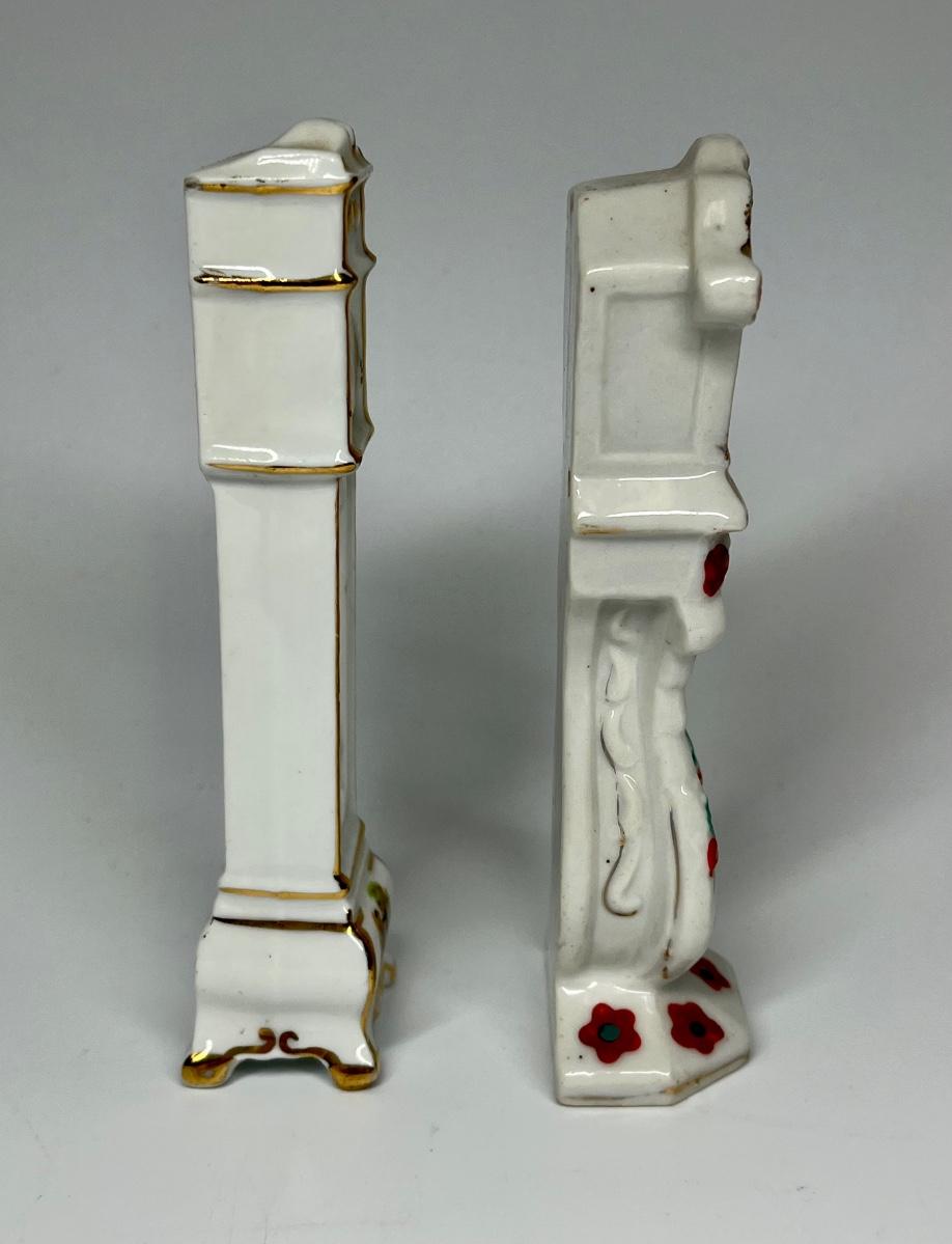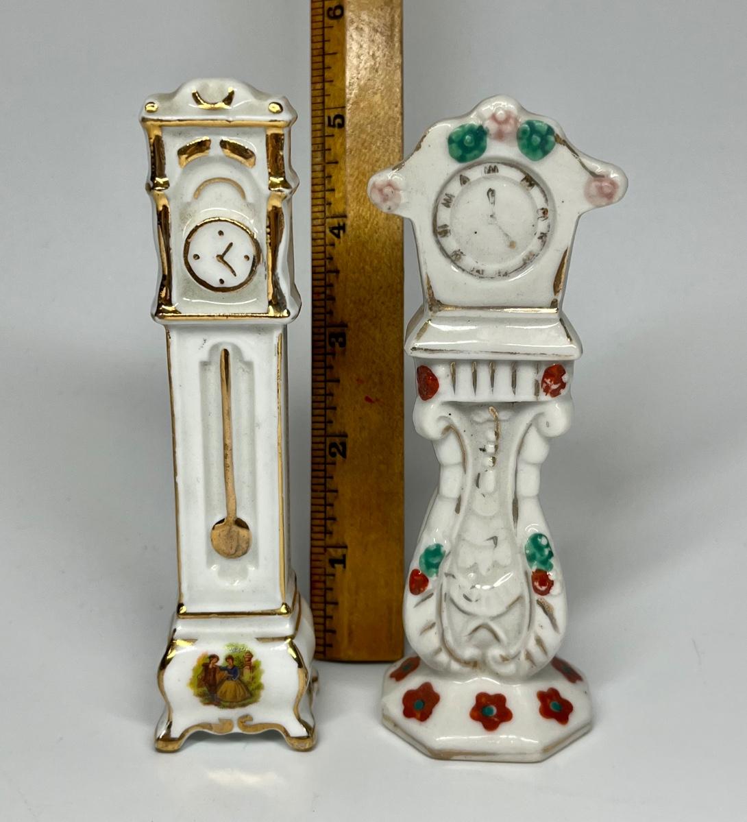 Pair of white with flower pattern grandfather clocks ceramic figurines. One marked made in Occupied Japan.