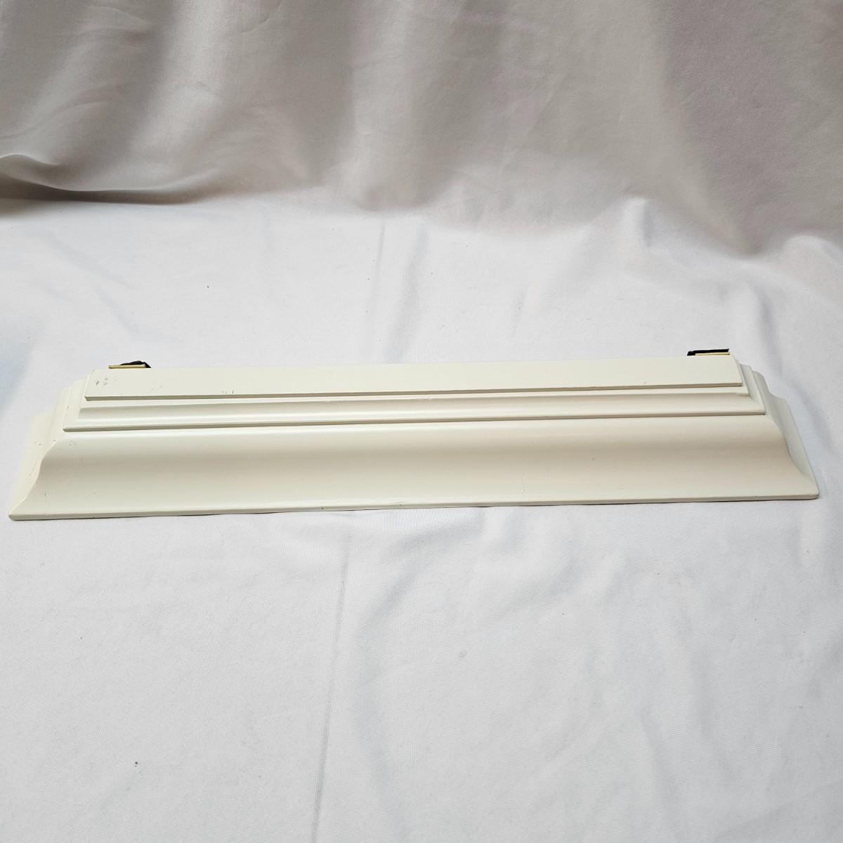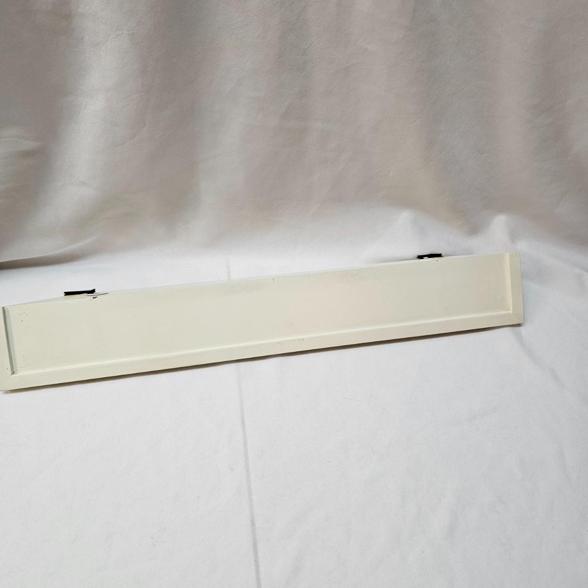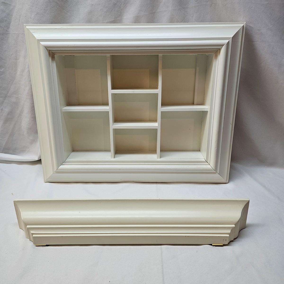 Two wood hanging shelves. Larger unit is a shadowbox with separate compartments, measures 24" x 6" x 19"H. Smaller item can be a complimentary piece or used by itself, has a recessed top with lip to hold items. 24" x 3.5" x 3"H. Both items have keyhole slots for attachment to walls. See photos for details. Local pick up only.