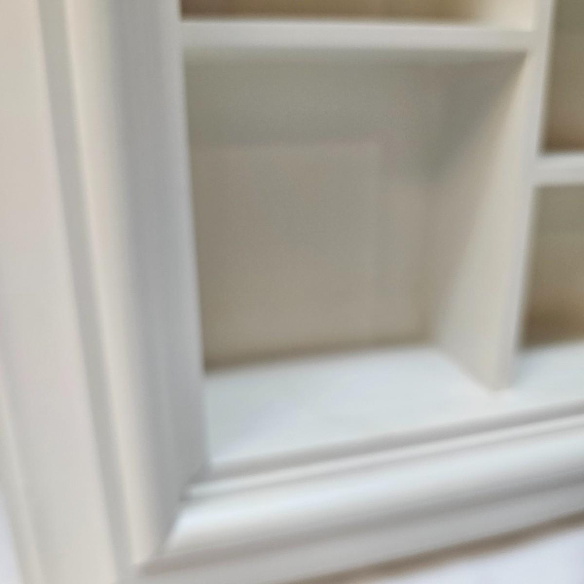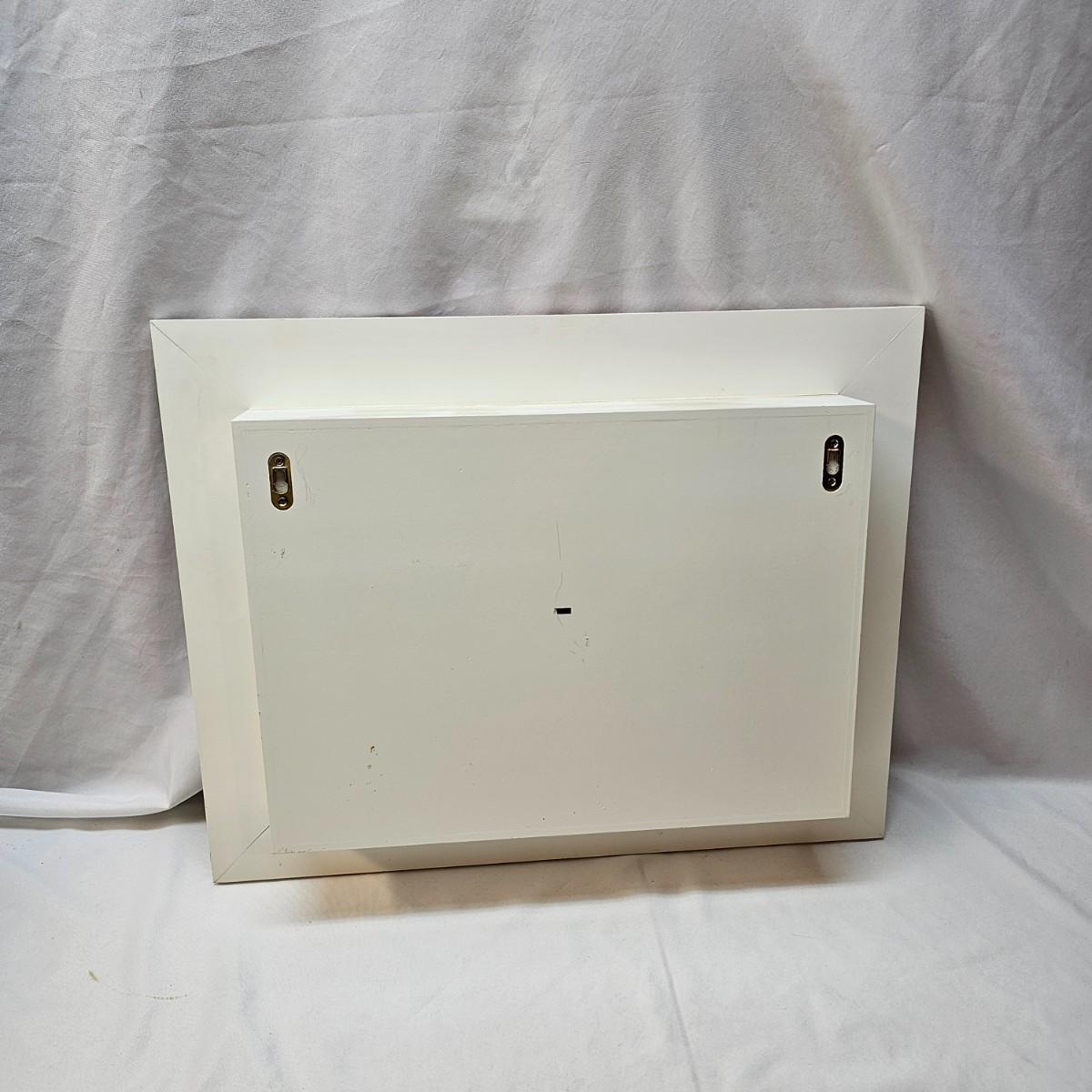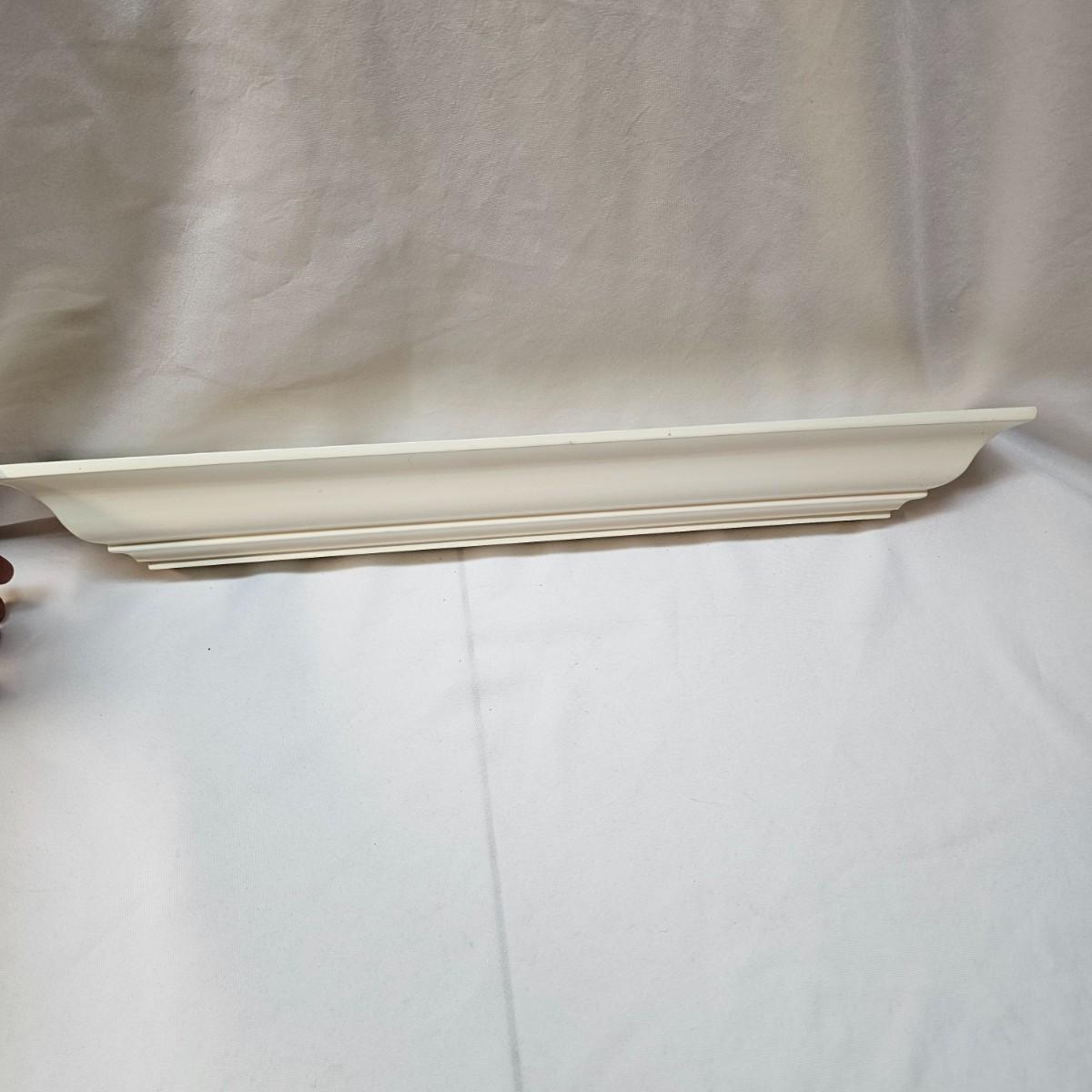 Two wood hanging shelves. Larger unit is a shadowbox with separate compartments, measures 24" x 6" x 19"H. Smaller item can be a complimentary piece or used by itself, has a recessed top with lip to hold items. 24" x 3.5" x 3"H. Both items have keyhole slots for attachment to walls. See photos for details. Local pick up only.