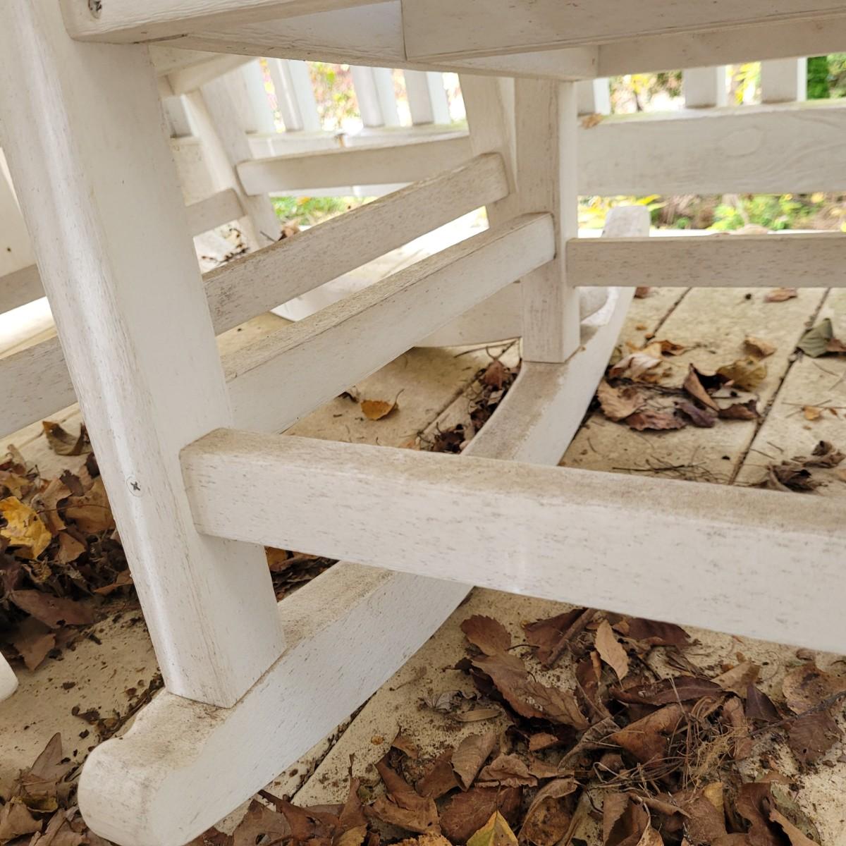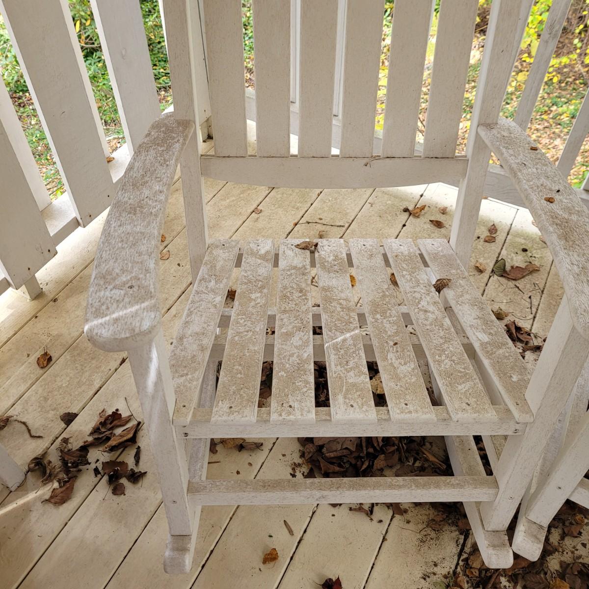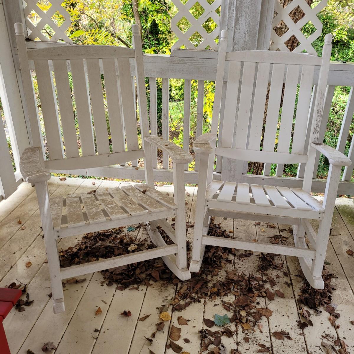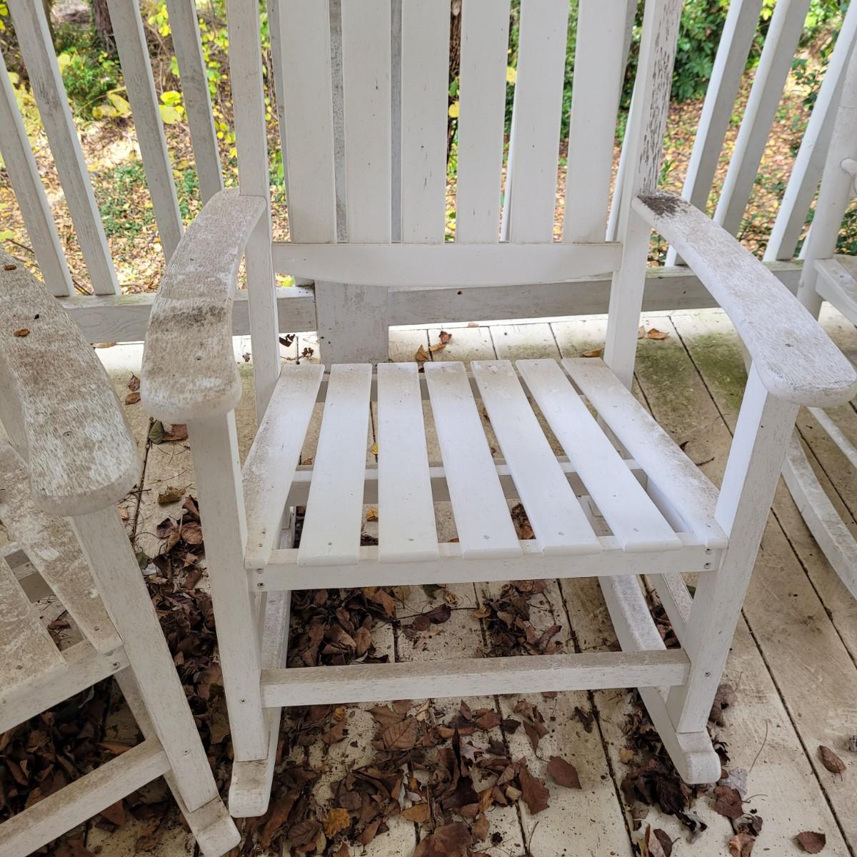 Two very sturdy wooden rocking chairs. All fastenings are securely in place. Accumulation of dirt seems to clean easily. Measure approximately 26"L x30.5"W x44"H, seat height 18.5"H. Local pickup only.
