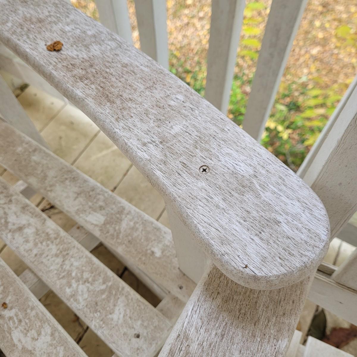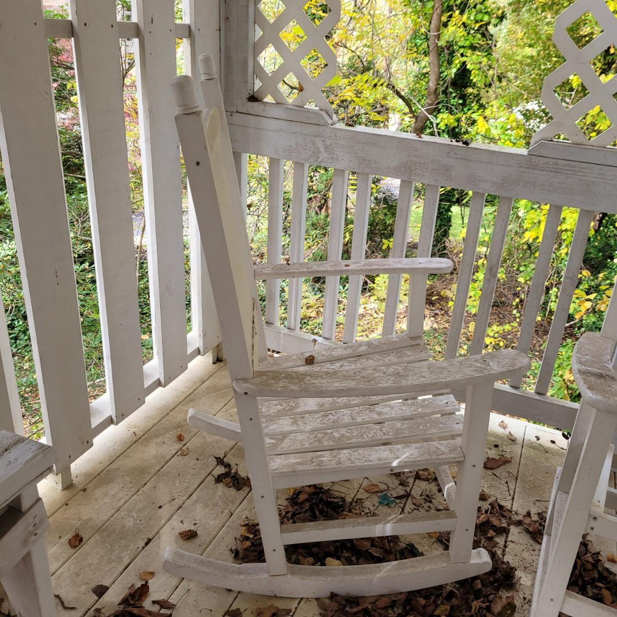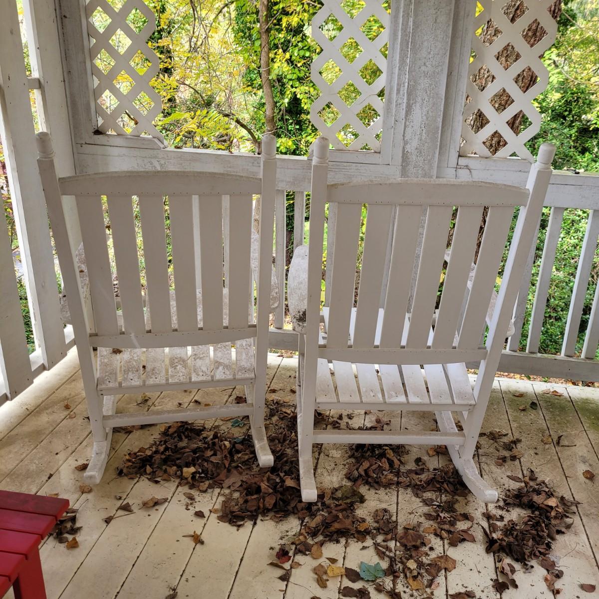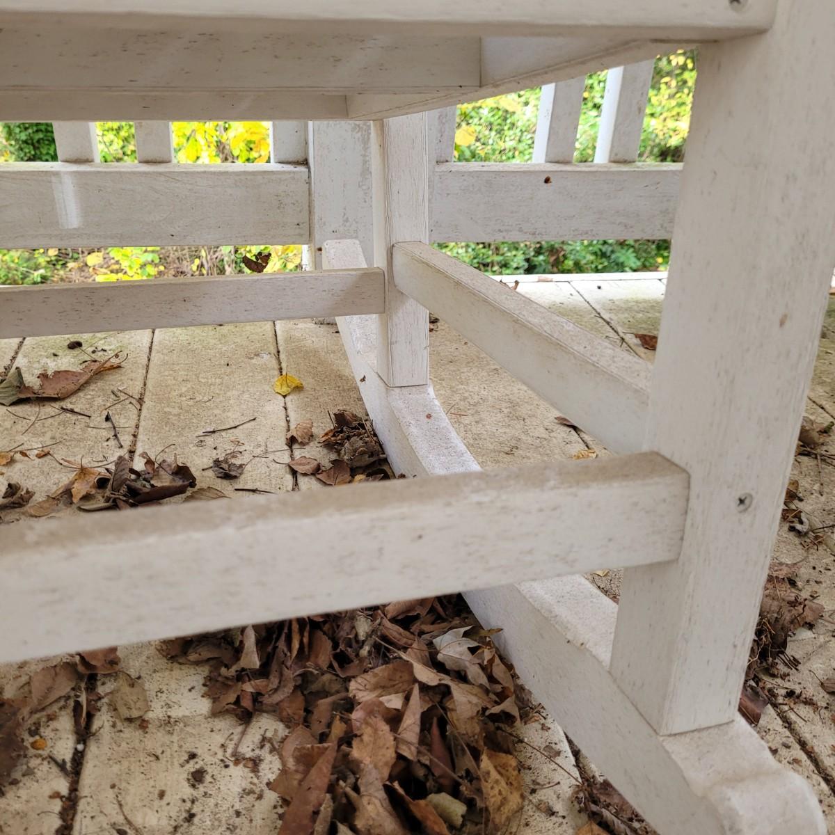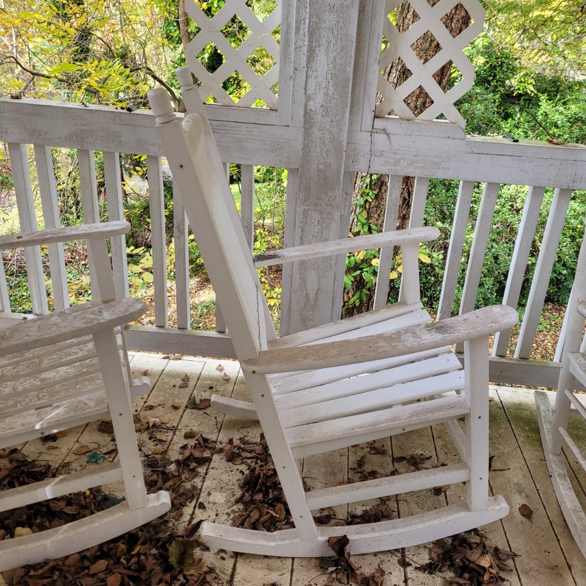 Two very sturdy wooden rocking chairs. All fastenings are securely in place. Accumulation of dirt seems to clean easily. Measure approximately 26"L x30.5"W x44"H, seat height 18.5"H. Local pickup only.