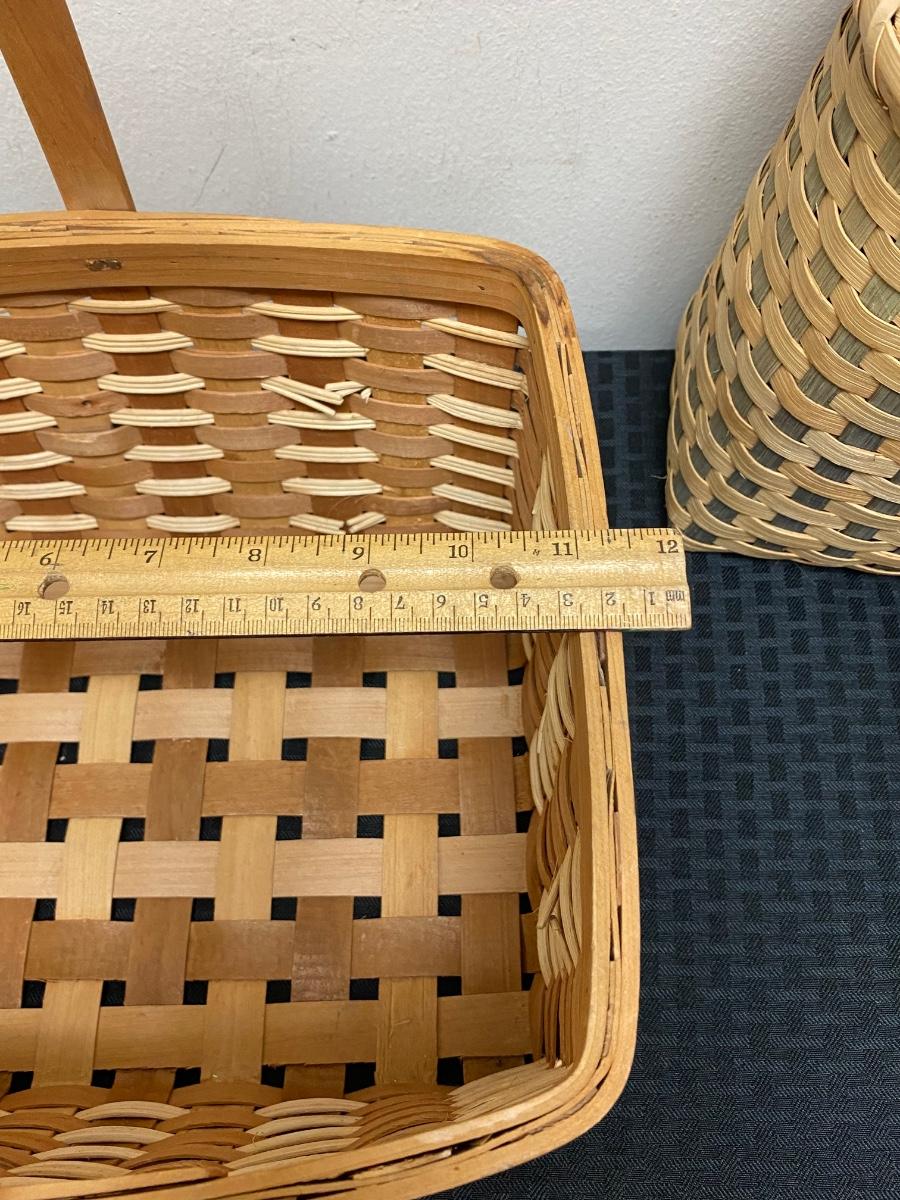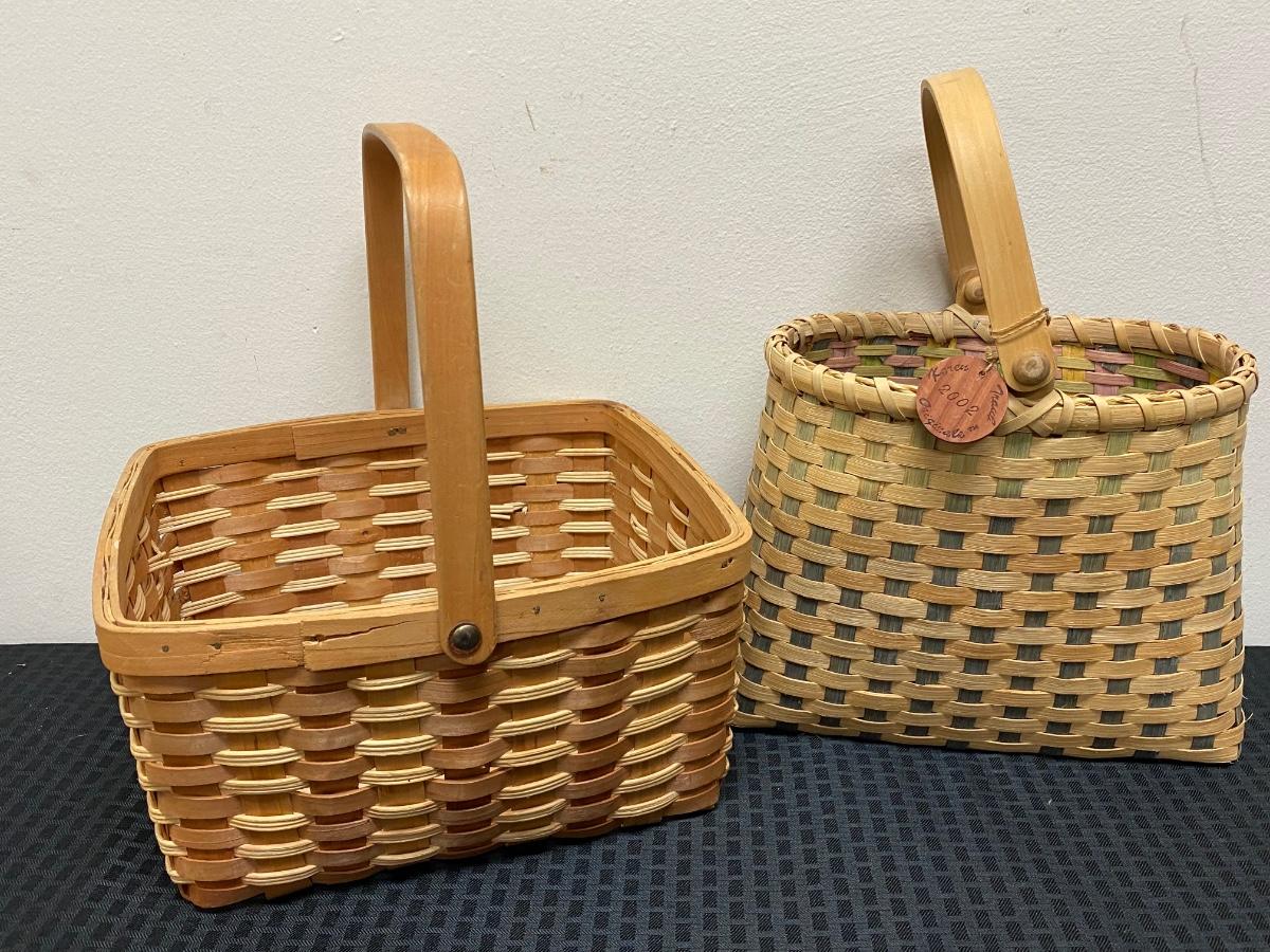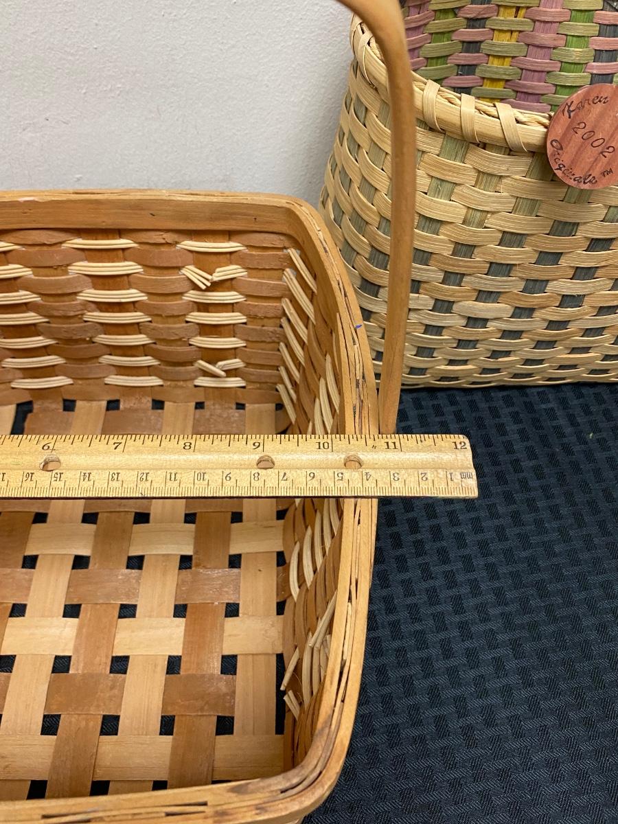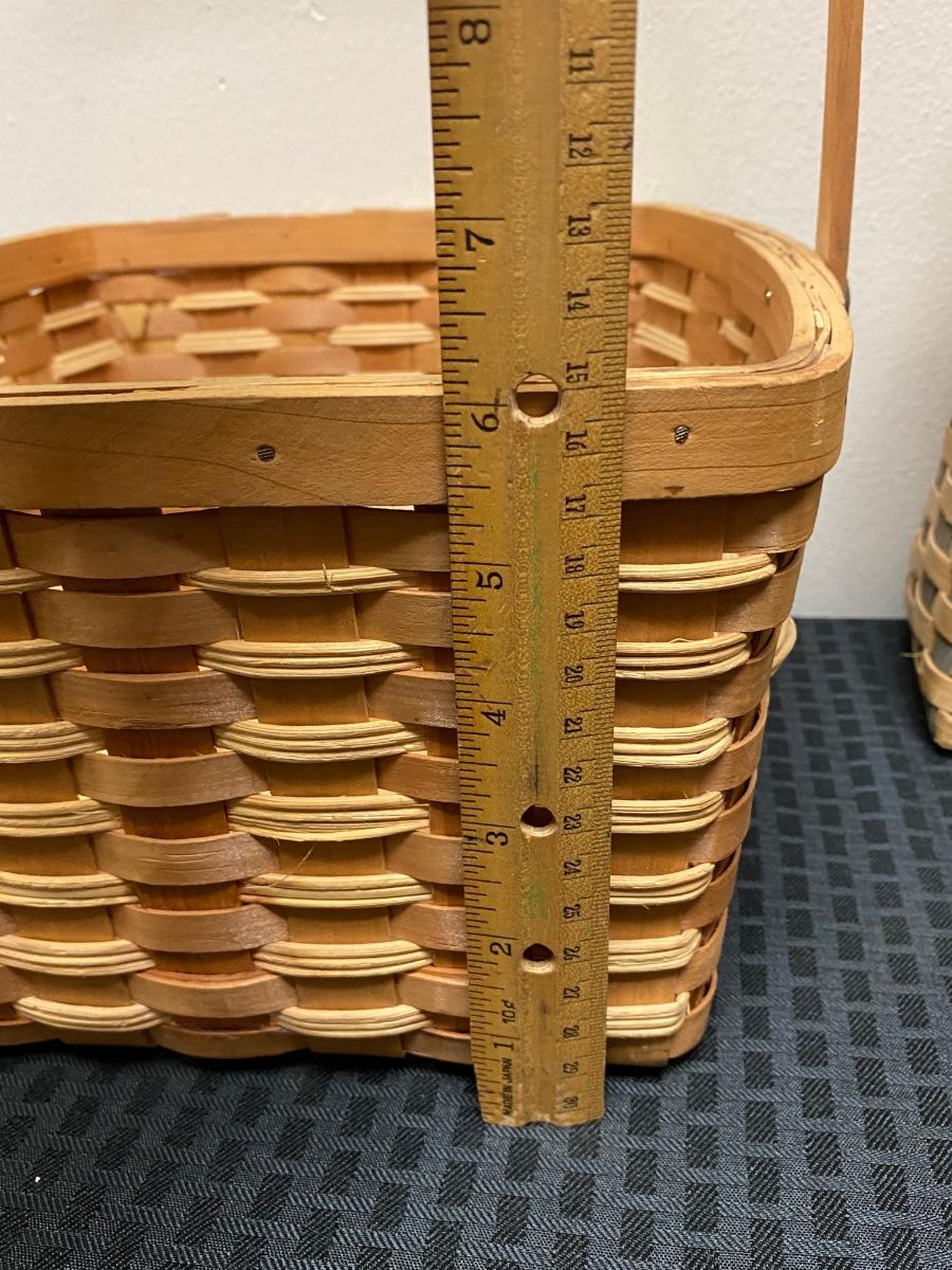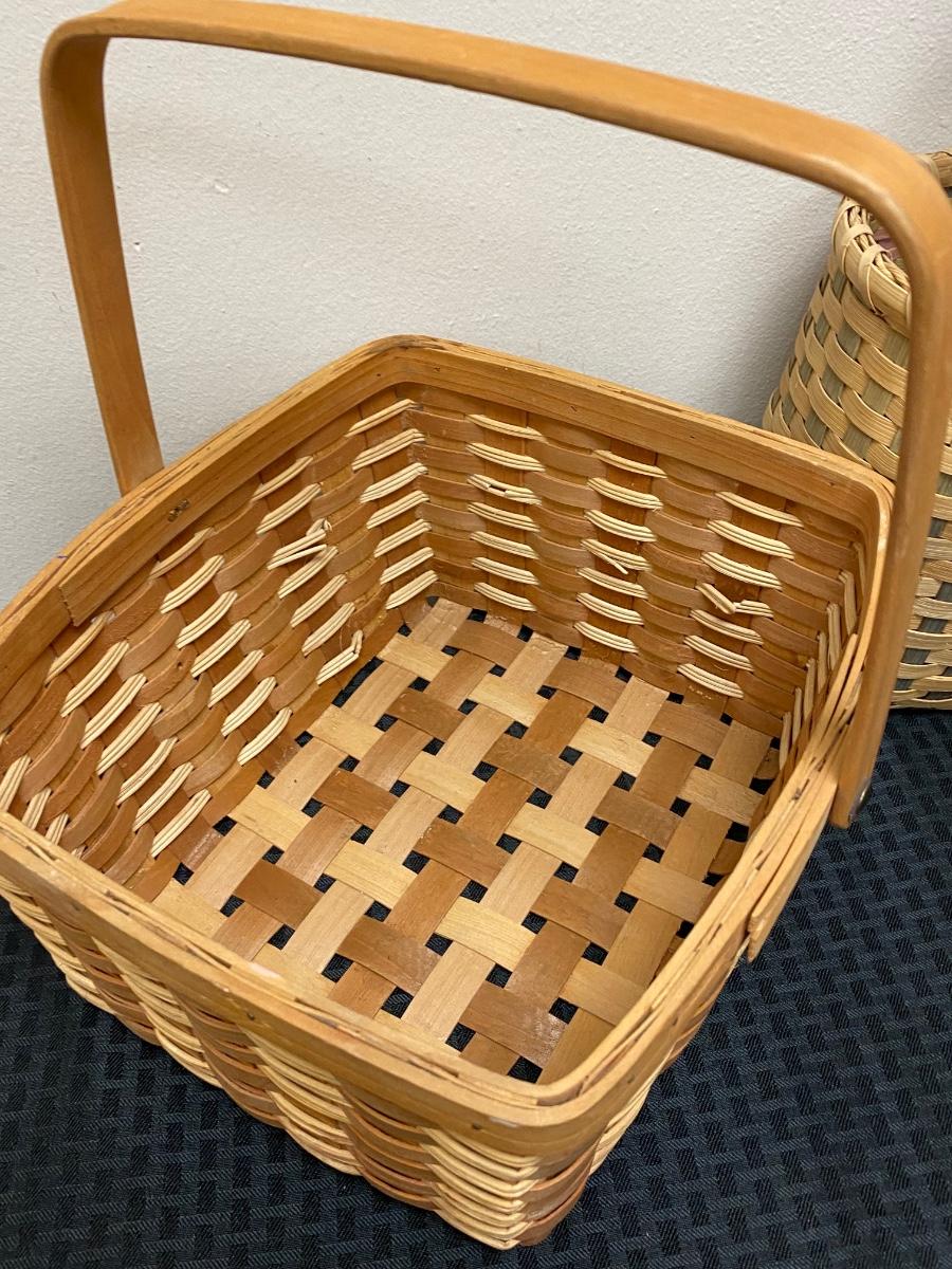 Pair of nice woven wood baskets. Good condition, both with handles.