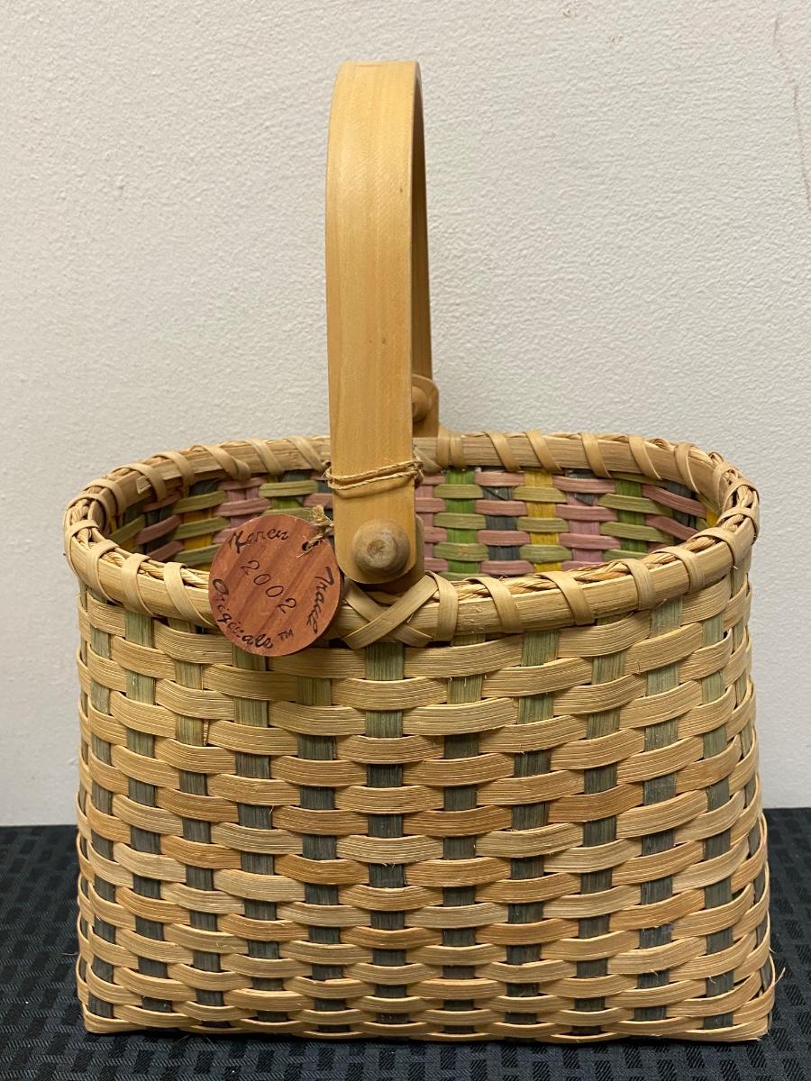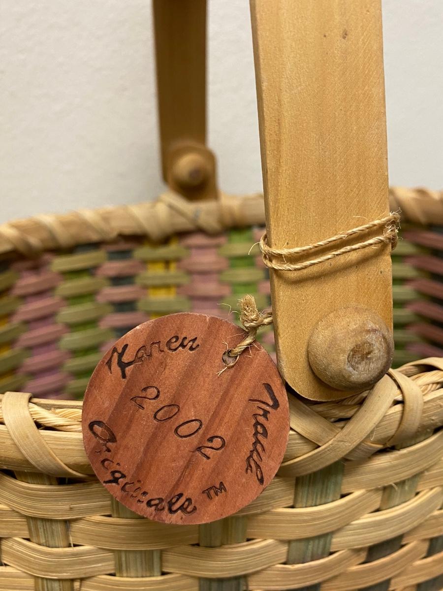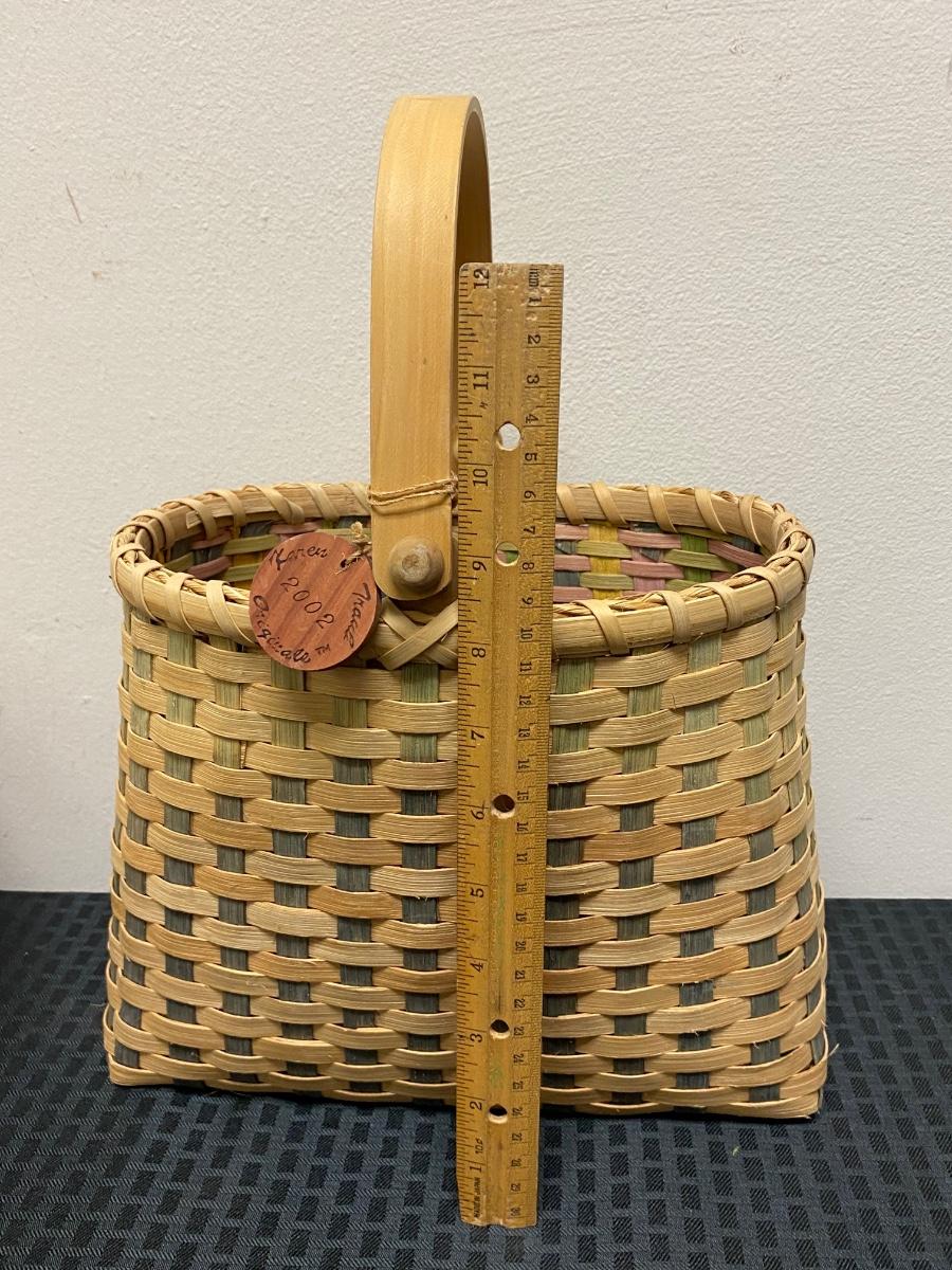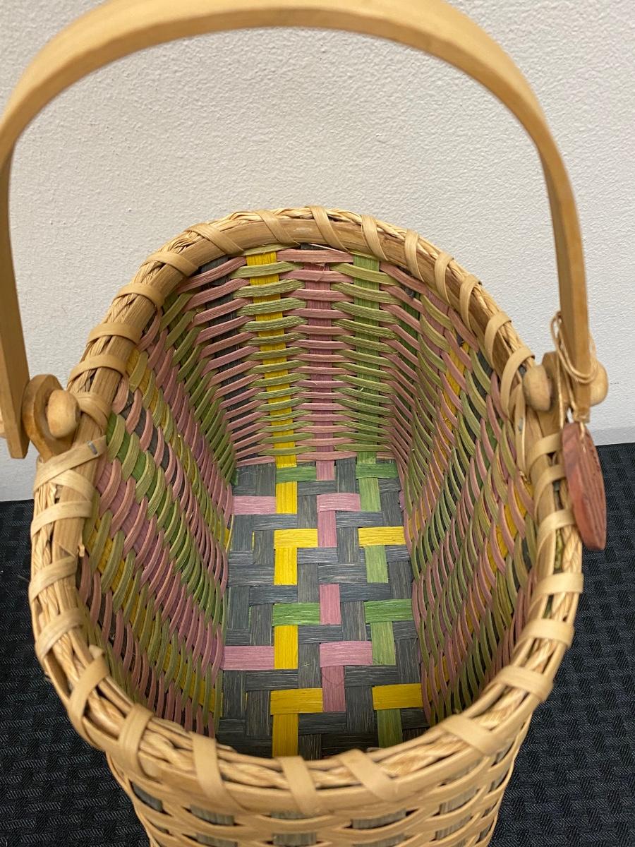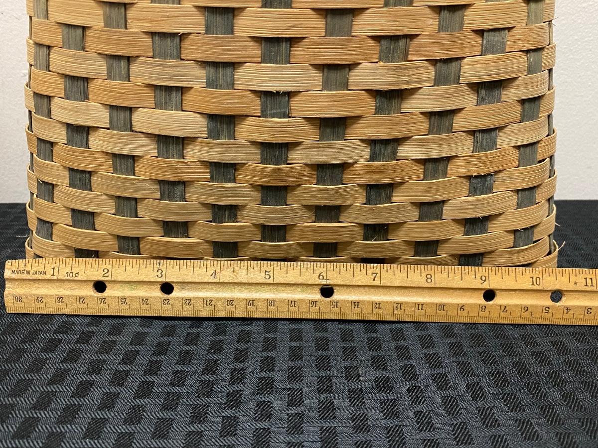 Pair of nice woven wood baskets. Good condition, both with handles.