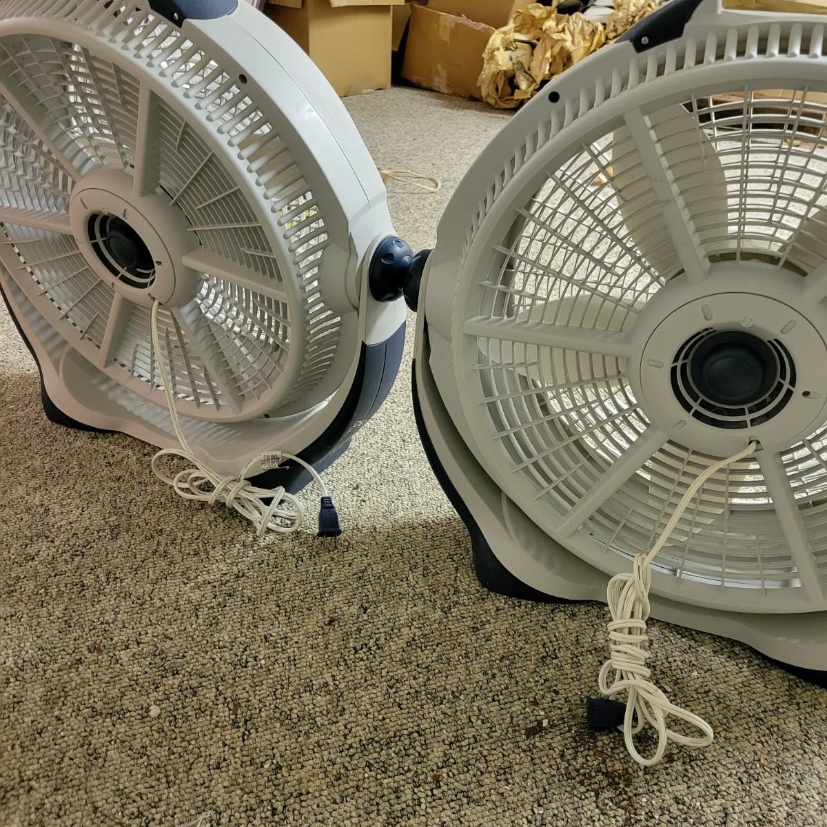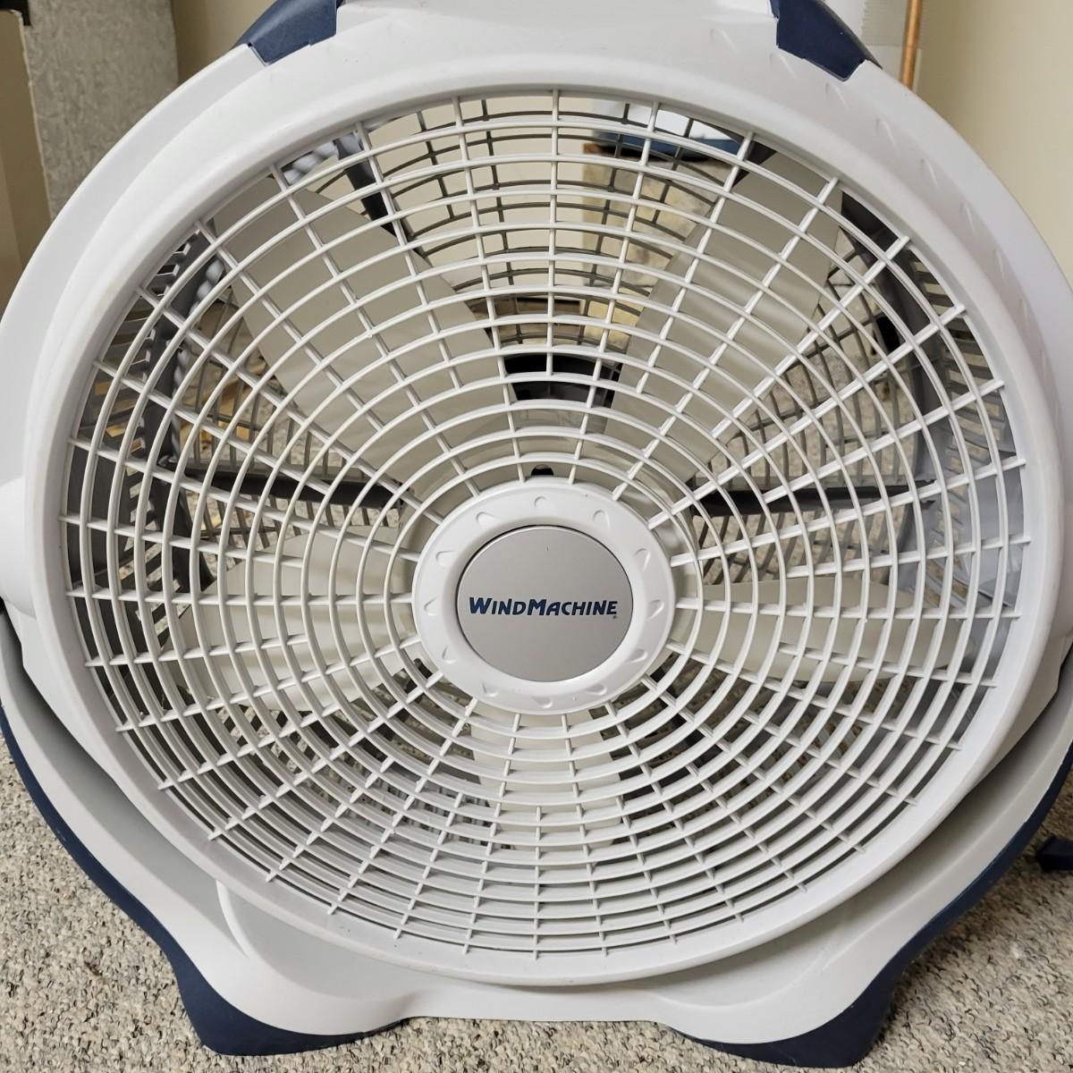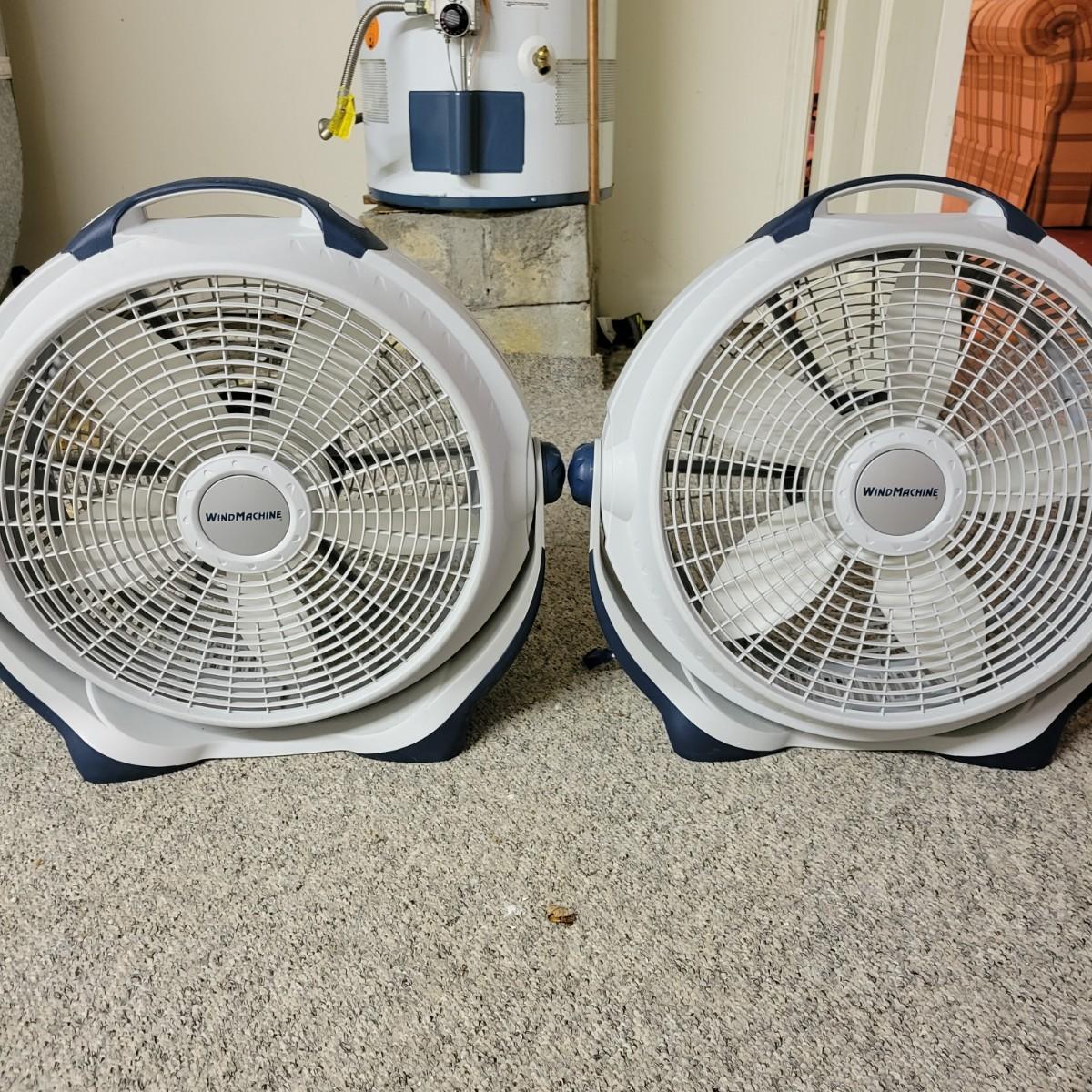 A pair of Wind Machine fans in good condition with no notable damage. Both fans were tested and work. Each has 3 setting and pivot on their bases. Measures approximately 24" x 7" x 24" Local pickup only