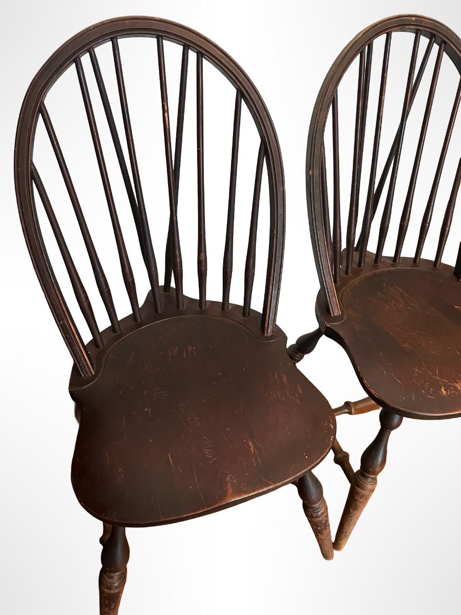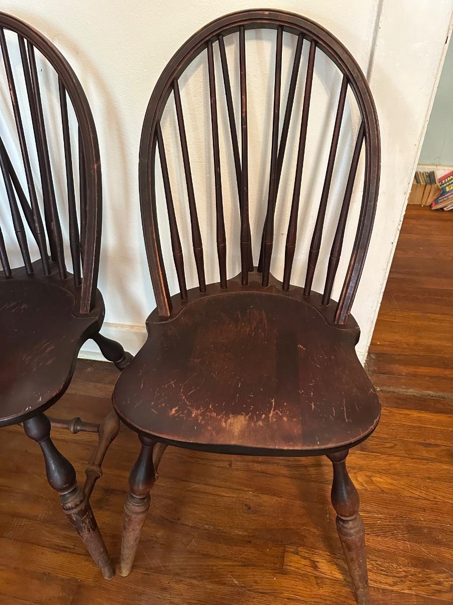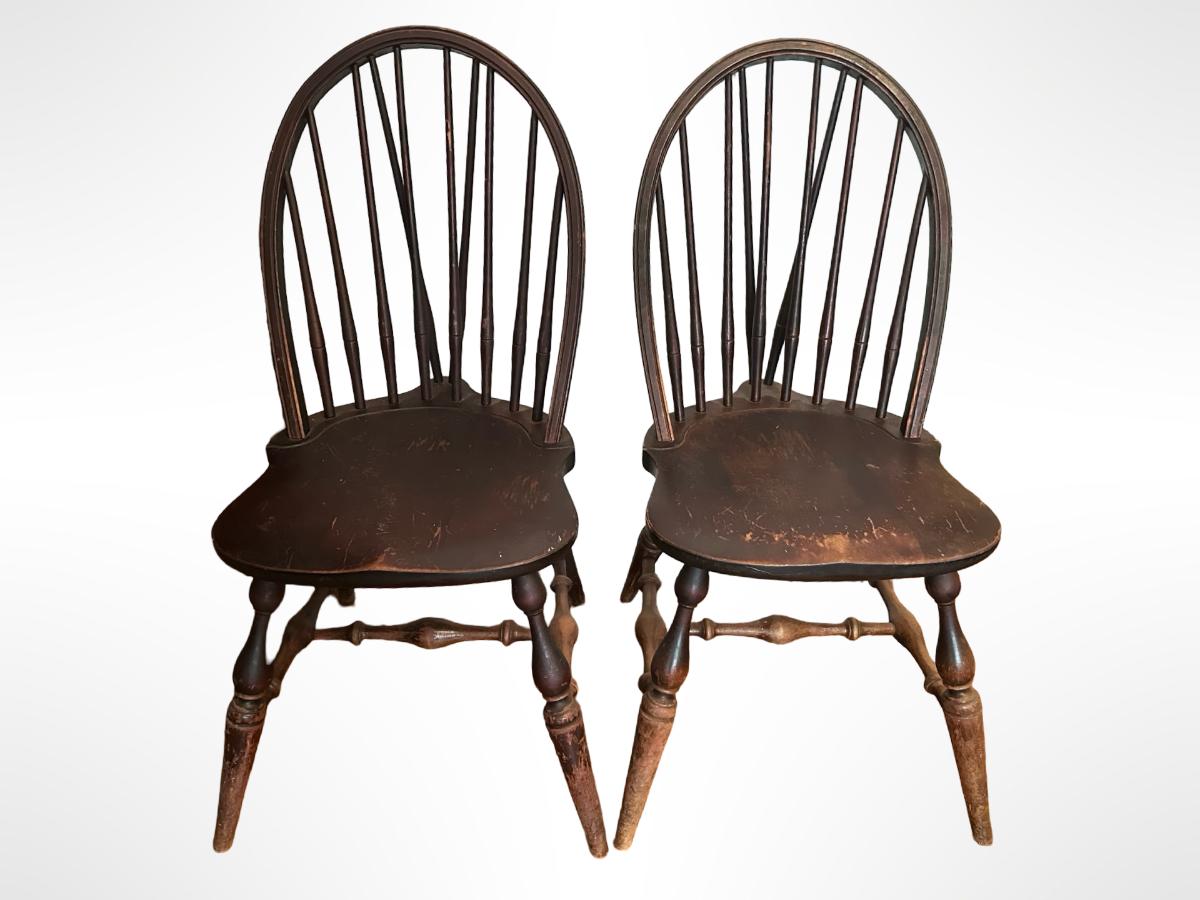 Pair of vintage Windsor-style side chairs featuring arched bow backs, saddle-carved seats, and turned splayed legs with stretcher supports. Dark stained finish with areas of wear, scuffs, and finish loss consistent with age and use.