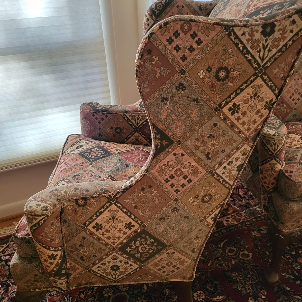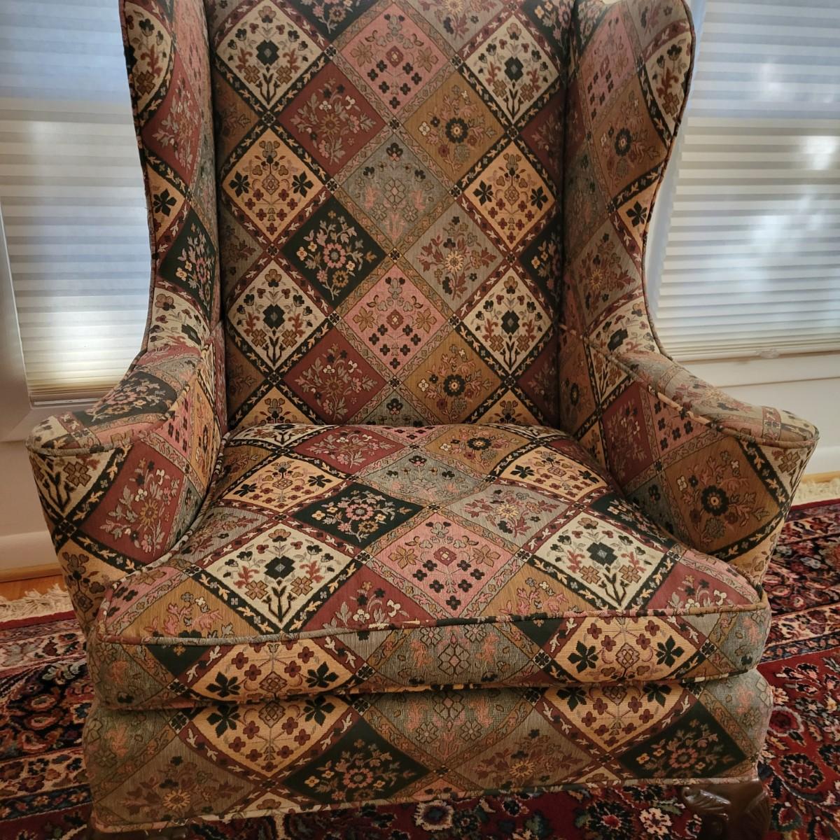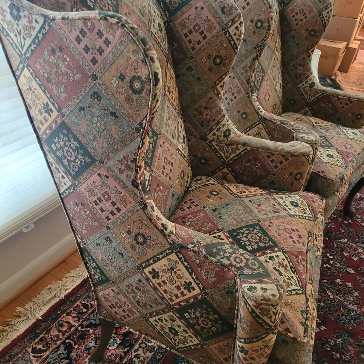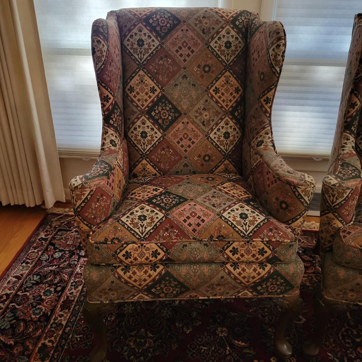 A pair of upholstered wingback armchairs in good condition with no notable damage. These chairs are upholstered with patchwork of floral patterns in a variety of colors and have carved wooden legs. Each chair measures approximately 32" x 30" x 42.5" and a seat height of 20". Winning bidder will need to bring assistance to move due to heaviness. Local pickup only