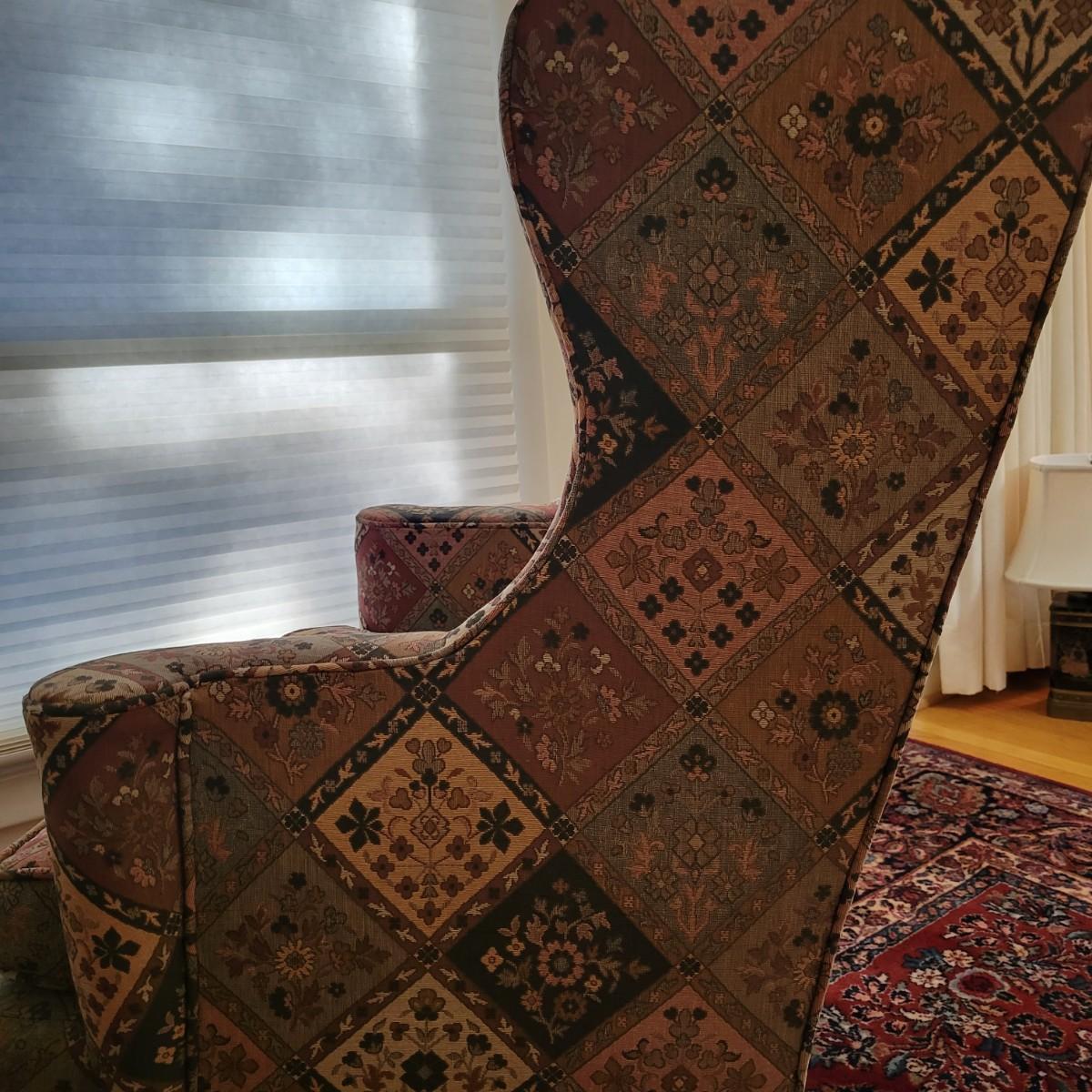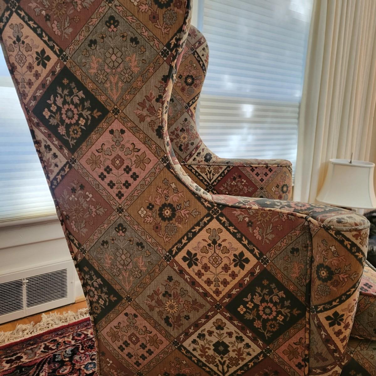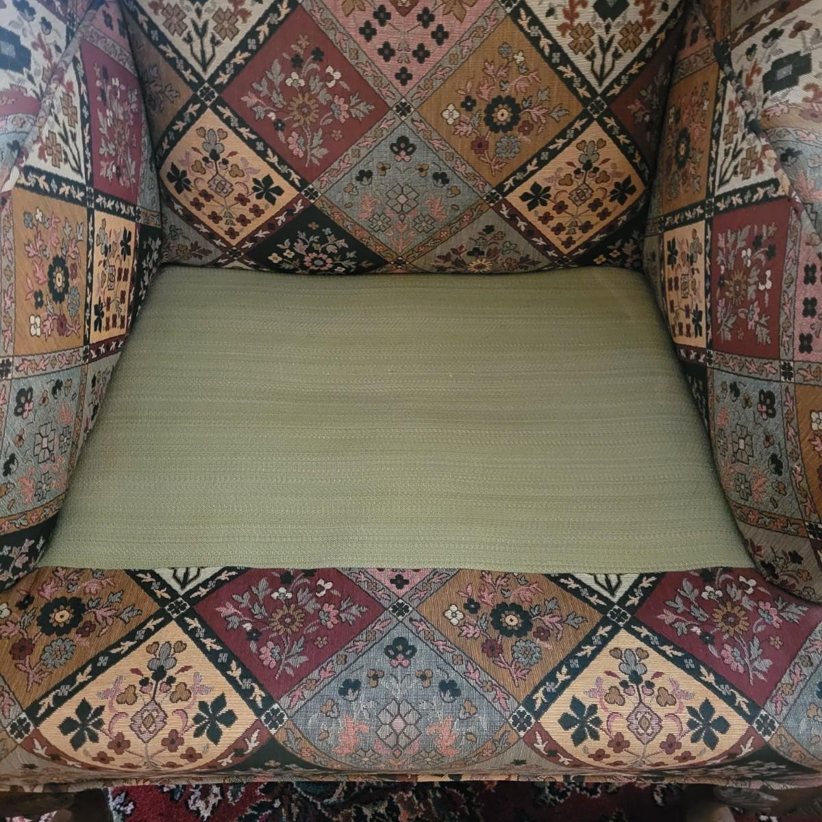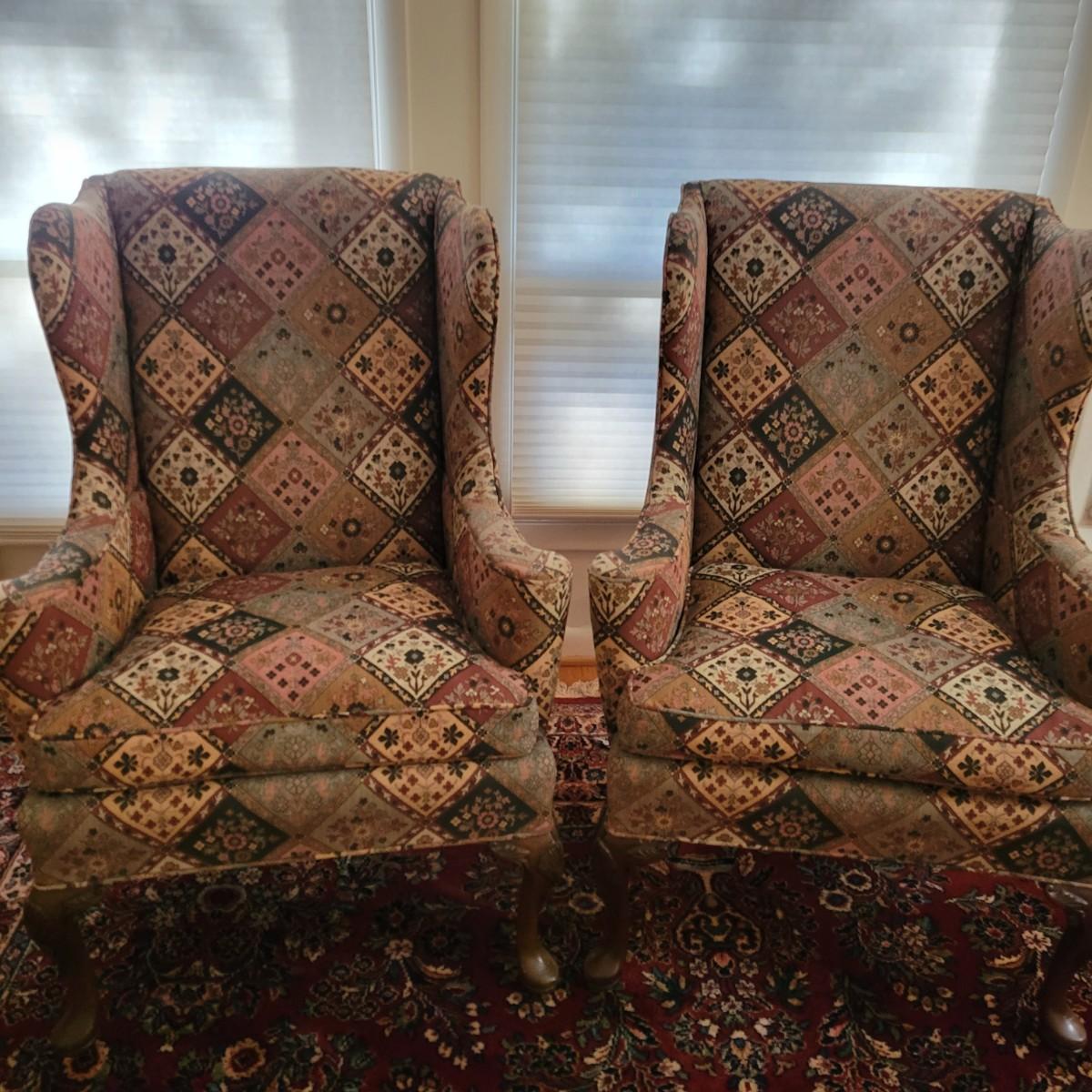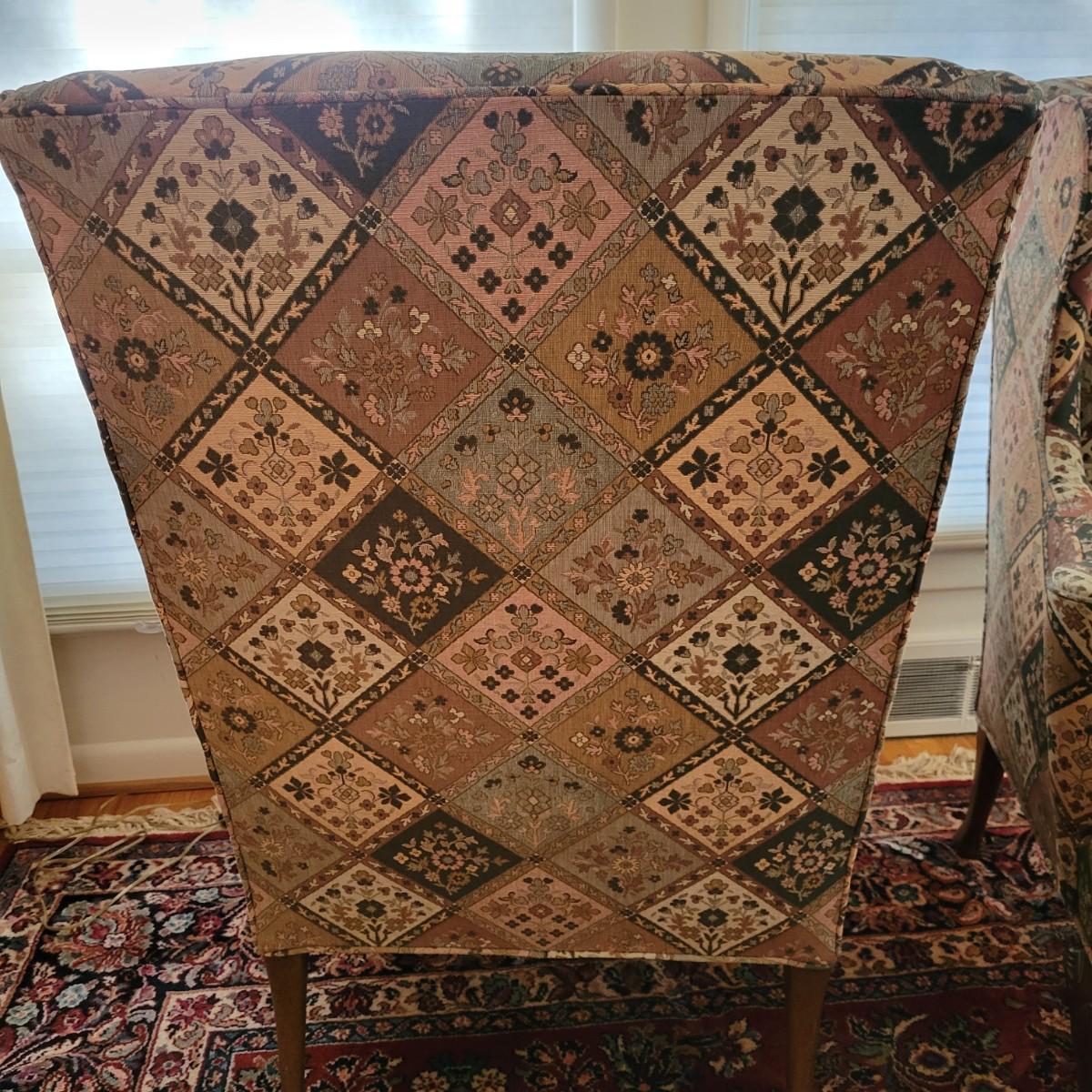 A pair of upholstered wingback armchairs in good condition with no notable damage. These chairs are upholstered with patchwork of floral patterns in a variety of colors and have carved wooden legs. Each chair measures approximately 32" x 30" x 42.5" and a seat height of 20". Winning bidder will need to bring assistance to move due to heaviness. Local pickup only