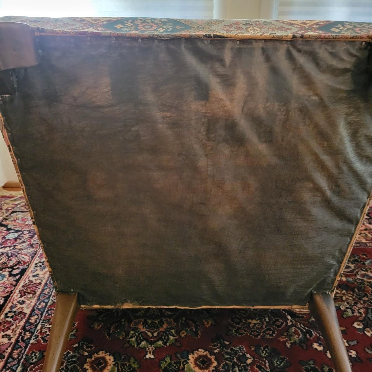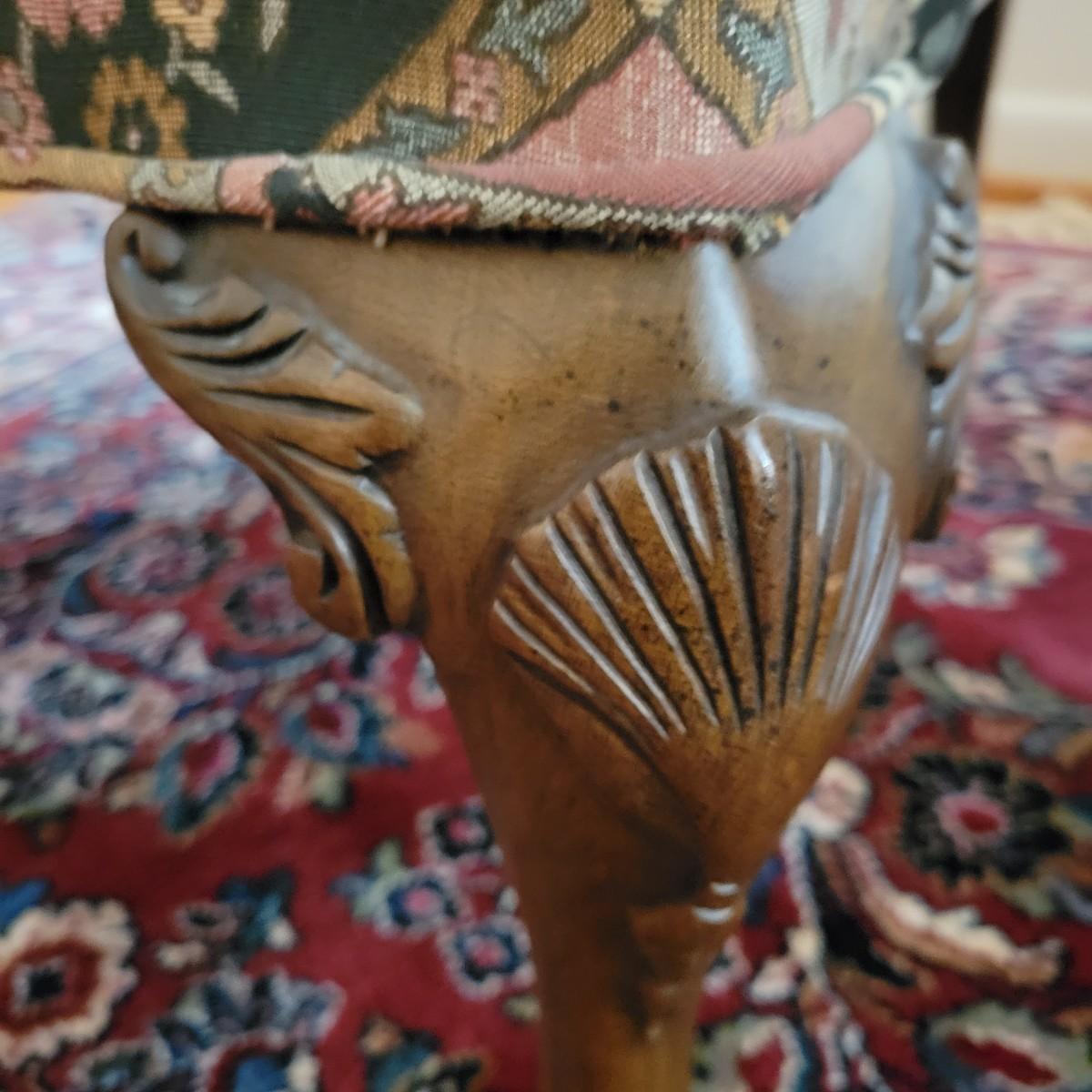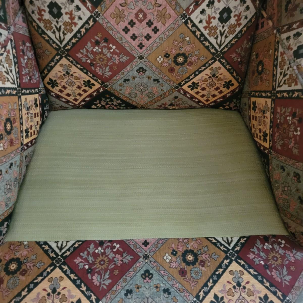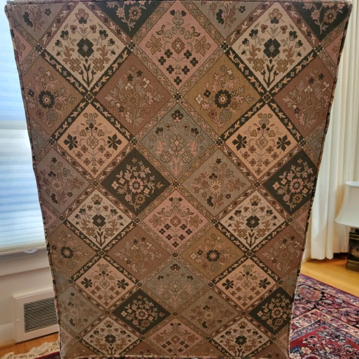 A pair of upholstered wingback armchairs in good condition with no notable damage. These chairs are upholstered with patchwork of floral patterns in a variety of colors and have carved wooden legs. Each chair measures approximately 32" x 30" x 42.5" and a seat height of 20". Winning bidder will need to bring assistance to move due to heaviness. Local pickup only