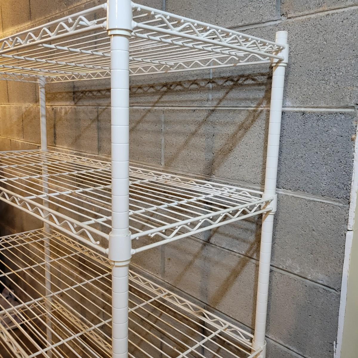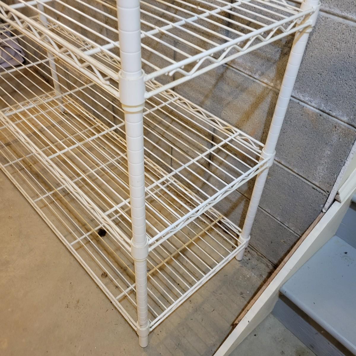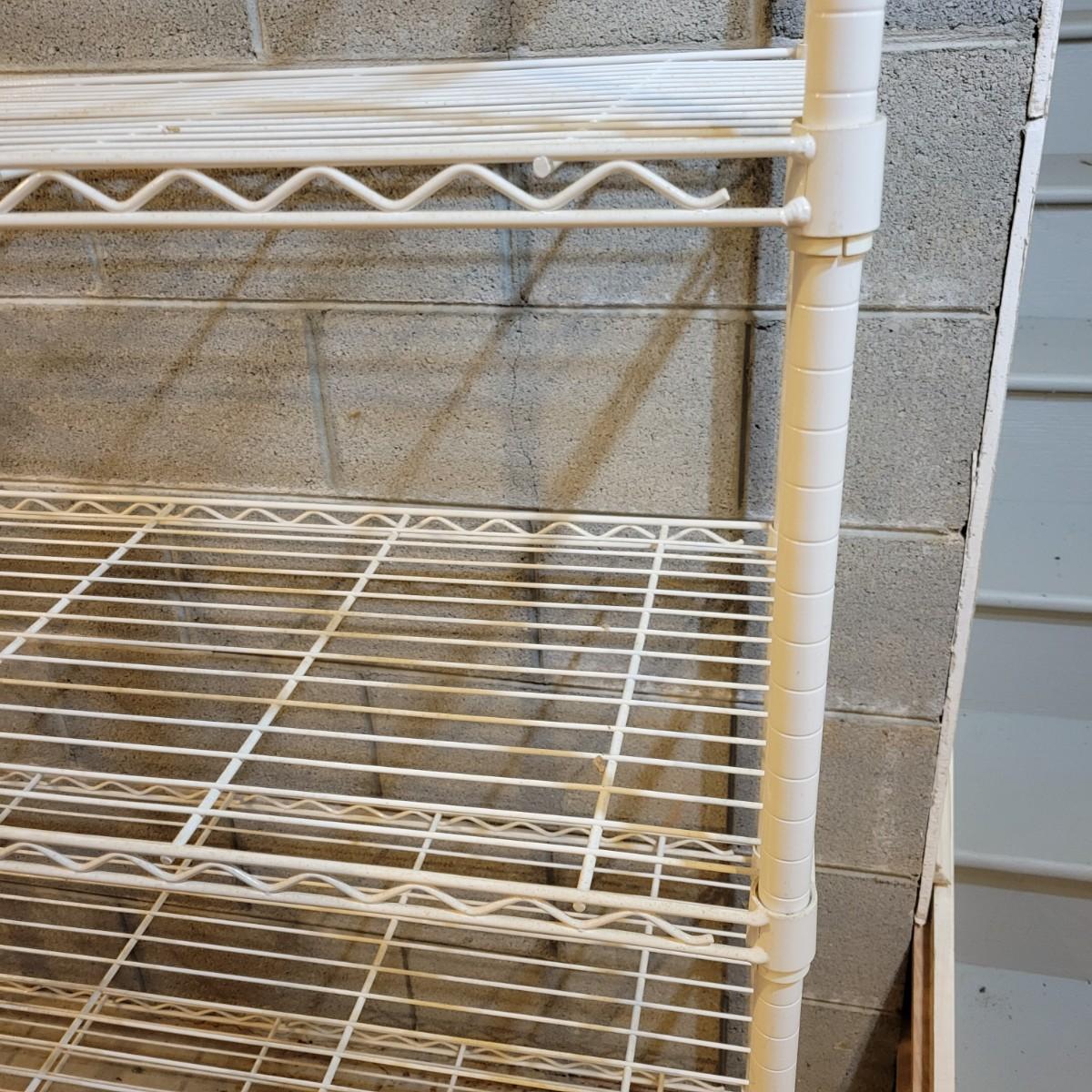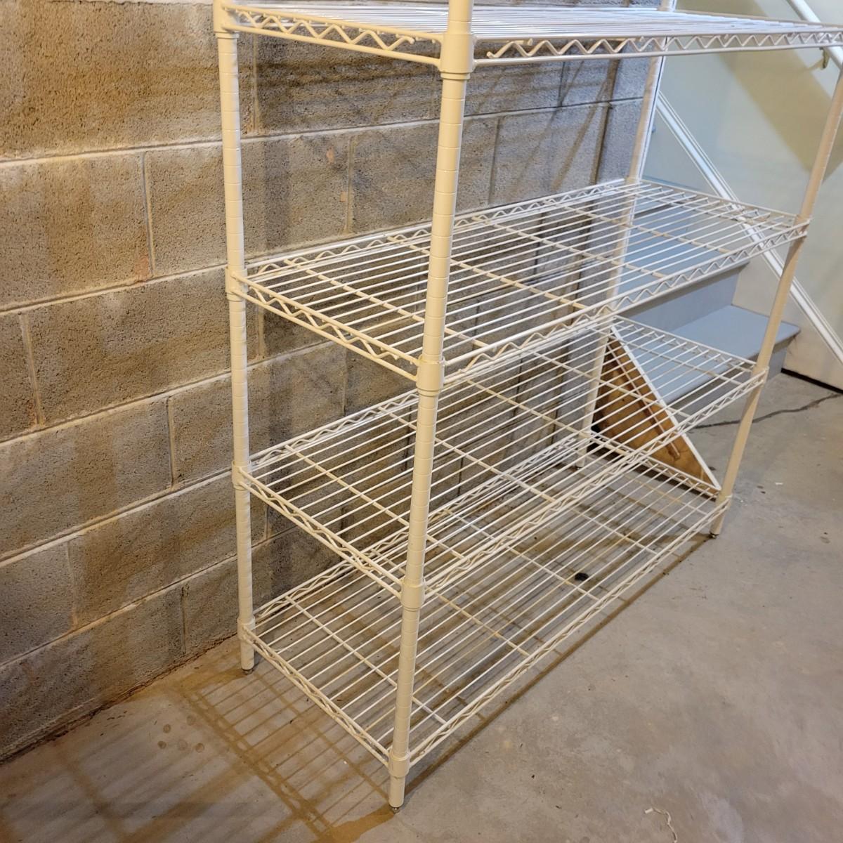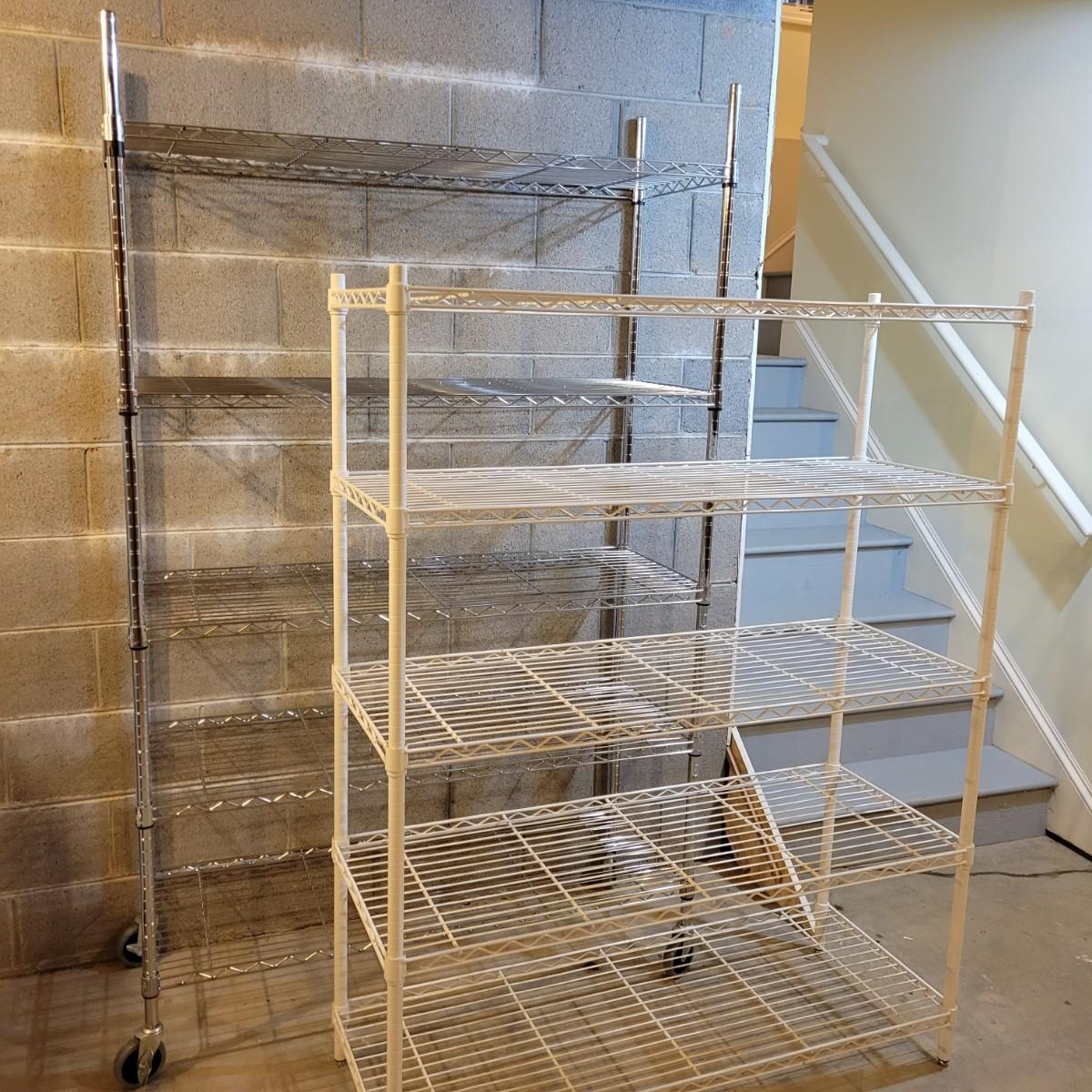 A pair of wire metal shelving units. The silver unit has five adjustable shelves, casters, and measures approximately 48" x 18" x 78"H. The white unit also has five adjustable shelves and measures approximately 48" x 18" x 62.5"H. Local pickup only