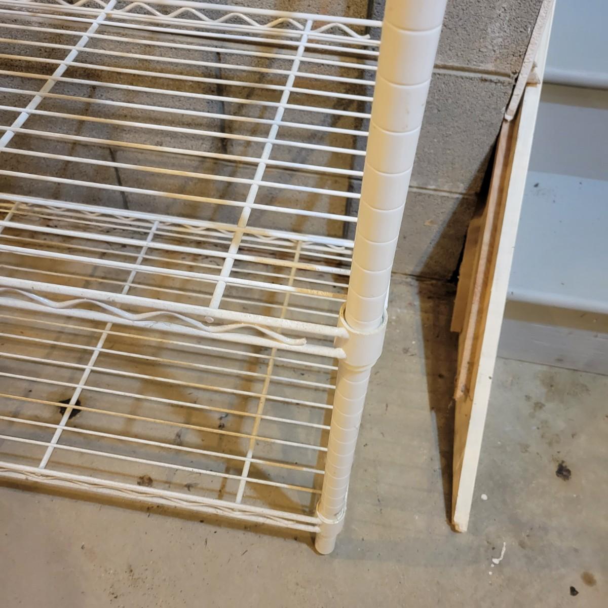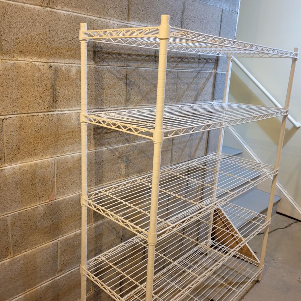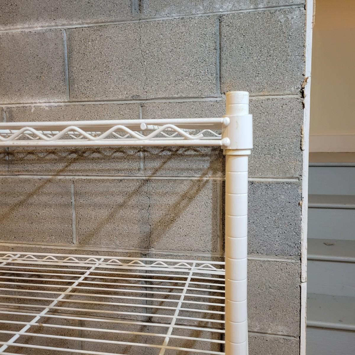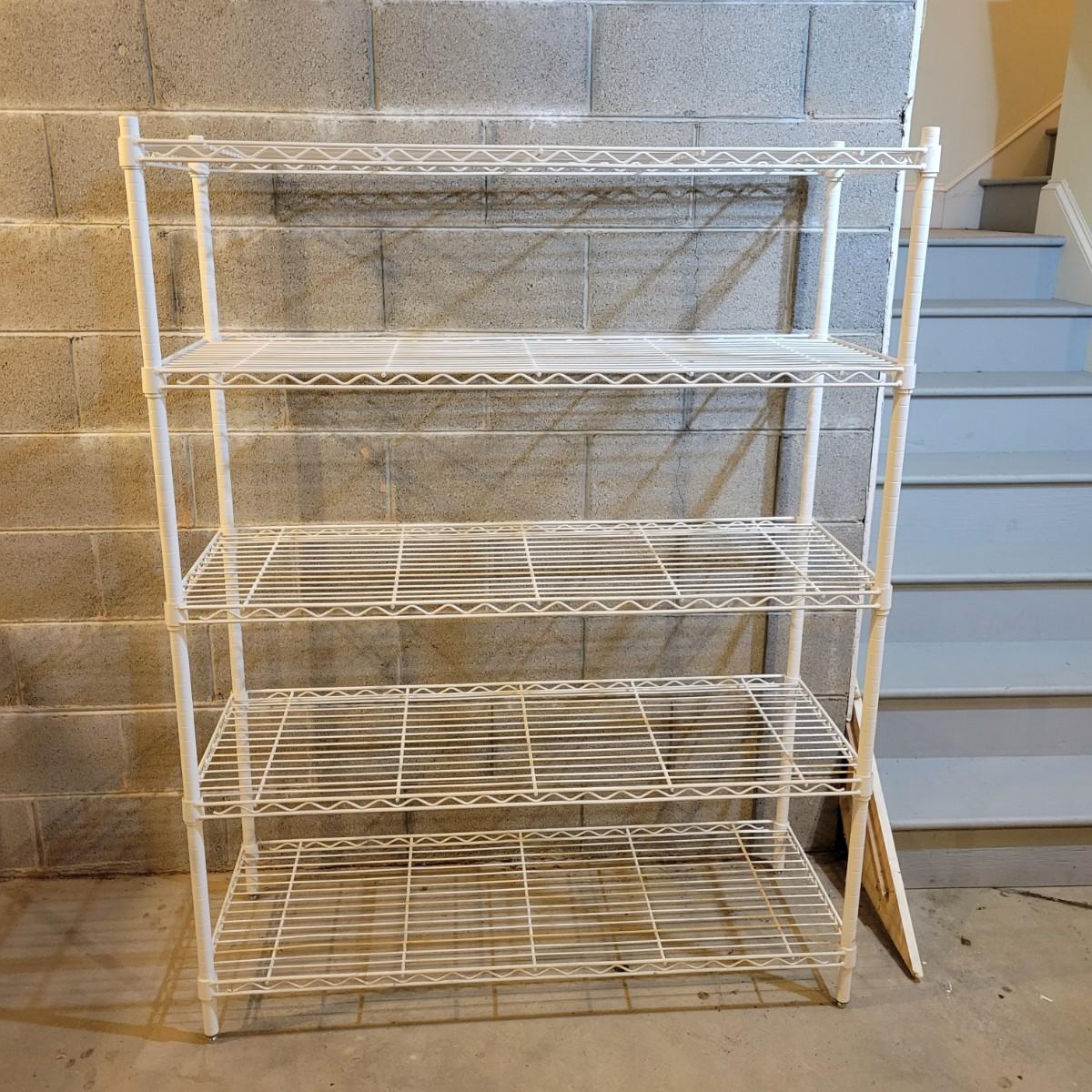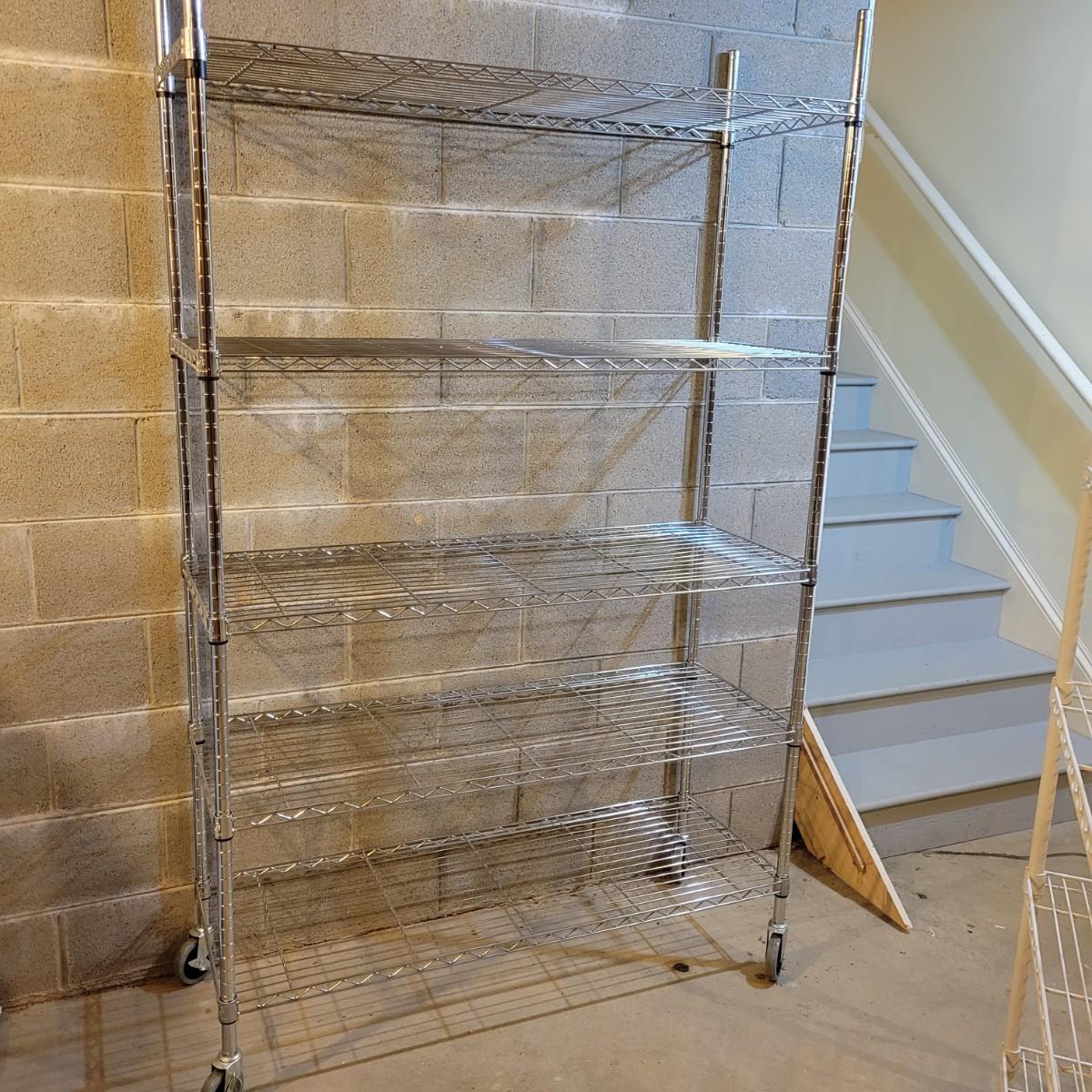 A pair of wire metal shelving units. The silver unit has five adjustable shelves, casters, and measures approximately 48" x 18" x 78"H. The white unit also has five adjustable shelves and measures approximately 48" x 18" x 62.5"H. Local pickup only