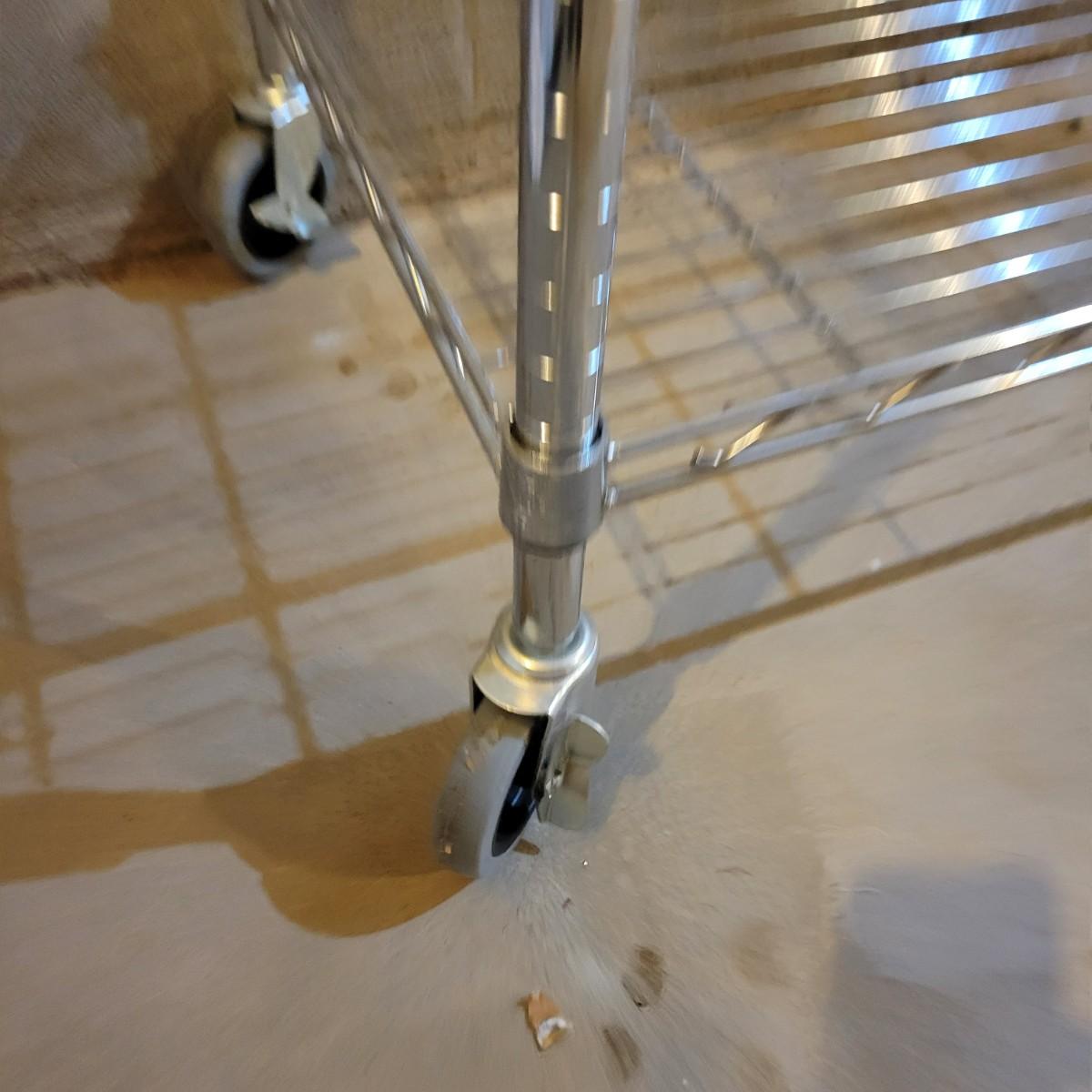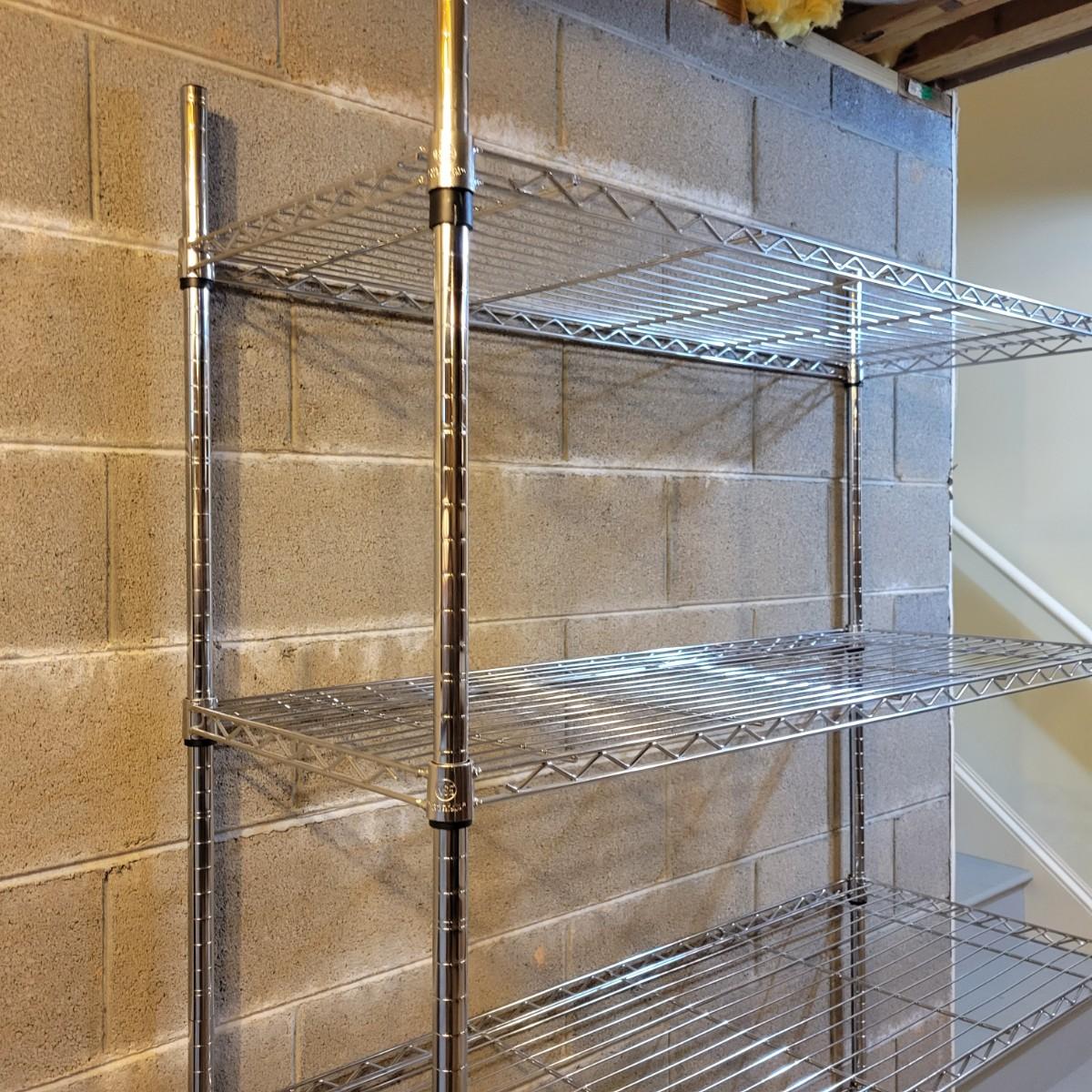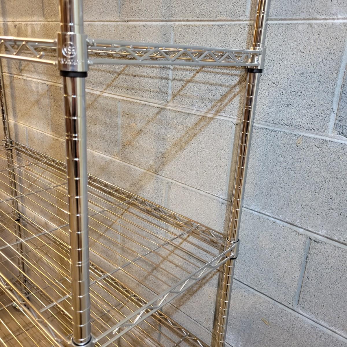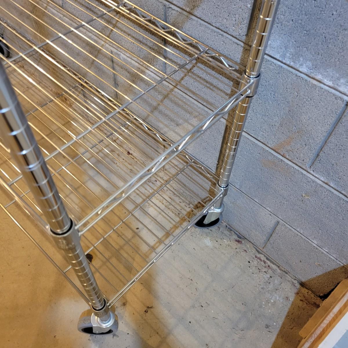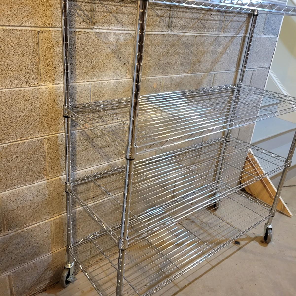 A pair of wire metal shelving units. The silver unit has five adjustable shelves, casters, and measures approximately 48" x 18" x 78"H. The white unit also has five adjustable shelves and measures approximately 48" x 18" x 62.5"H. Local pickup only