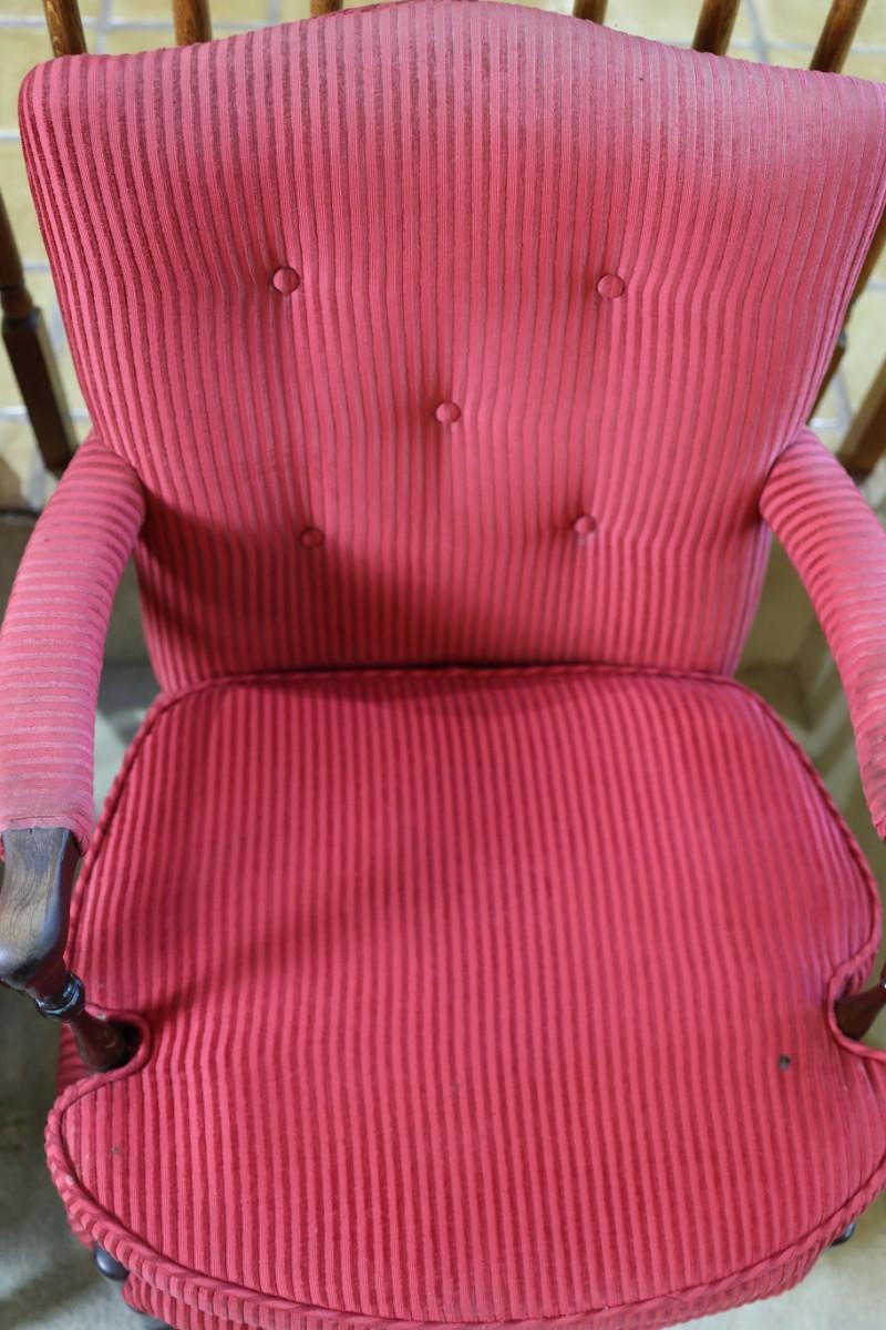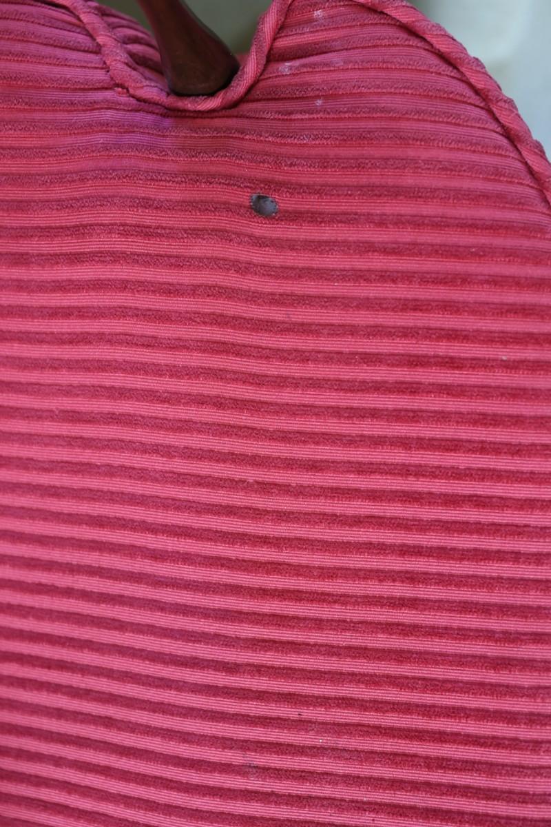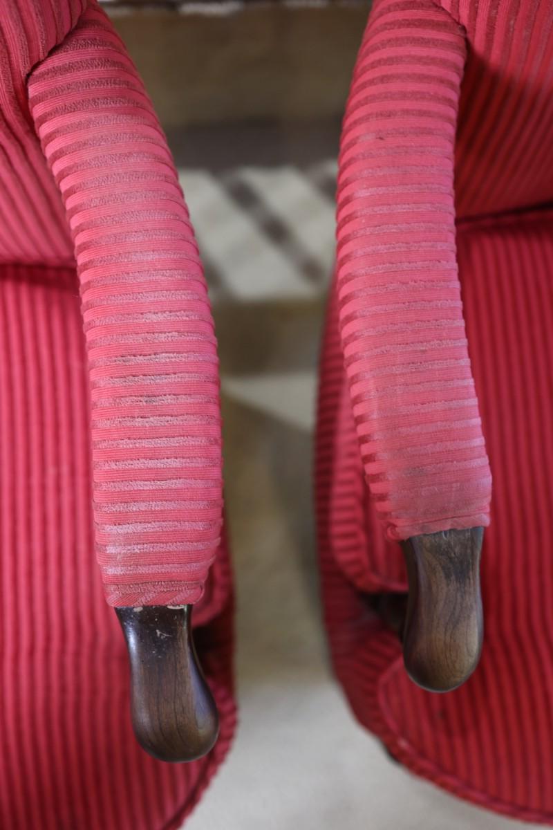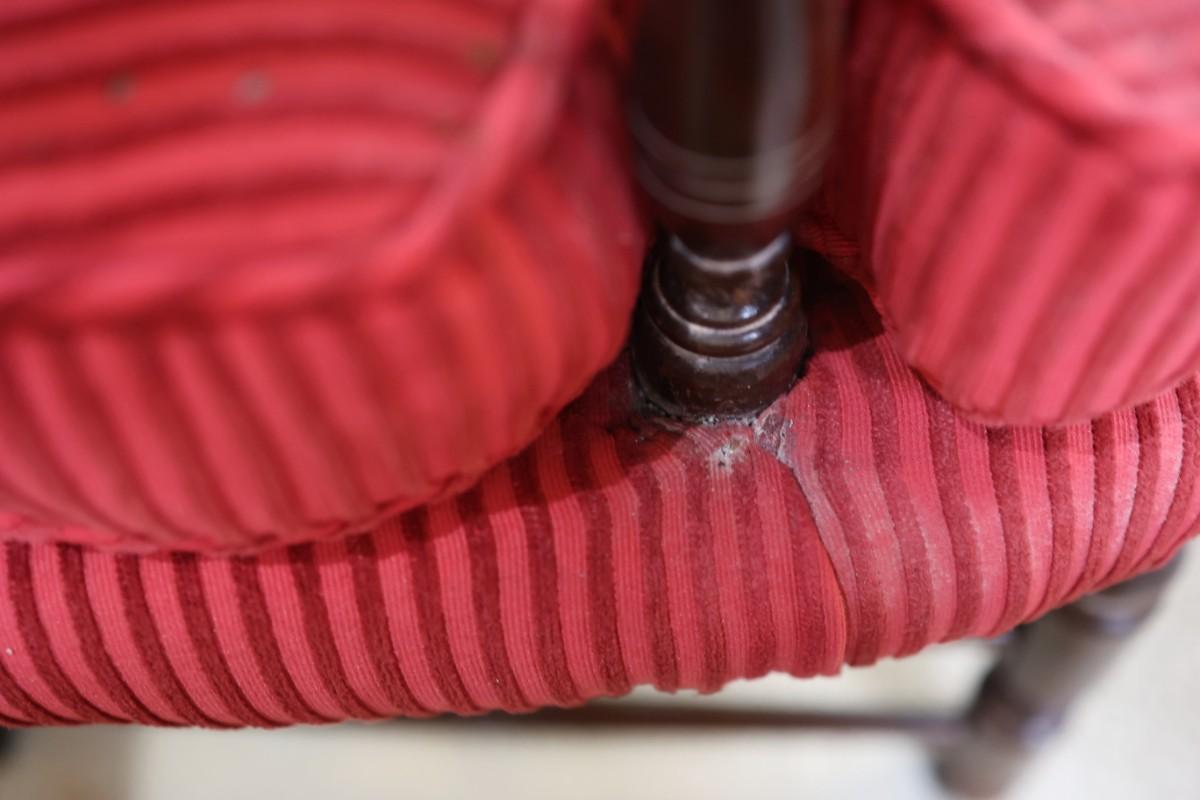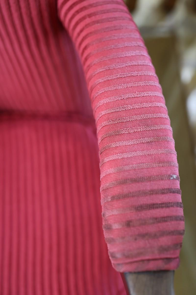 Beautiful solid wood legs and arms. The right chair has tiny holes in the cushion near the arm, pictured.