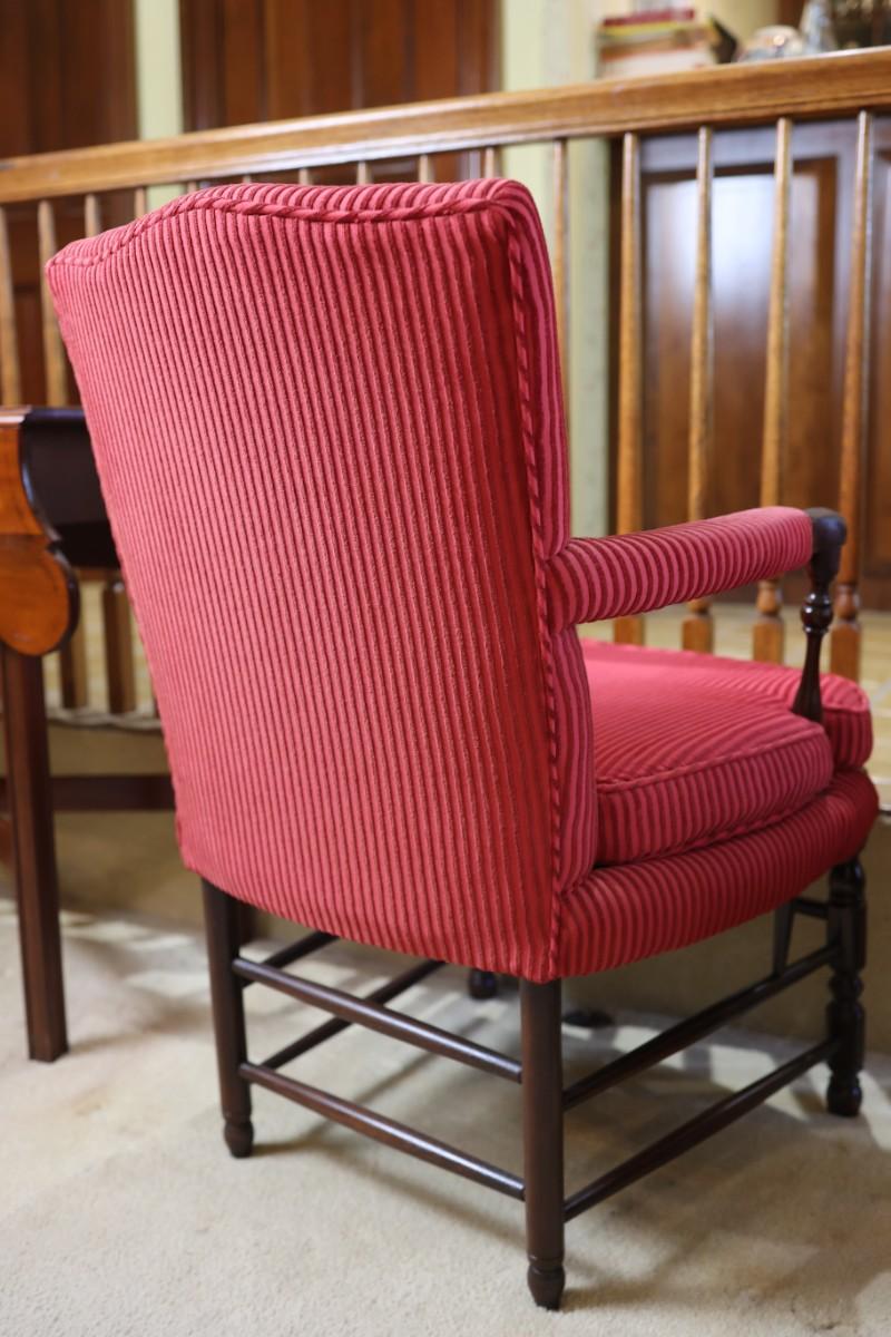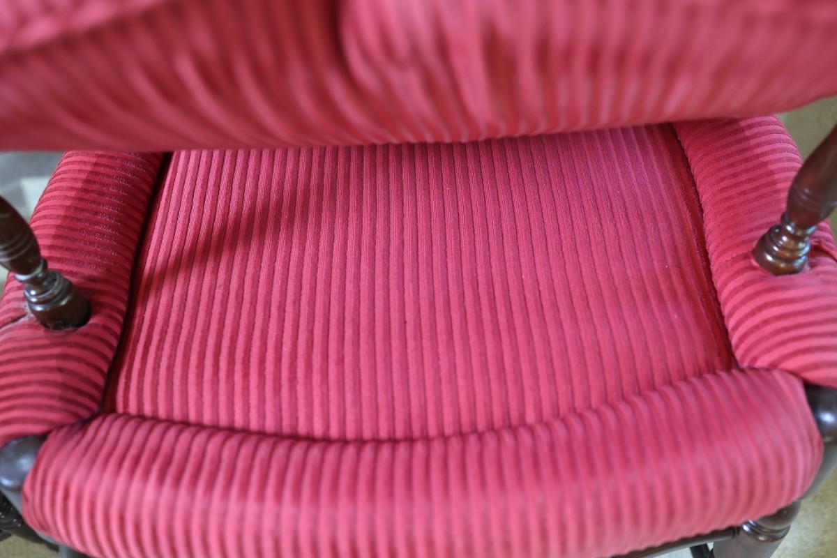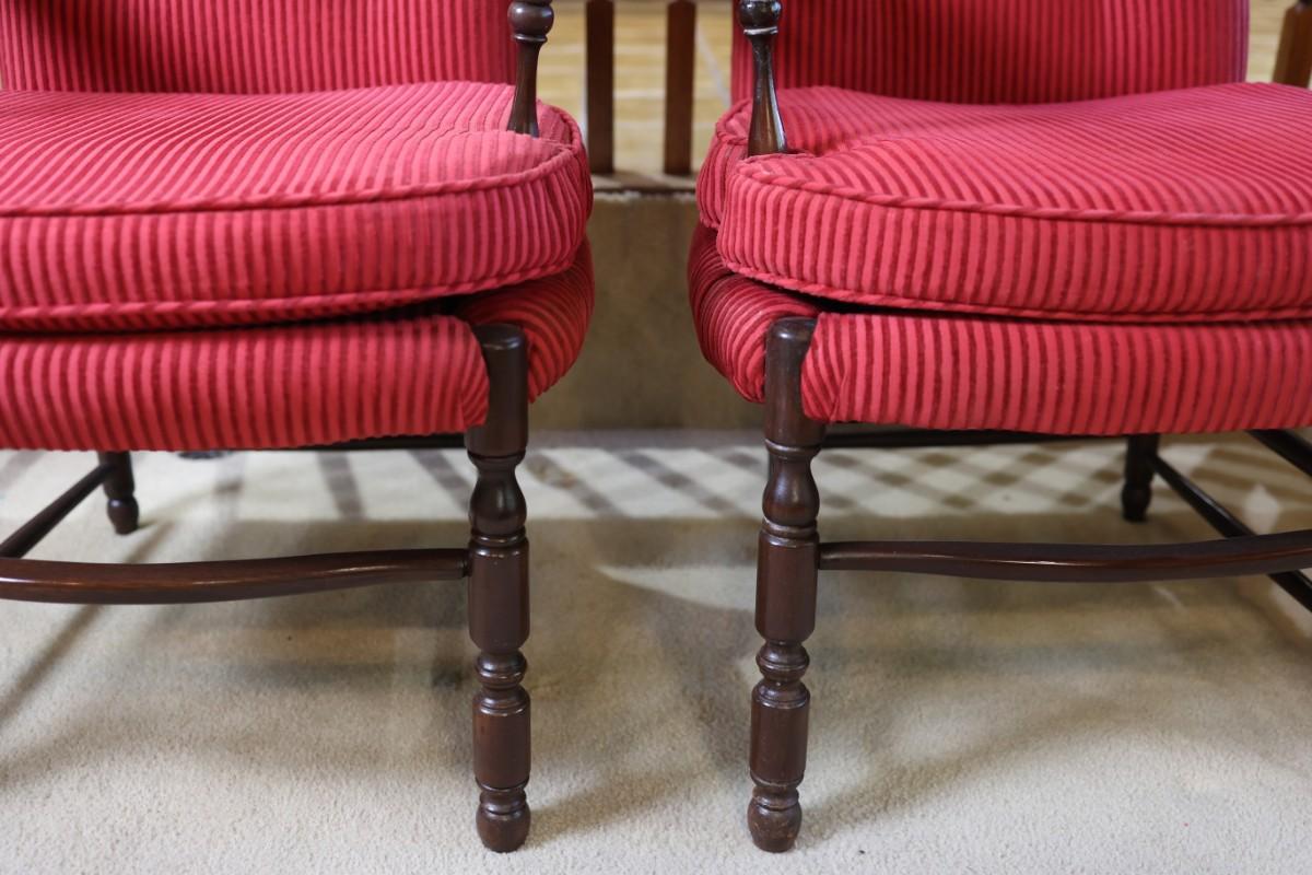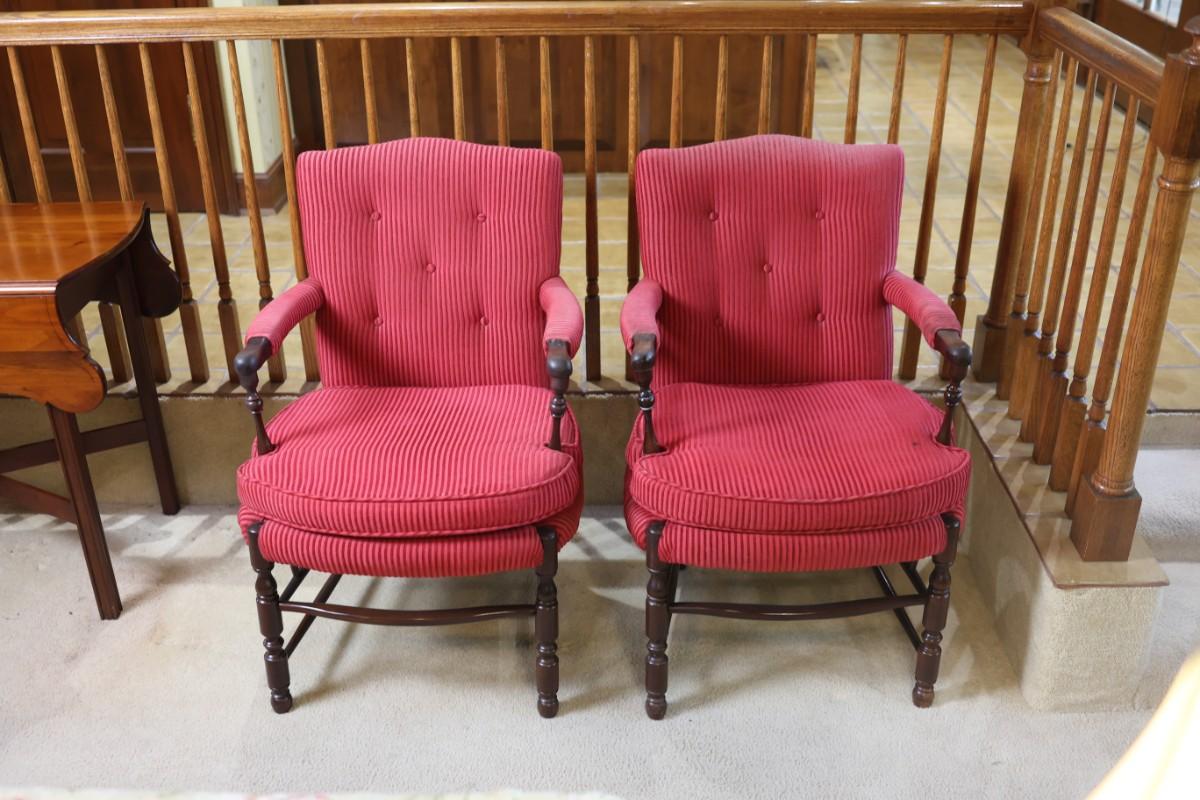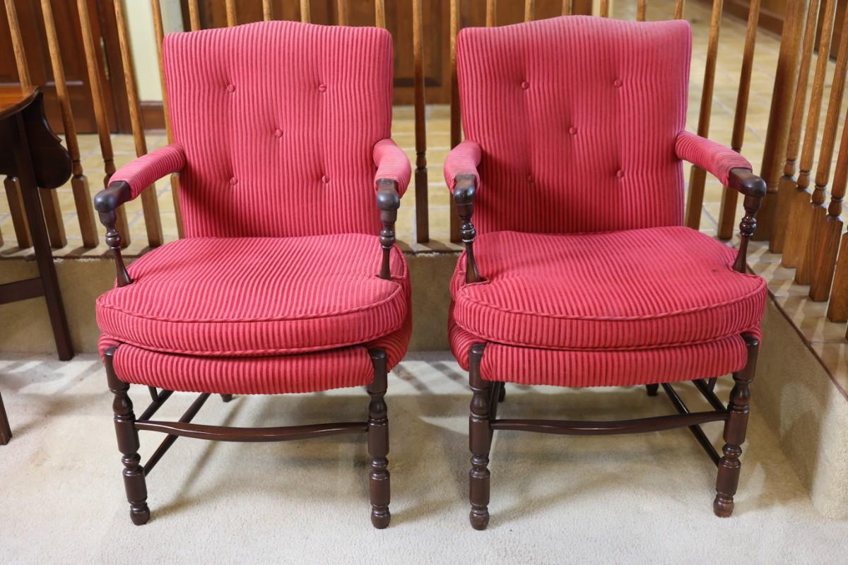 Beautiful solid wood legs and arms. The right chair has tiny holes in the cushion near the arm, pictured.