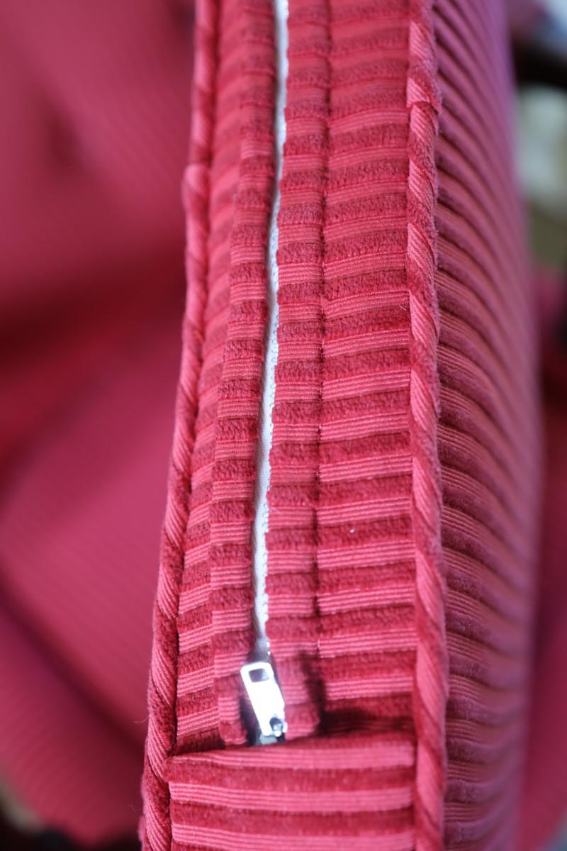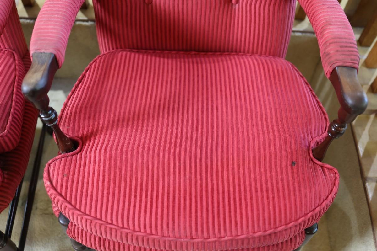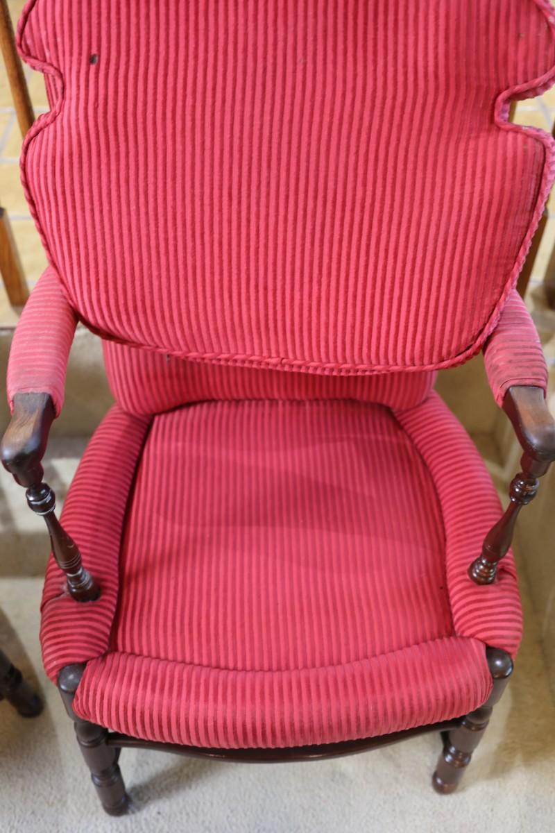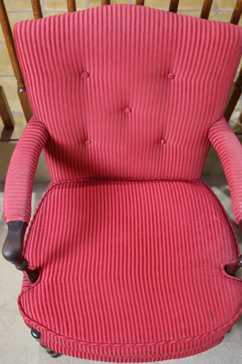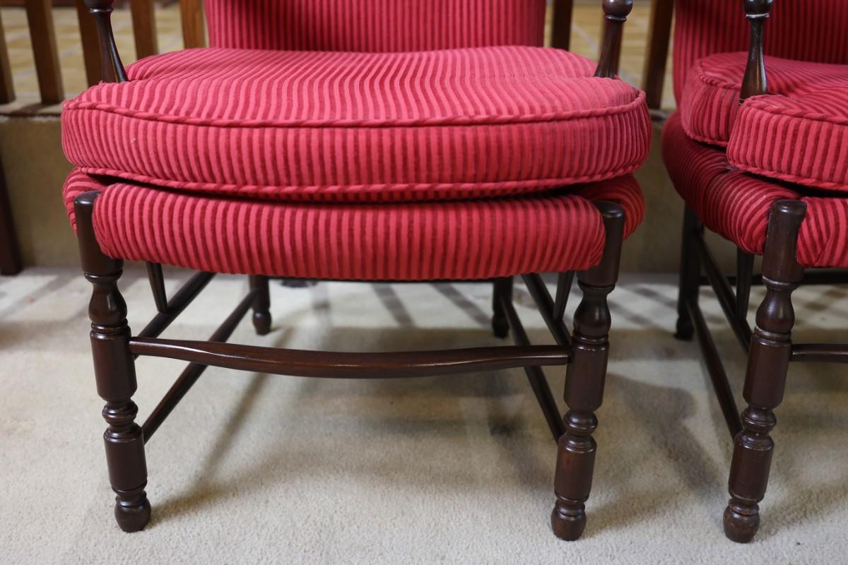 Beautiful solid wood legs and arms. The right chair has tiny holes in the cushion near the arm, pictured.